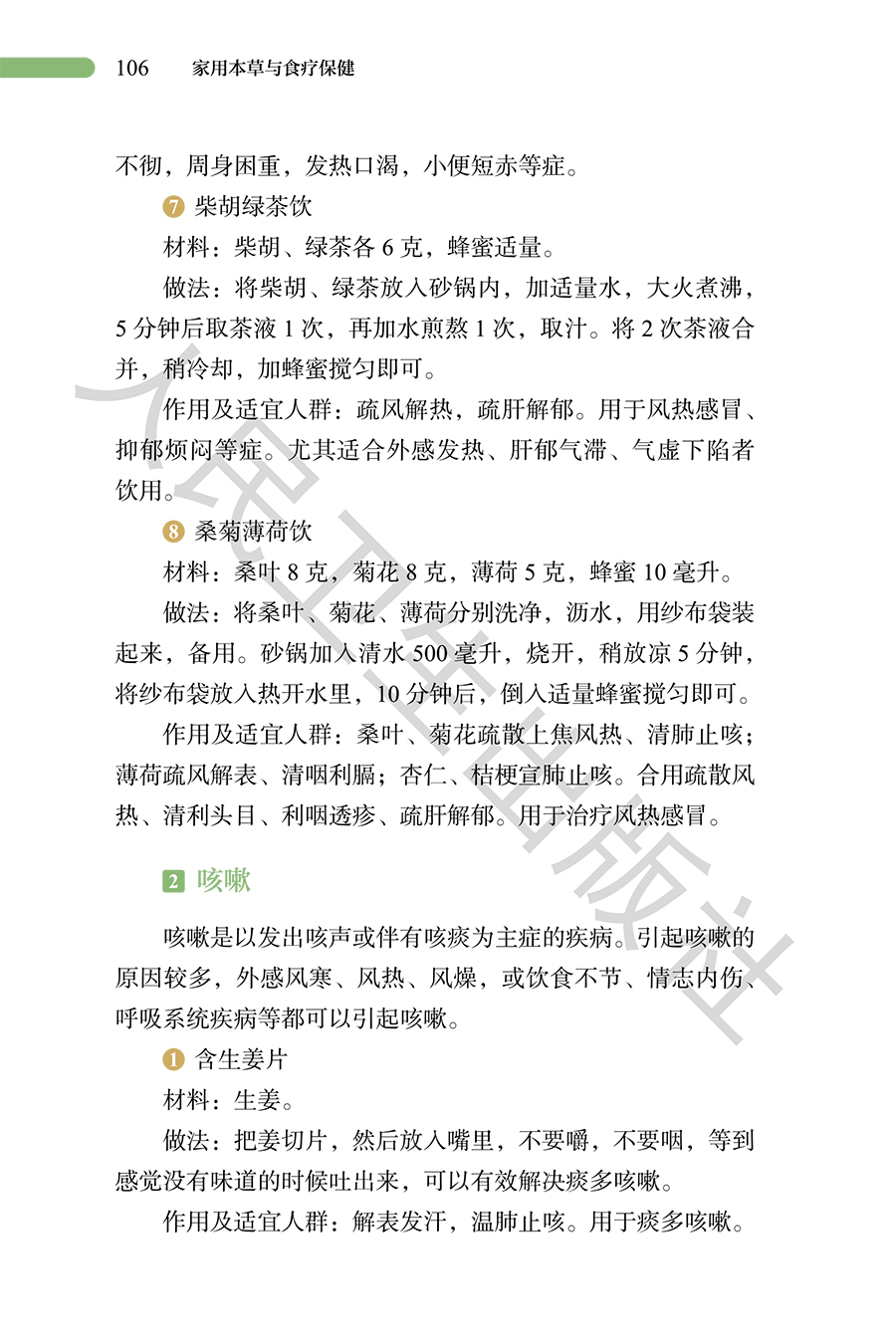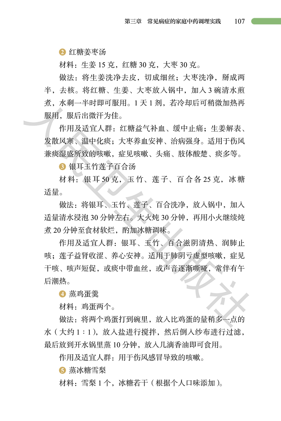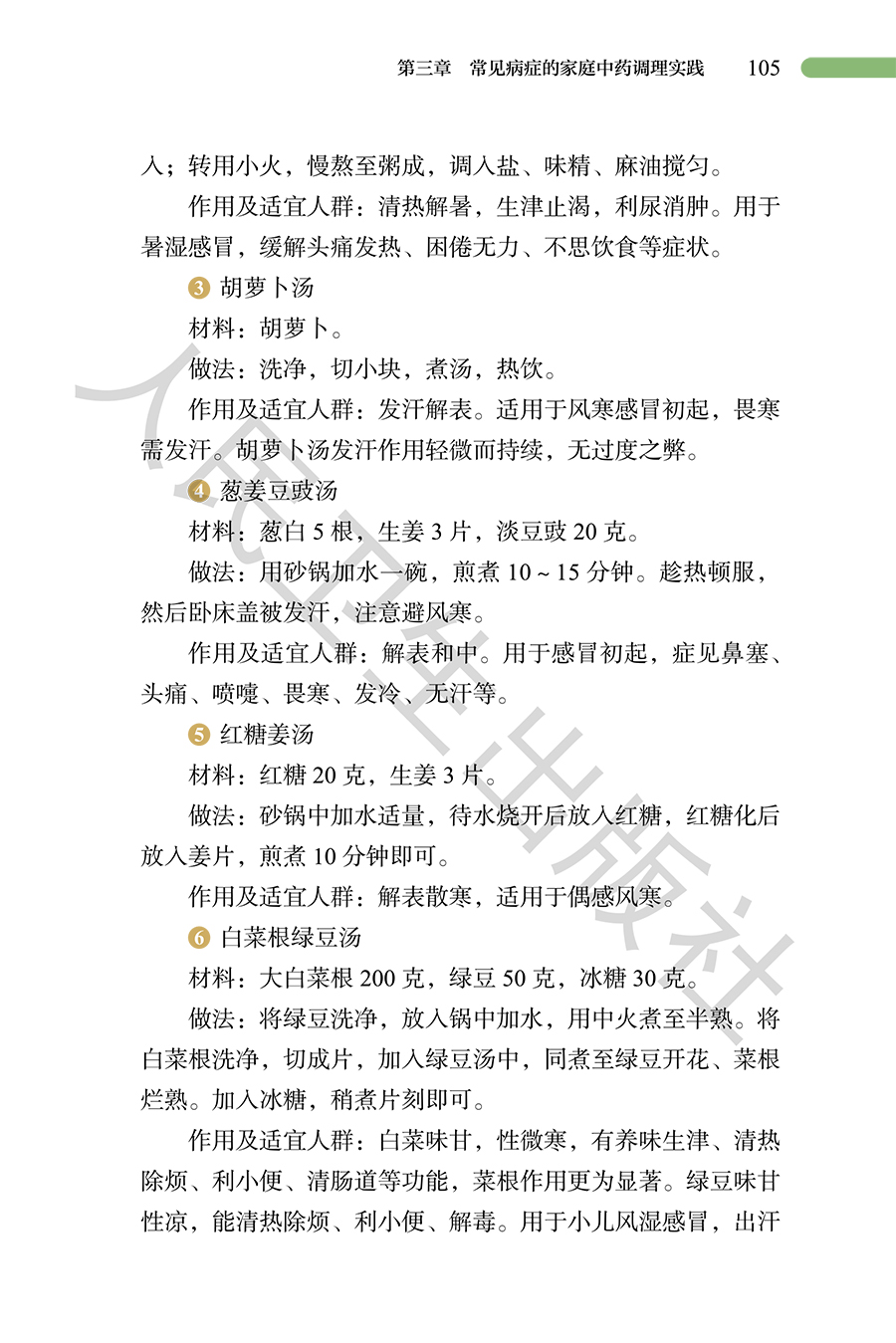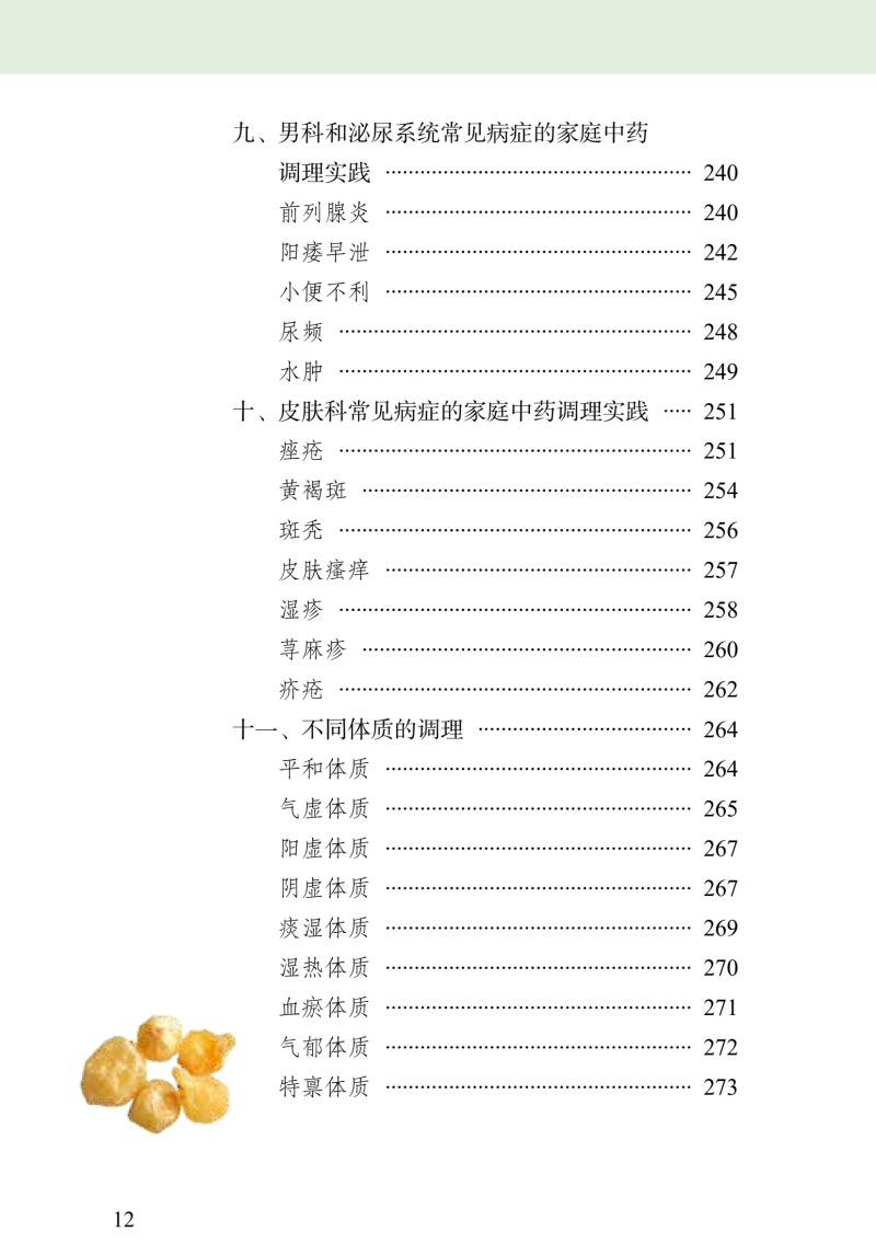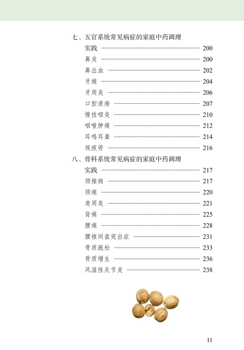 全书共分三章,第一章主要介绍中医的阴阳、五行、脏腑、经络、病因、病机、治则、治法、整体观念和辨证论治理论以及药物的四气五味、升降沉浮、功效归经、配伍禁忌等知识,让读者认识到药食同源中药材不仅具有滋养身体的作用,还能调理身体机能,达到防治疾病的效果。第二章主要针对该目录发布的更新文件中所涉及的药食同源品种,按照根、叶、种子、花、果实、茎、全草等十七大类,以补益药、解表药、清热药、温里药、理气药、消食药、止咳平喘药为主,总计约100种,以图文并茂形式对其产地、采收、炮制、功能、主治等进行详细讲述。第三章主要是常见症状的家庭中药调理实践,从呼吸、心脑血管、消化、内分泌、神经、皮肤、骨科、妇科等系统、科别和体质方面的近百个家庭常见病症中,介绍了药食同源的粥、汤、茶等调理方案和经验,帮助大家食养调理,恢复健康。
