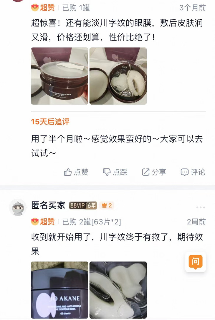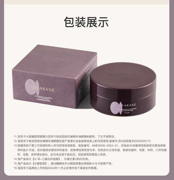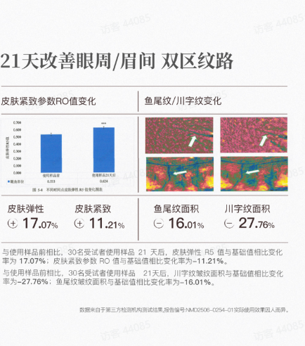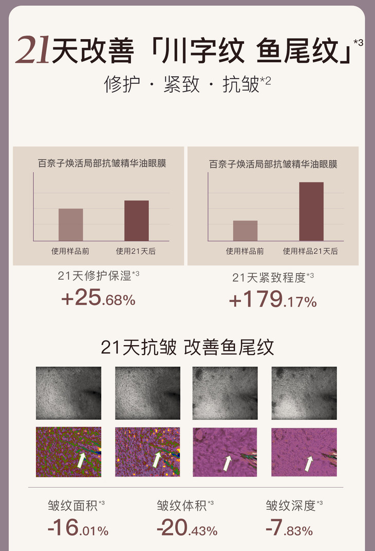 测试数据 使用百奈子二部曲胶原眼膜21天后, 鱼尾纹-16.01%,川字纹-27.76%,皮肤弹性+17.07%,皮肤紧致+11.21%