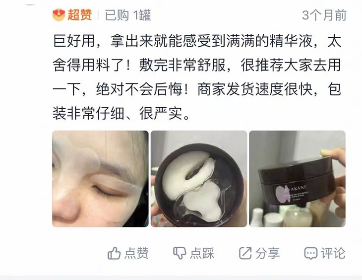 最惊喜的是精华油质地,看着是油润挂, 实则轻薄得像丝绸,敷15分钟全被眼周“吃”进去, 揭下来摸着又软又弹,一点不黏腻, 后续叠涂眼霜也不搓泥,懒人爱惨这免洗设计。