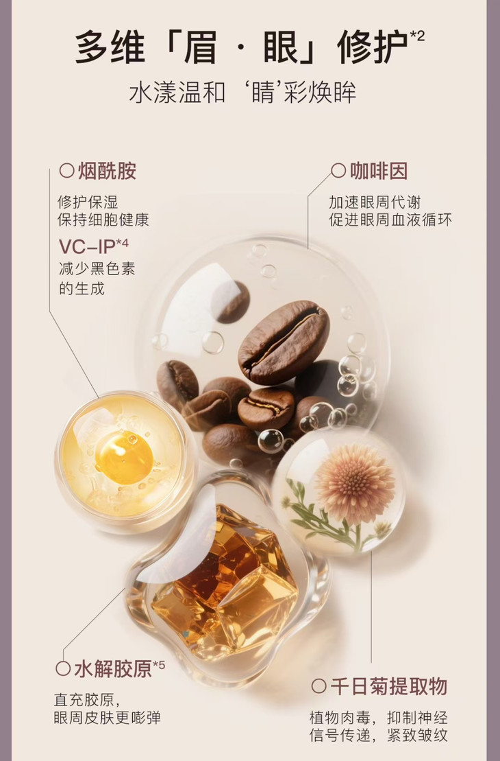 【一贴提拉紧致,以胶原养胶原】 胶原+植物肉毒 ·胶原 ·千日菊提取物,又称植物肉毒, 改善川字纹,眼周细纹,紧致肌肤 【双重焕亮,改善眼周泡泡眼】 咖啡因+烟酰胺+vc-ip 咖啡因促进眼周血液循环,消肿。 烟酰胺+vc-ip改善眼周黑色素沉积