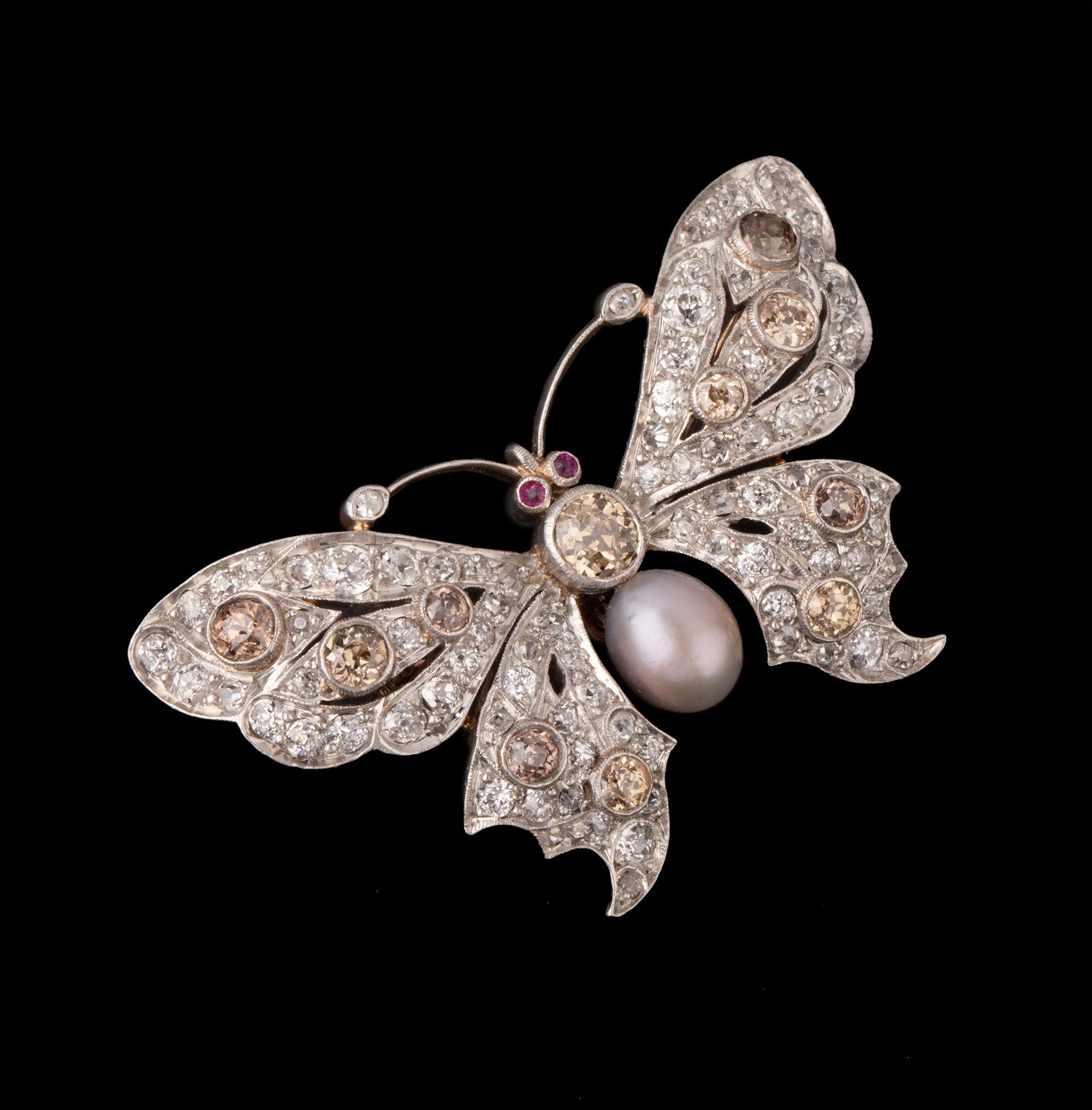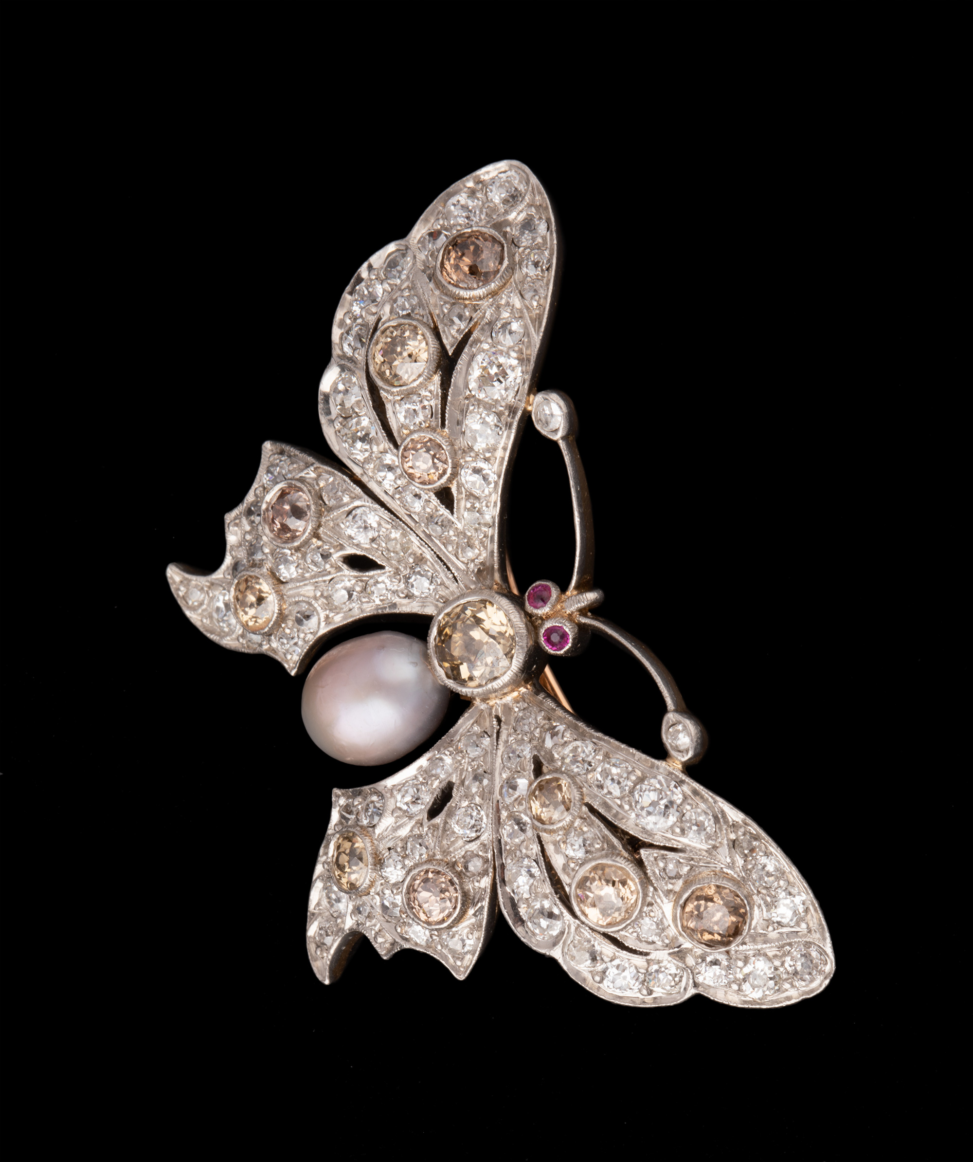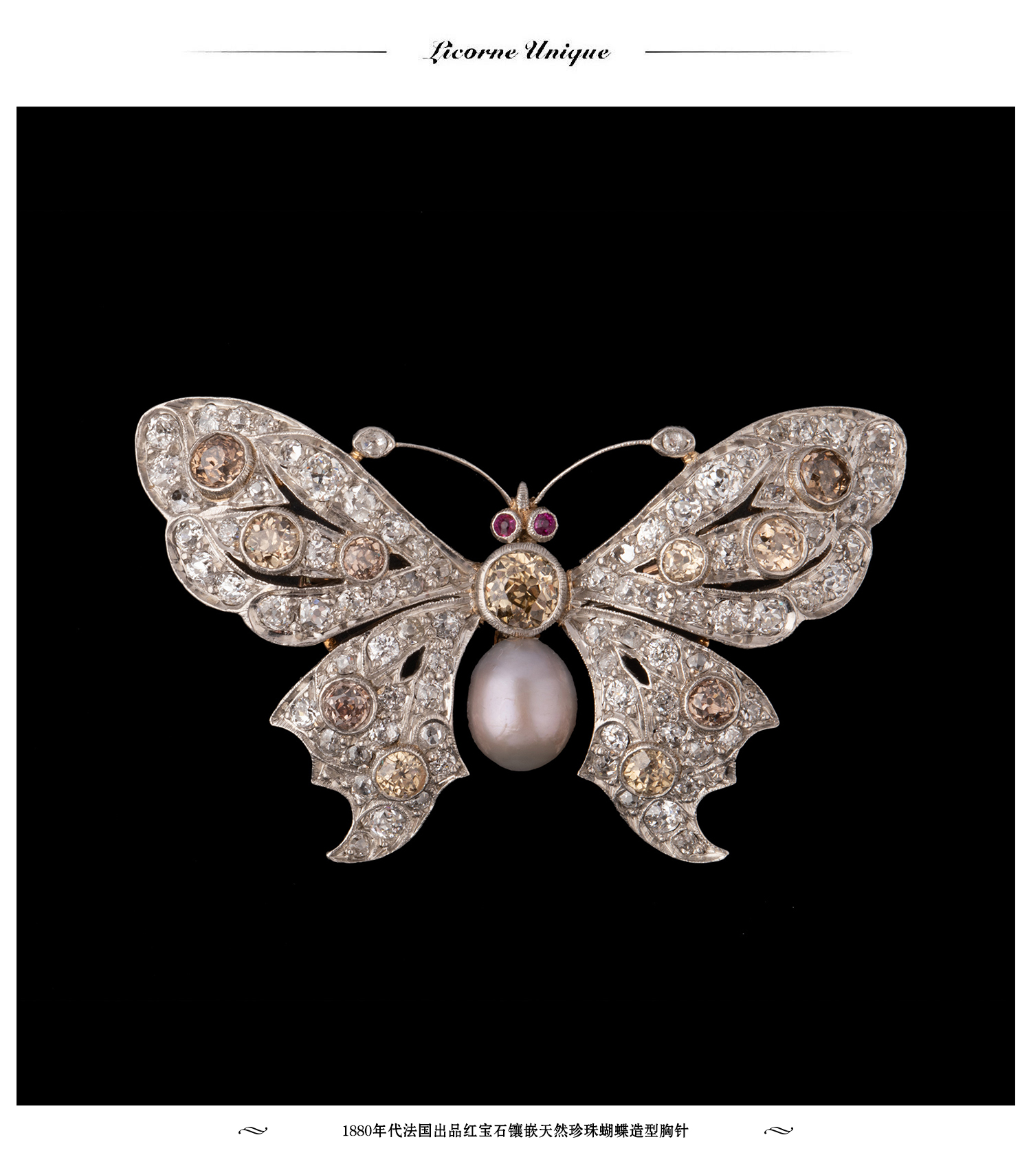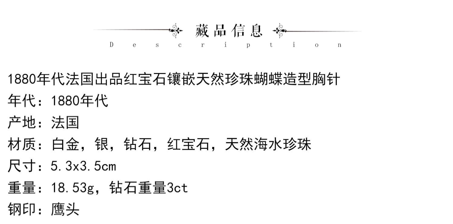 独角鹿西洋古董珠宝首饰法国出品红宝石镶嵌天然珍珠蝴蝶造型胸针