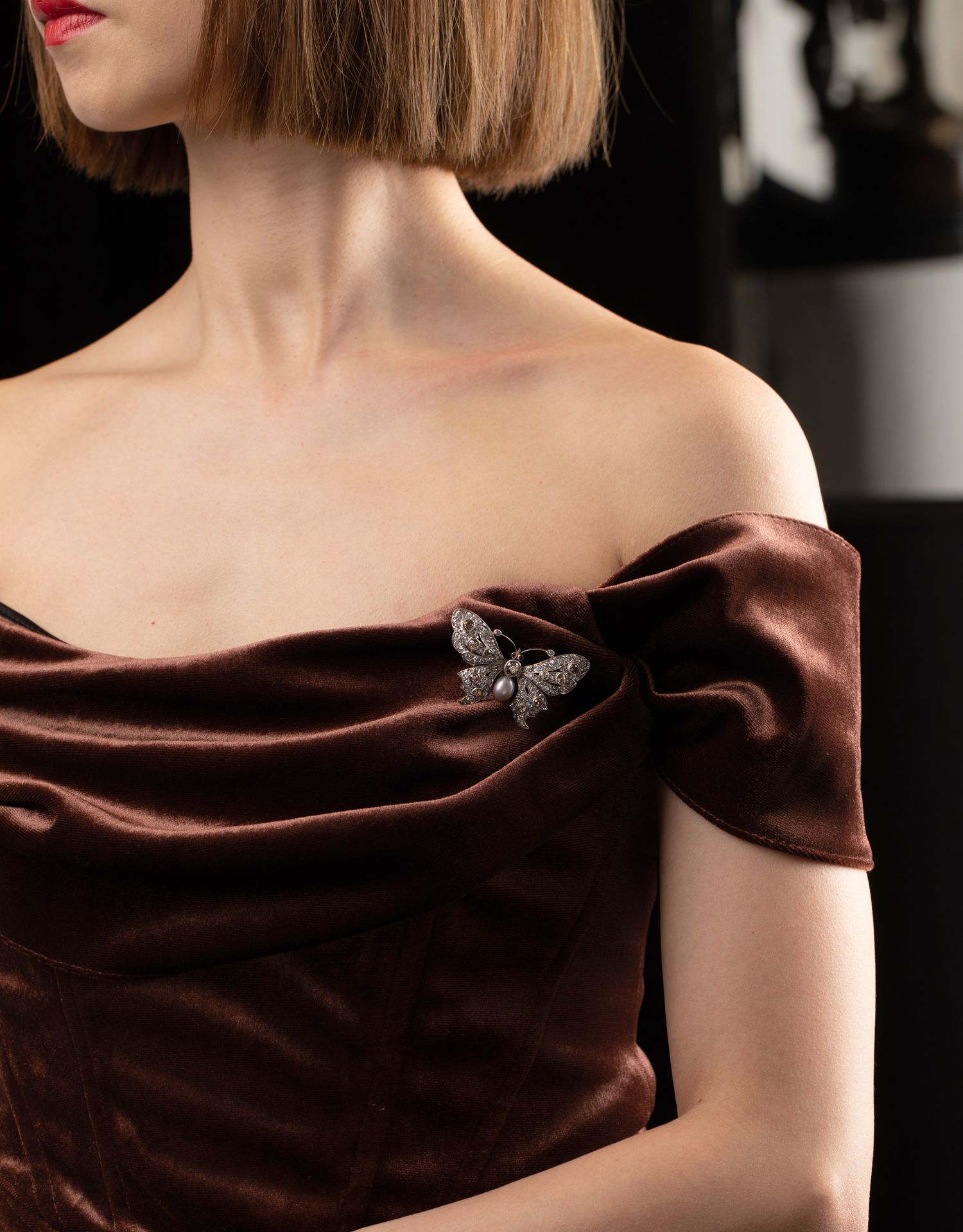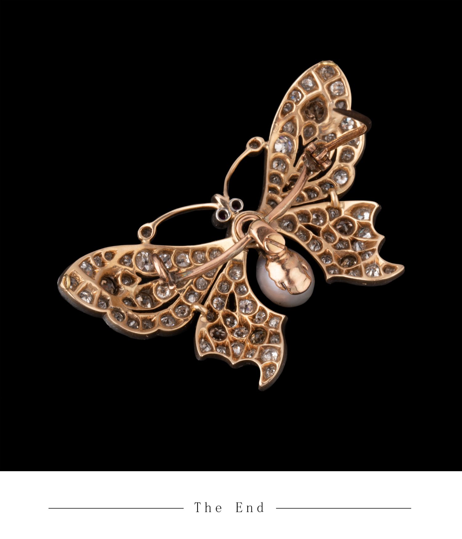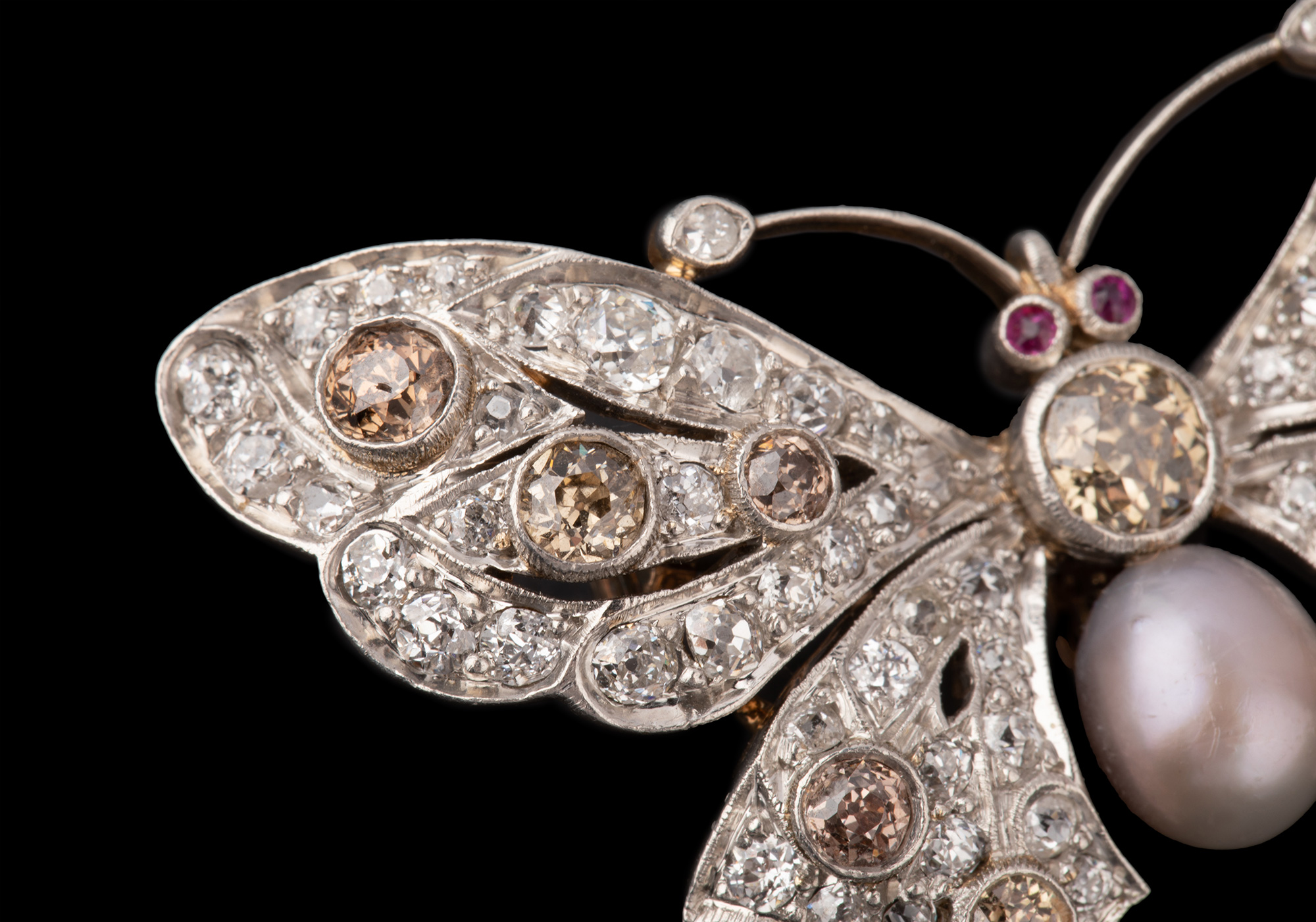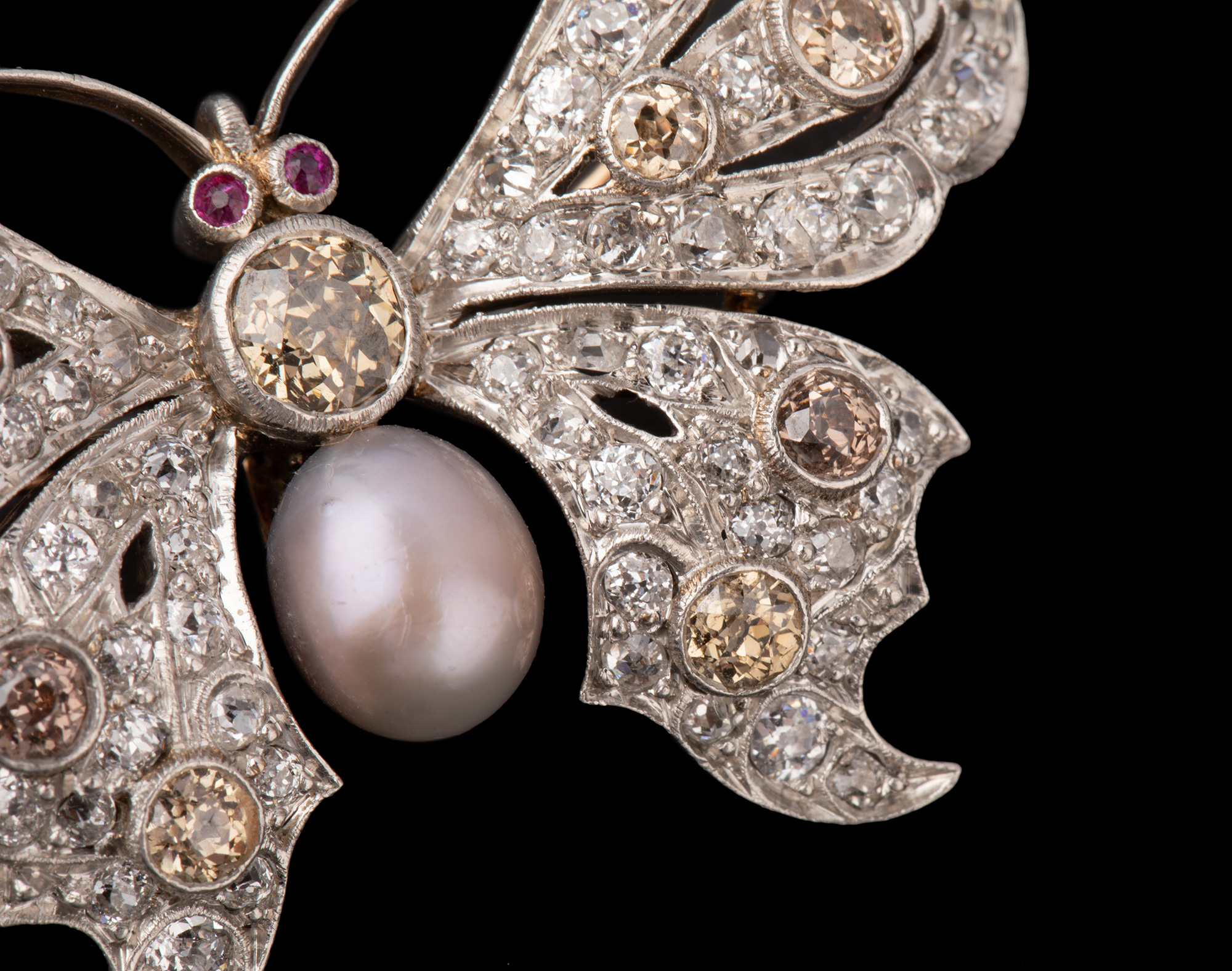 独角鹿西洋古董珠宝首饰法国出品红宝石镶嵌天然珍珠蝴蝶造型胸针