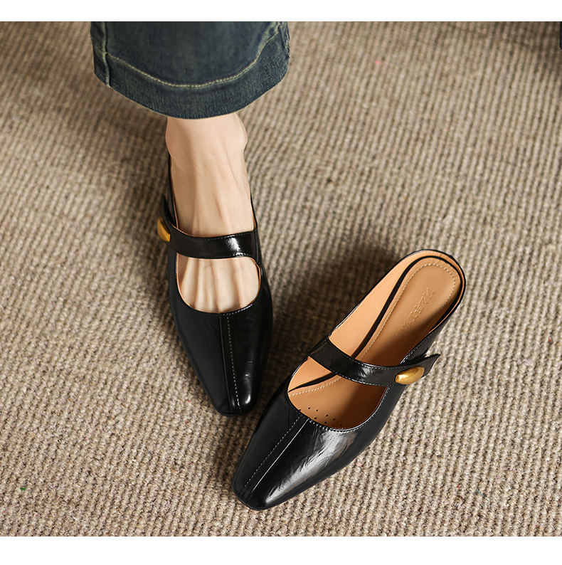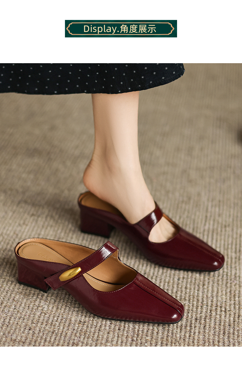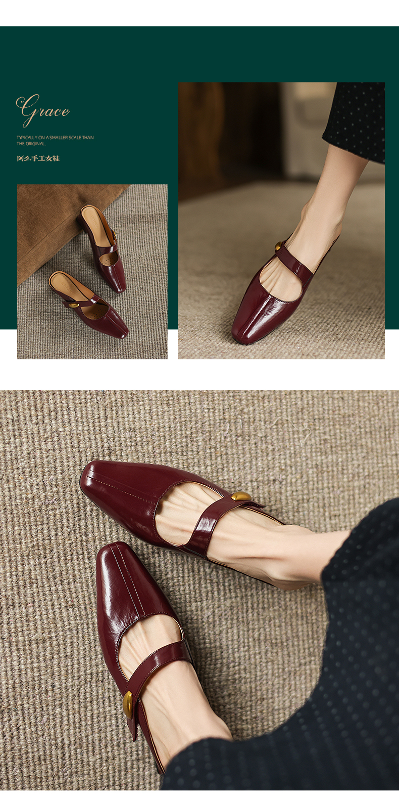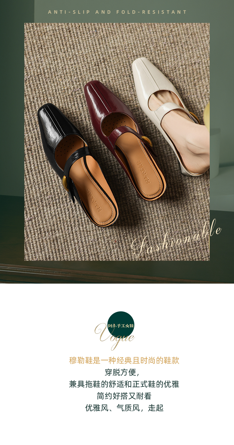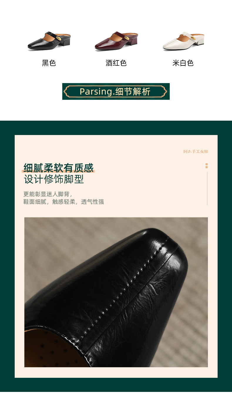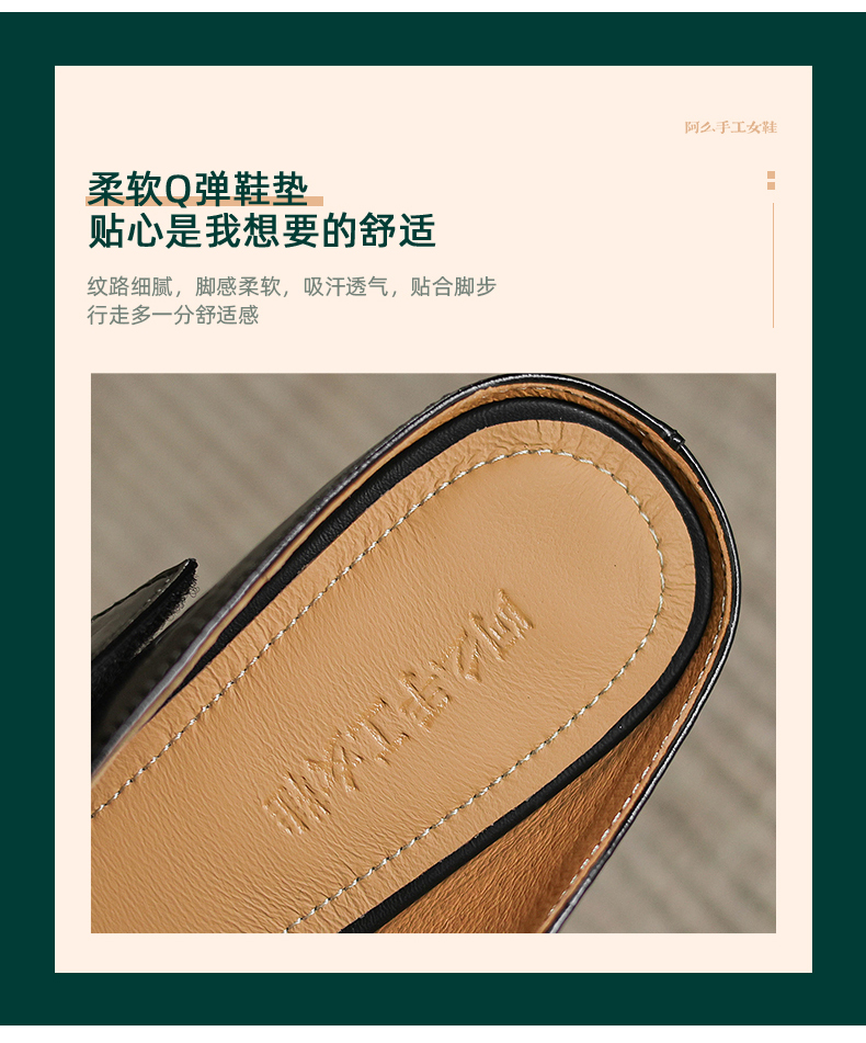 阿么手工女鞋粗跟一字带穆勒拖鞋夏季小方头复古风浅口包头拖4CM