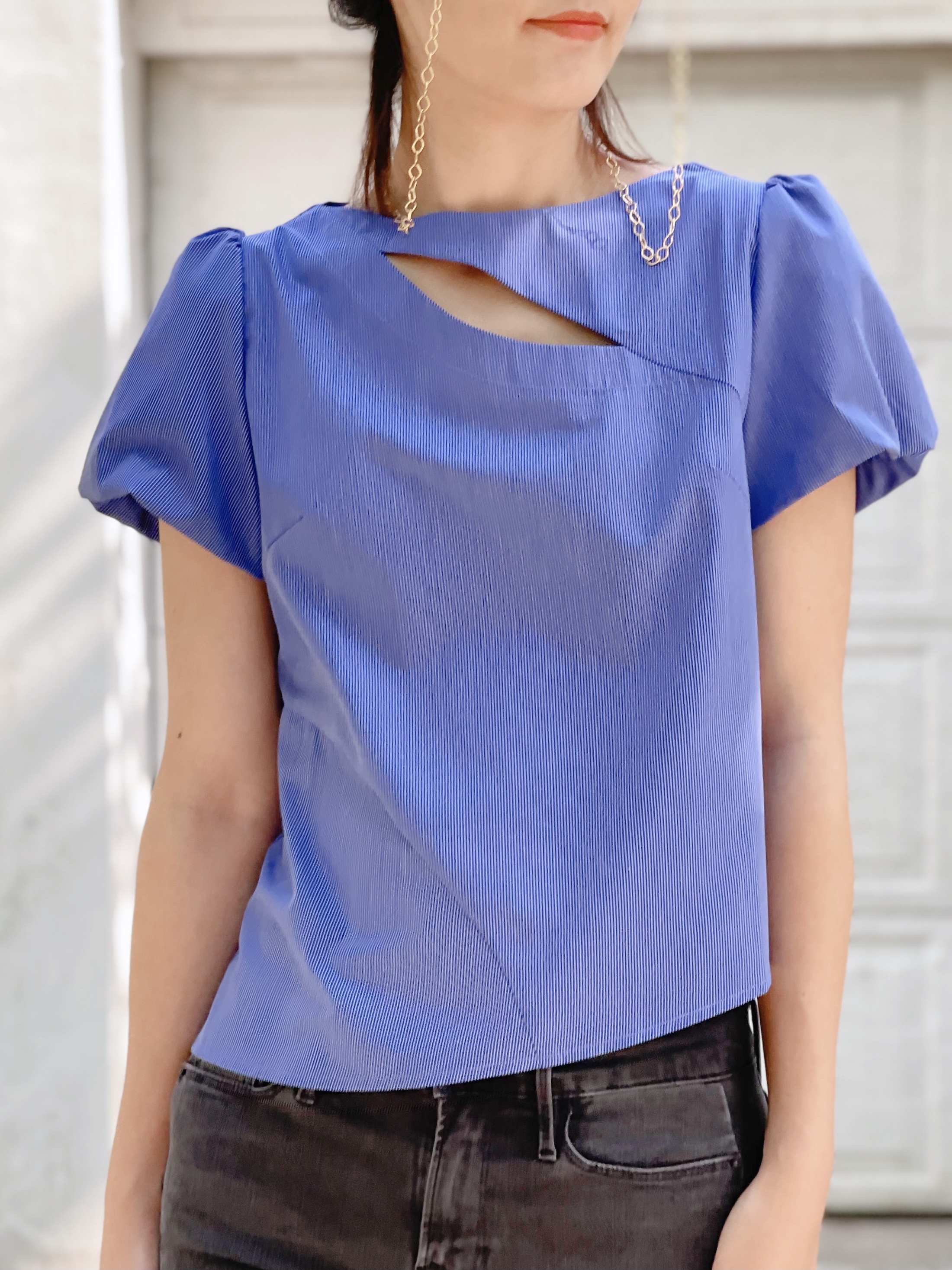 TYNVIE 开口设计不对称短袖上衣-蓝白条纹