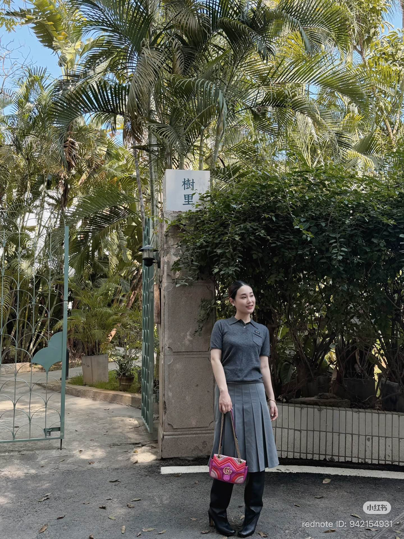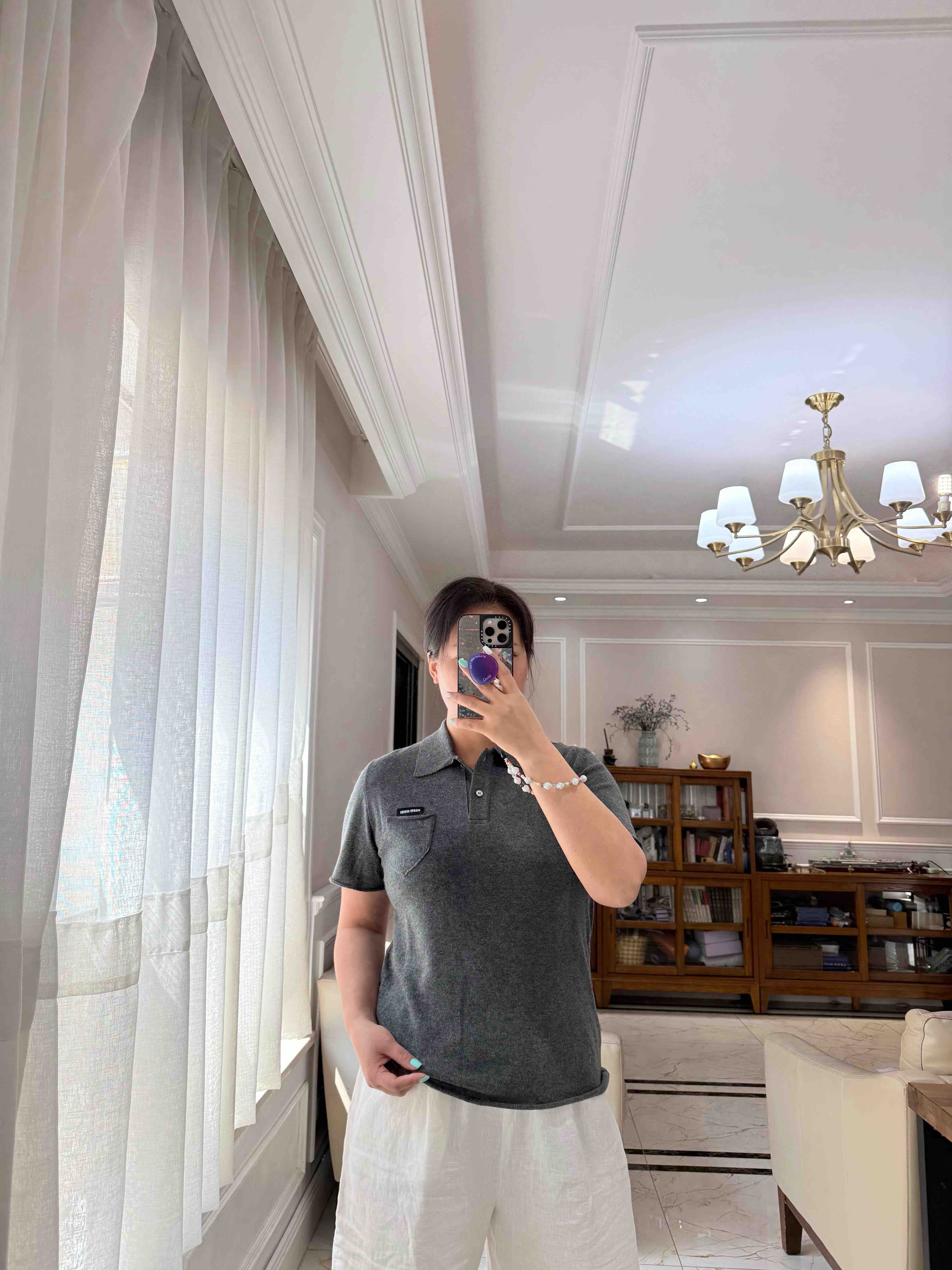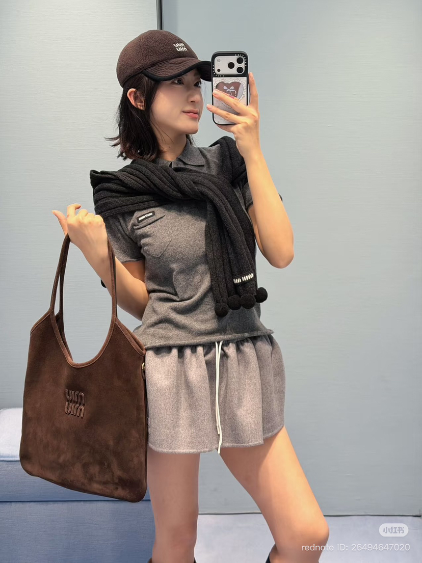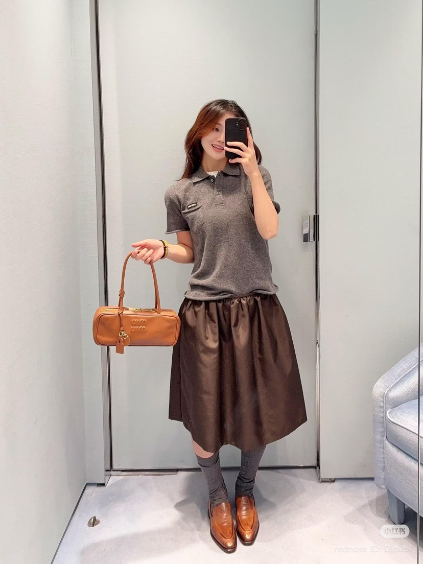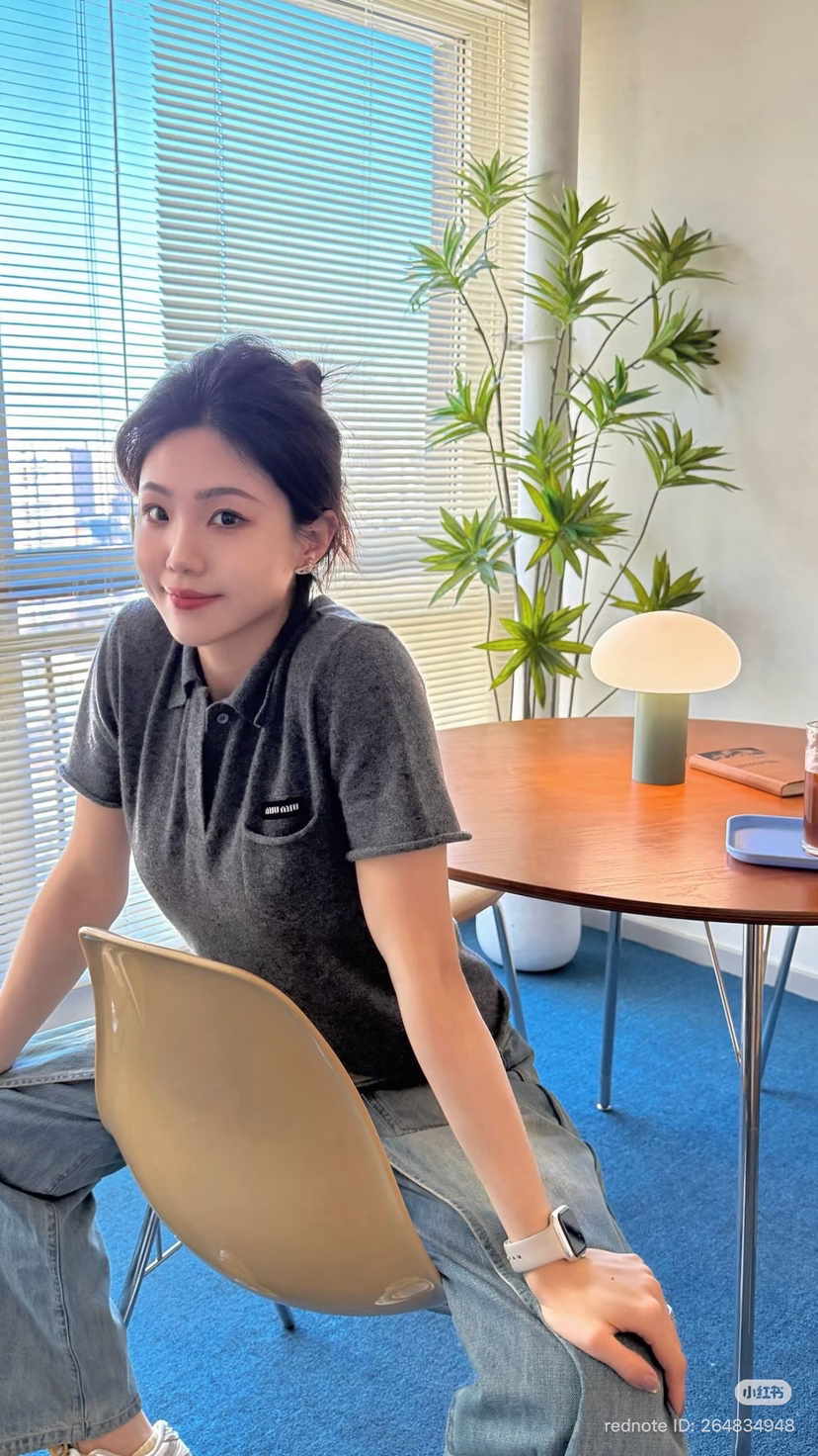 超有品味的烟灰色,一般是中老年专属的polo羊绒短袖,在miu的设计下,变成了年轻人的polo羊绒短袖,学院风翻领,非常可爱的小口袋