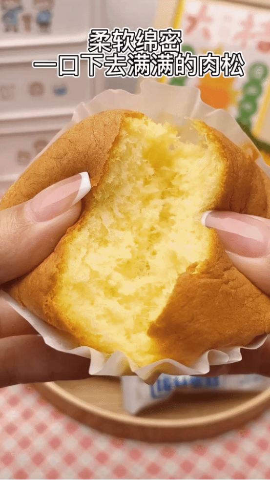 1. 戚风工艺 充分打发 让蛋糕口感松软,让肉松鸡蛋小麦粉充分交融 每一口都拉丝 软糯有嚼劲2. 每一口美味都离不开它 甄选不含豆粉的真肉松,肉松添加量高达8%,鸡蛋含量≥45%。 蛋香浓郁,鲜香美味。3. 丝丝肉松融入蛋糕内,外软里嫩,每一口都能感受到肉松带来的软糯嚼劲,越嚼越香。