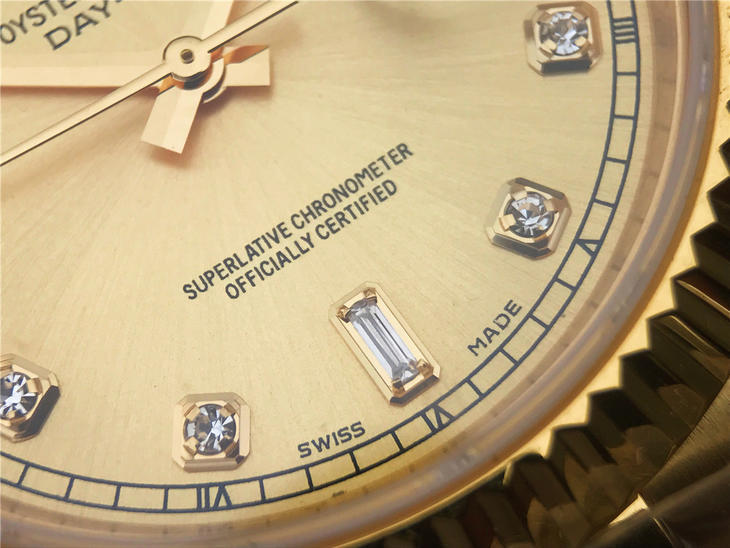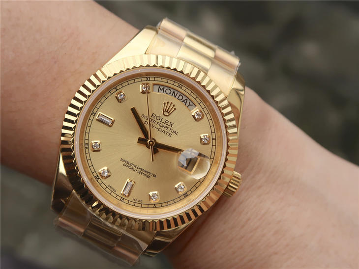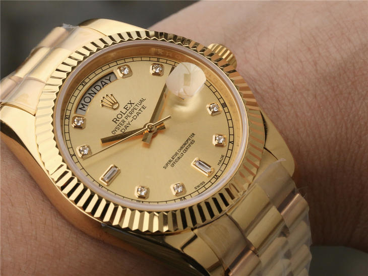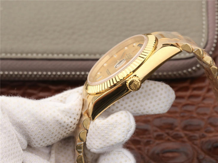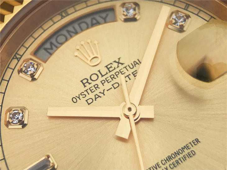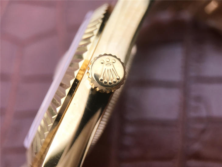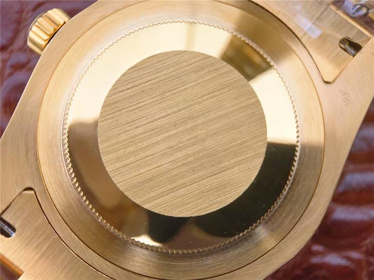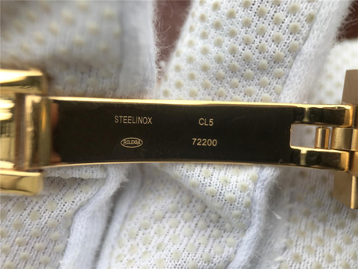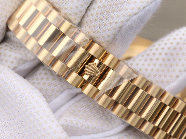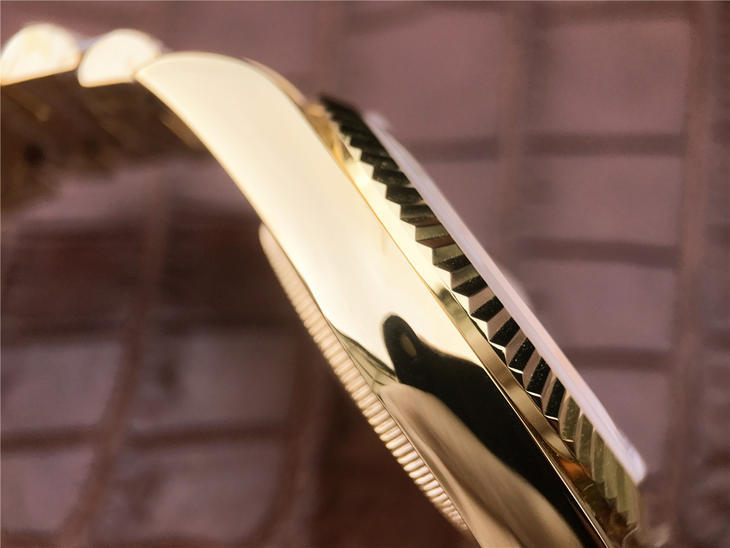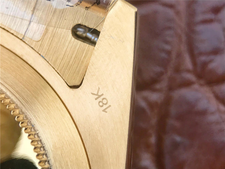CR劳力士星期日历型218238男士手表。41毫米直径,颠覆以往传统工艺!一:904L精钢。二:18厚金部分采用台湾 铸金技术,永久不褪色,比市场一般的"包金"耐用三倍以上(铸金:一种使金层和精钢粘合度更加紧密的新技术,又叫电铸,市场不太懂的人叫镀K)。三:真夹板3255机芯(假夹板的隐患:假钻和假齿轮容易脱落,卡死,导致机芯偷停损坏)。机芯调时方向与正品一致,(市面上的仿机调时是大拇指往下拉,长荣星期日历型是大拇指往上推)。