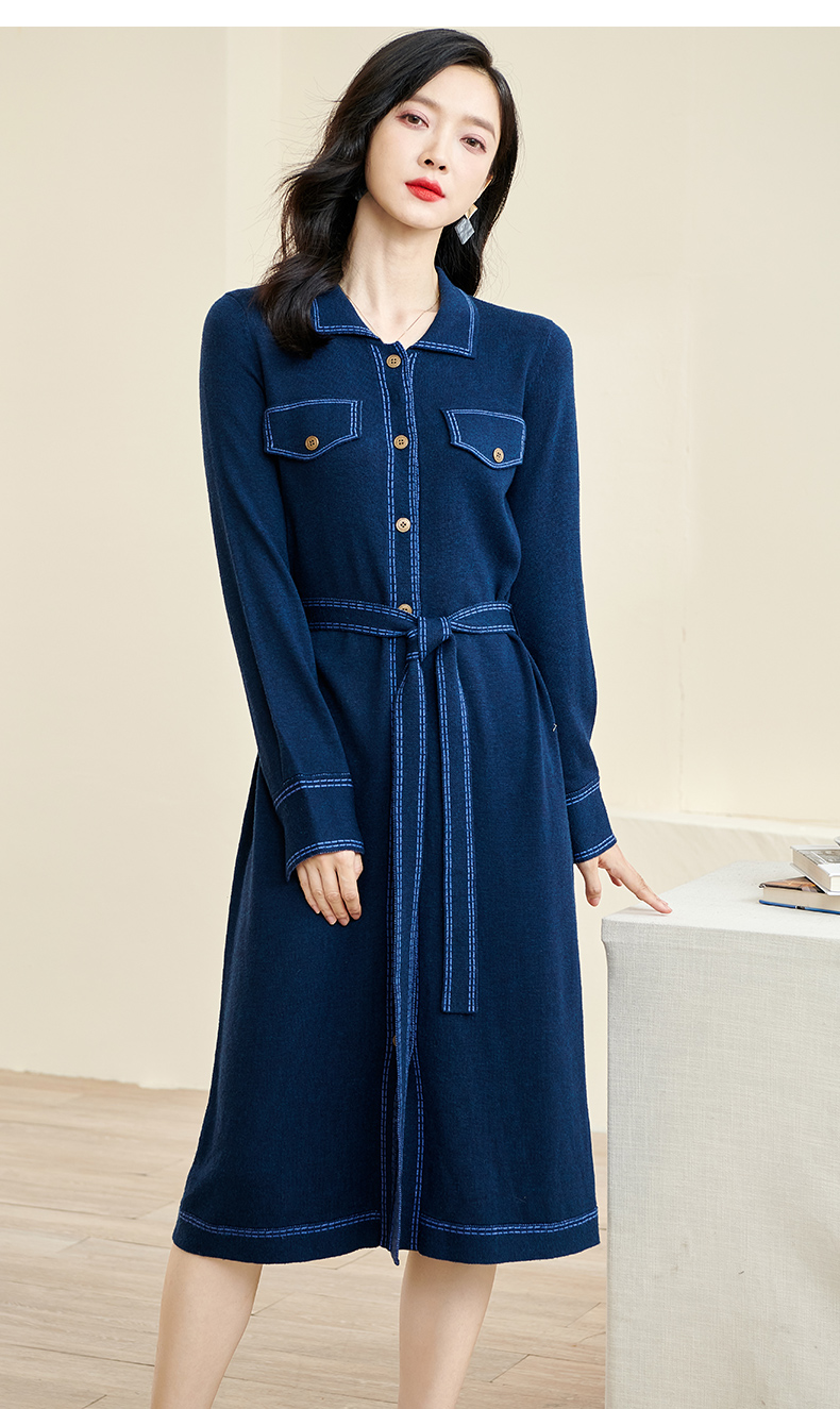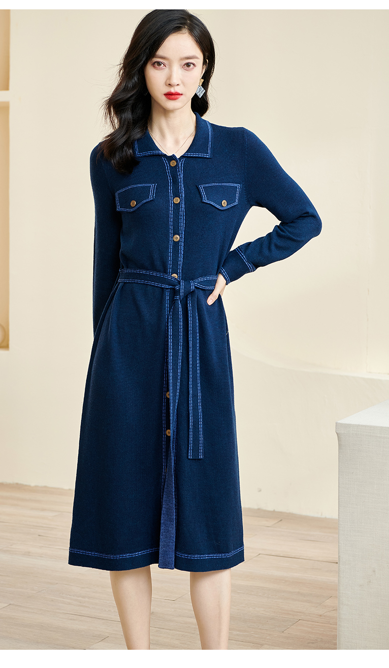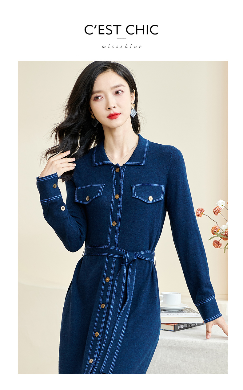 米思阳2024秋季新款时尚通勤长袖针织裙子明线装饰收腰连衣裙3289