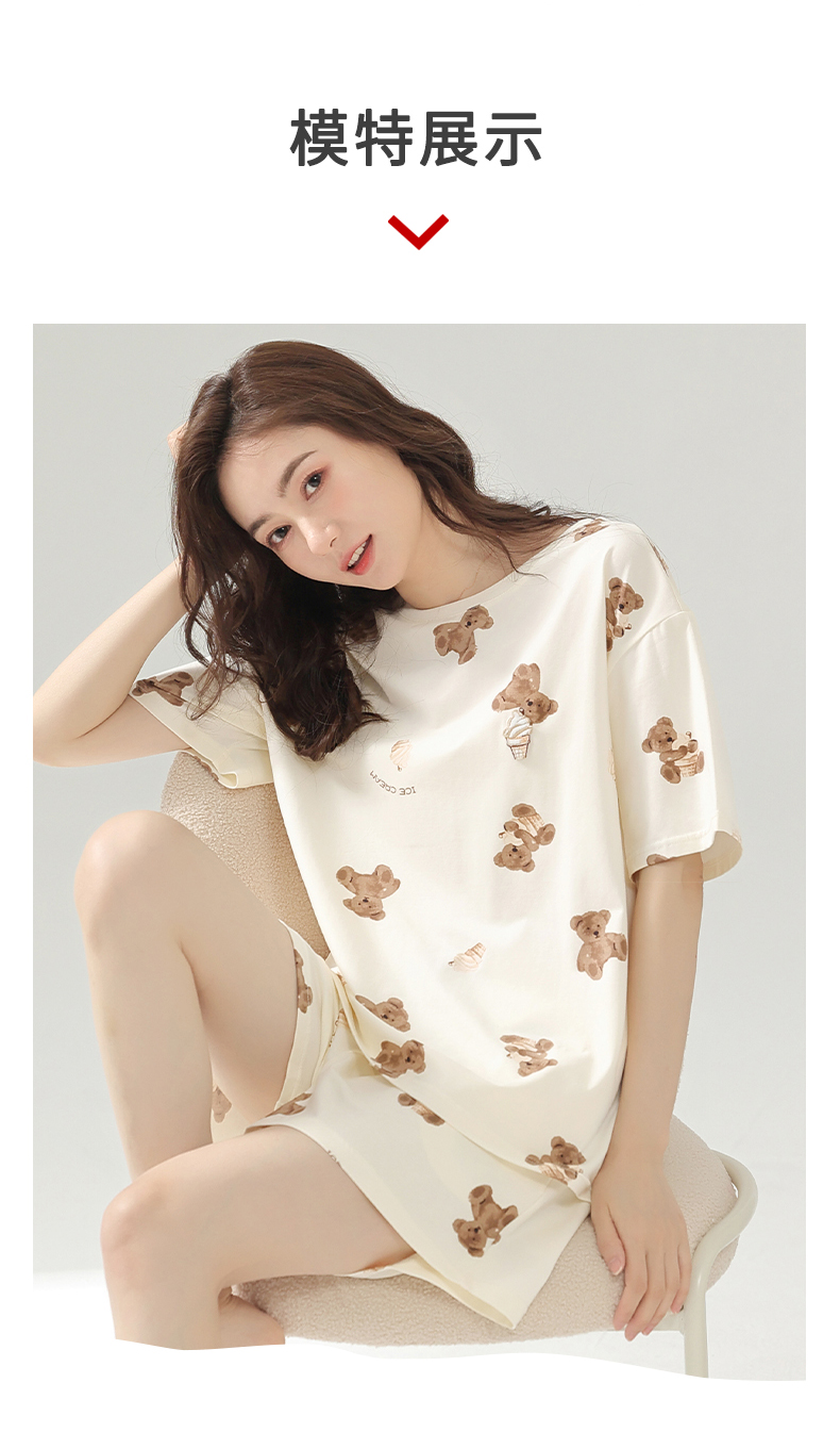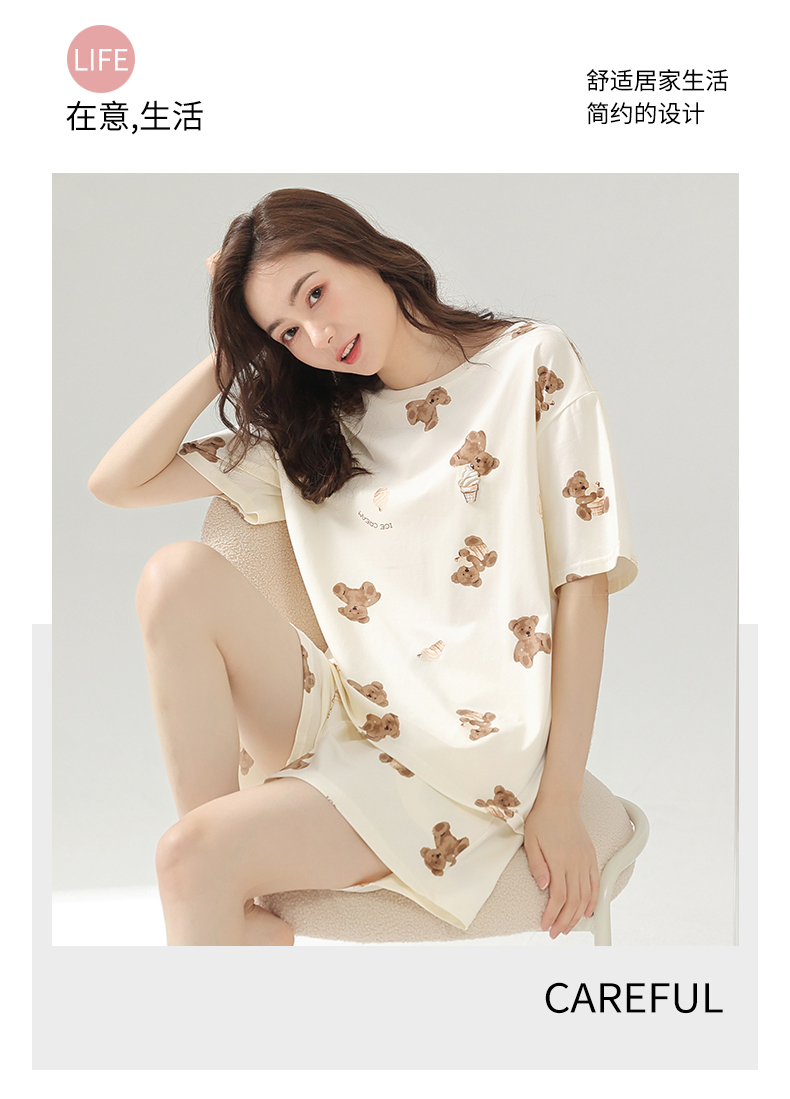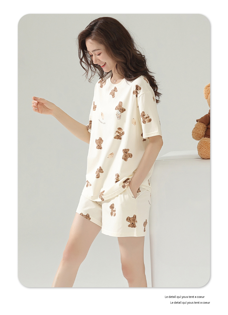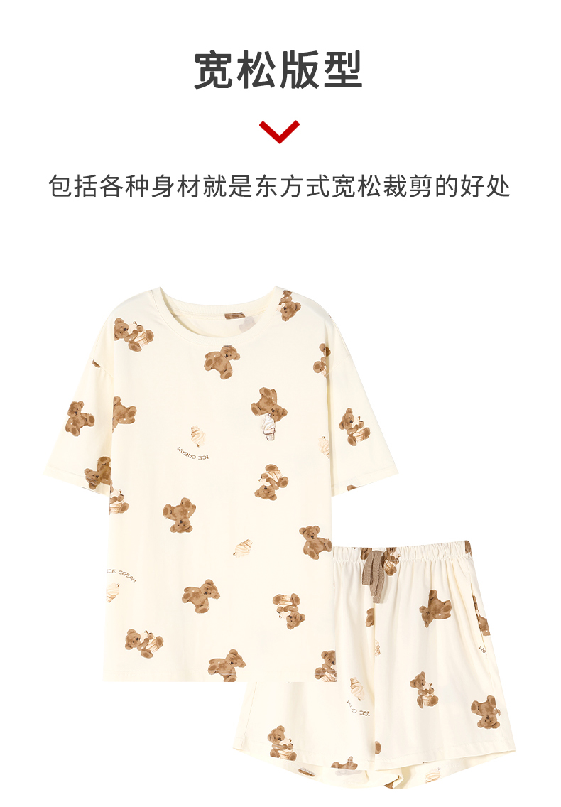 可人儿短袖短裤睡衣女夏季薄款休闲圆领小熊纯棉外穿家居服套装薄