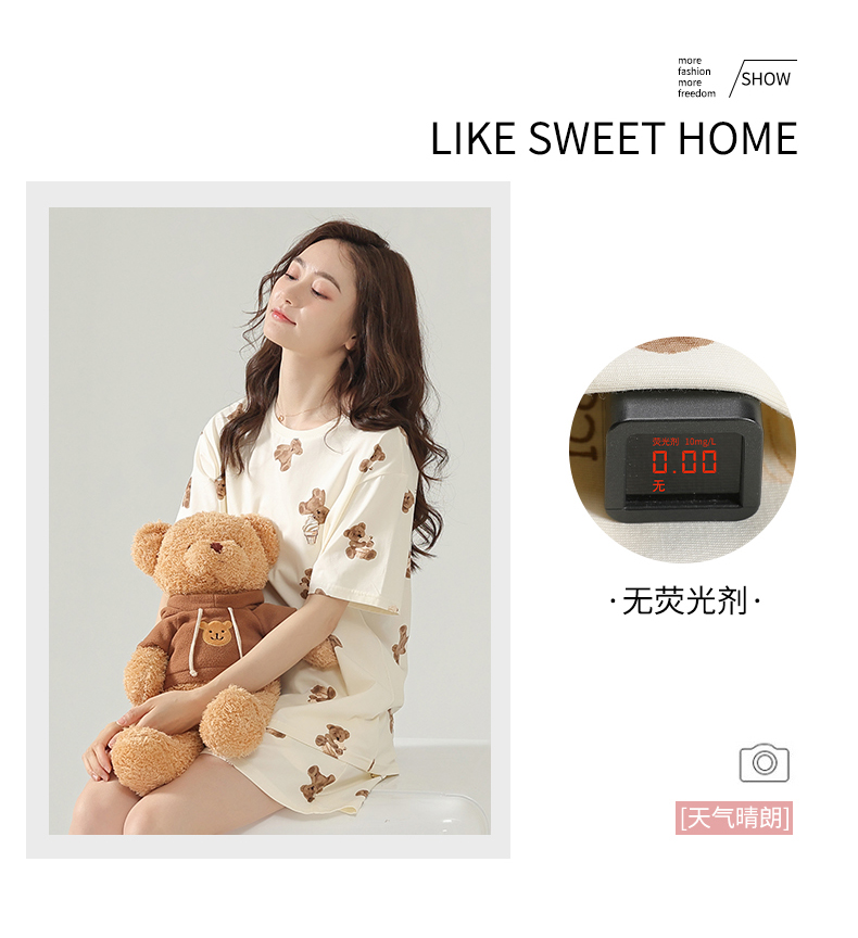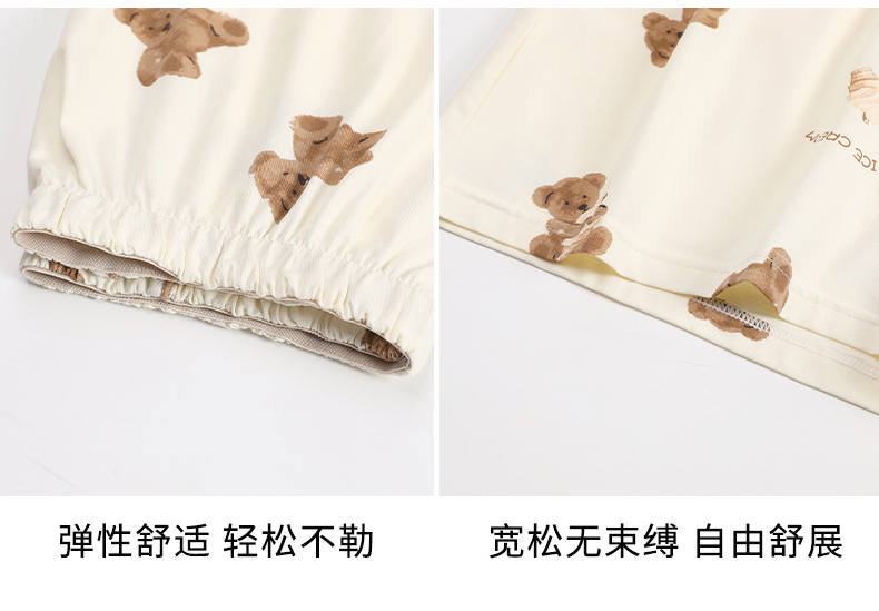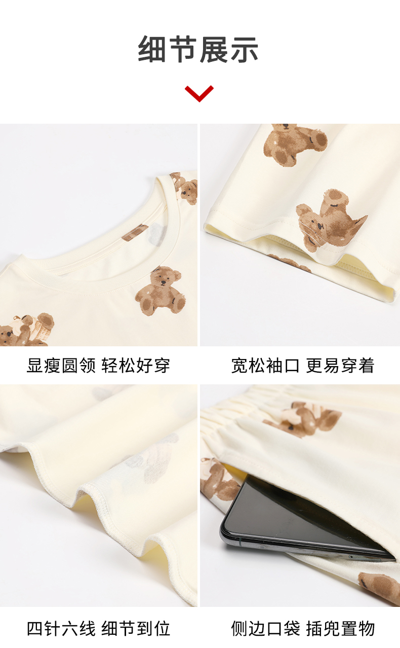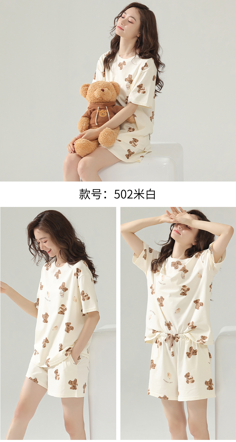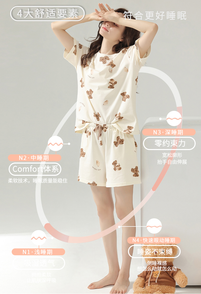 可人儿短袖短裤睡衣女夏季薄款休闲圆领小熊纯棉外穿家居服套装薄