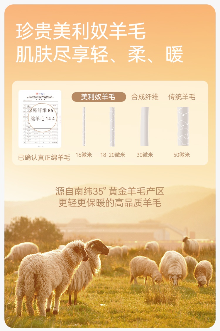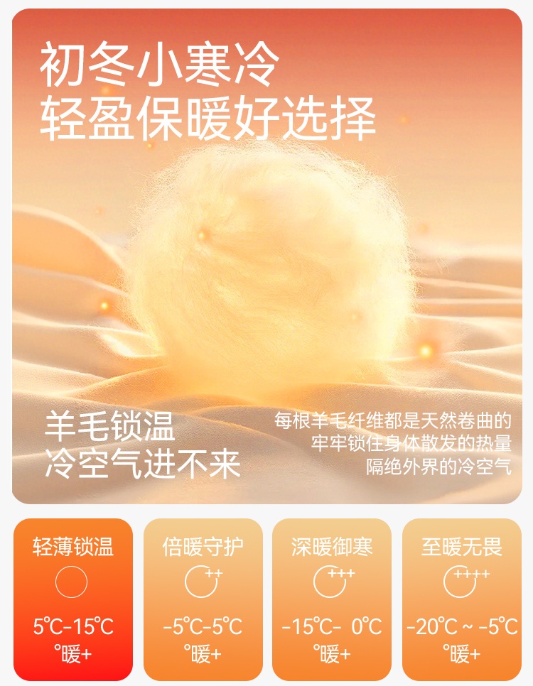 里表锦纶软如云朵,中间绵羊毛锁温不闷汗,薄如蝉翼却暖过棉袄。