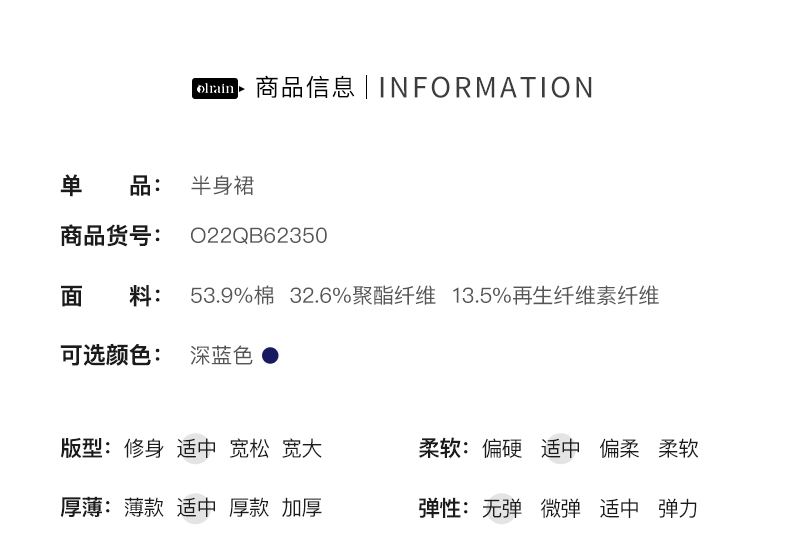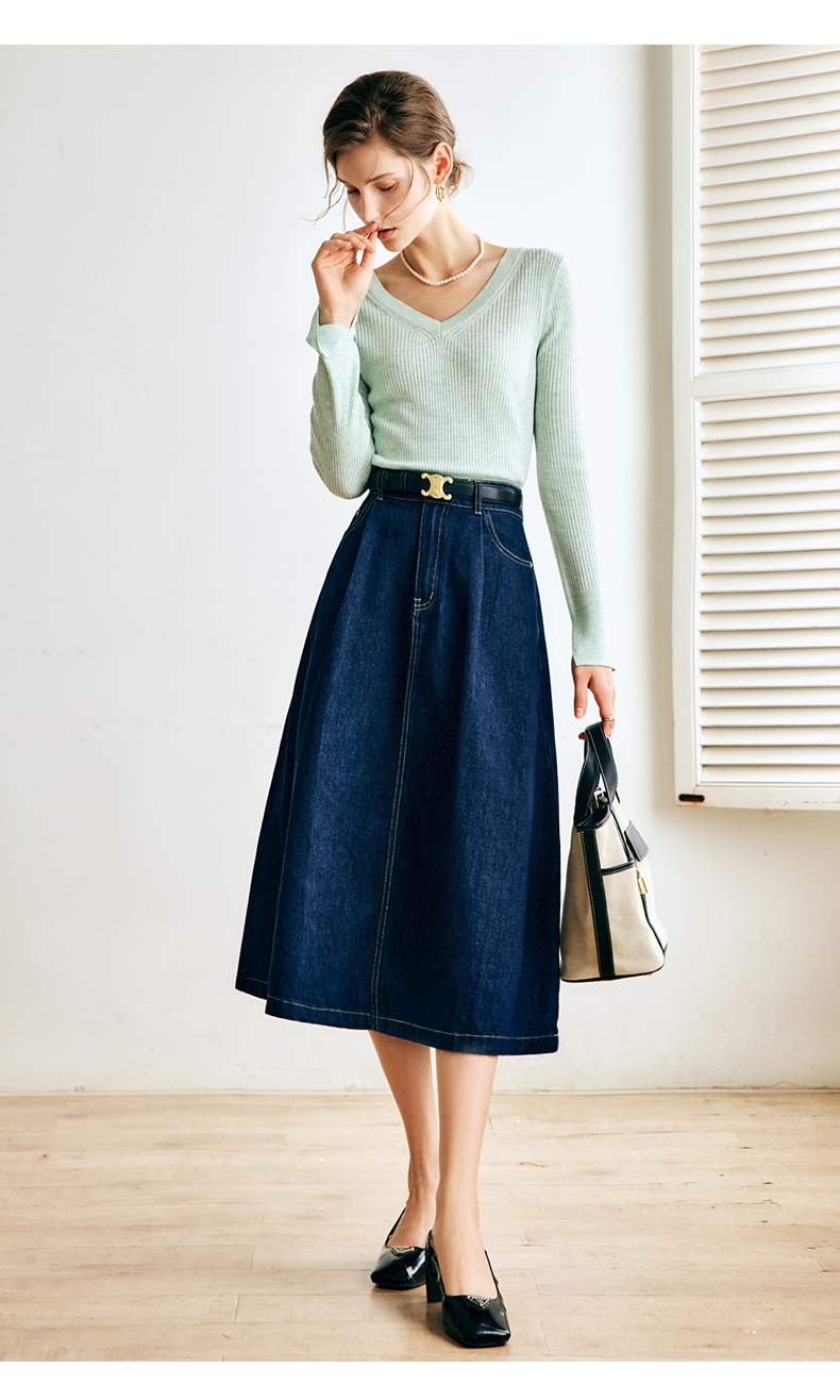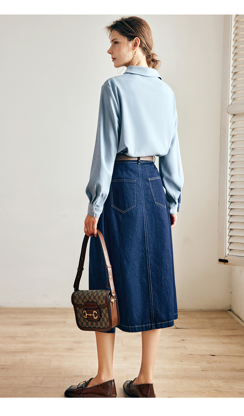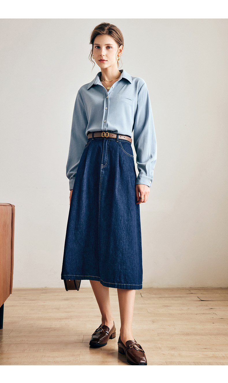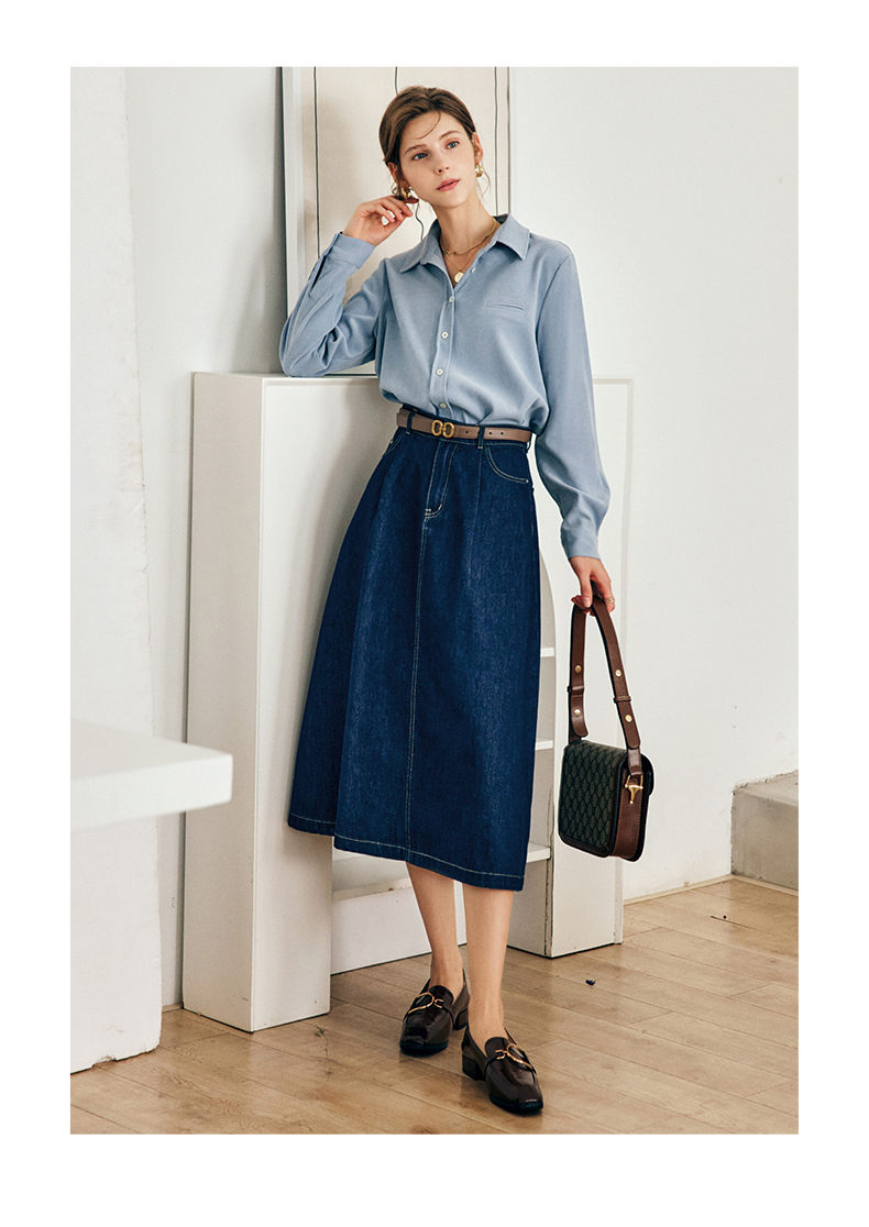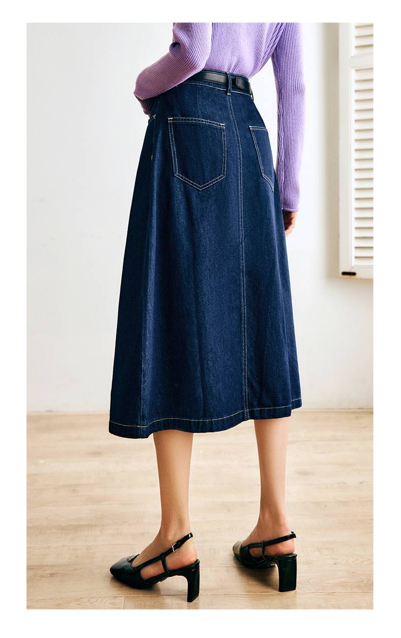 OLrain法式深蓝色牛仔半身裙女早秋2022新款气质高腰显瘦A字裙字