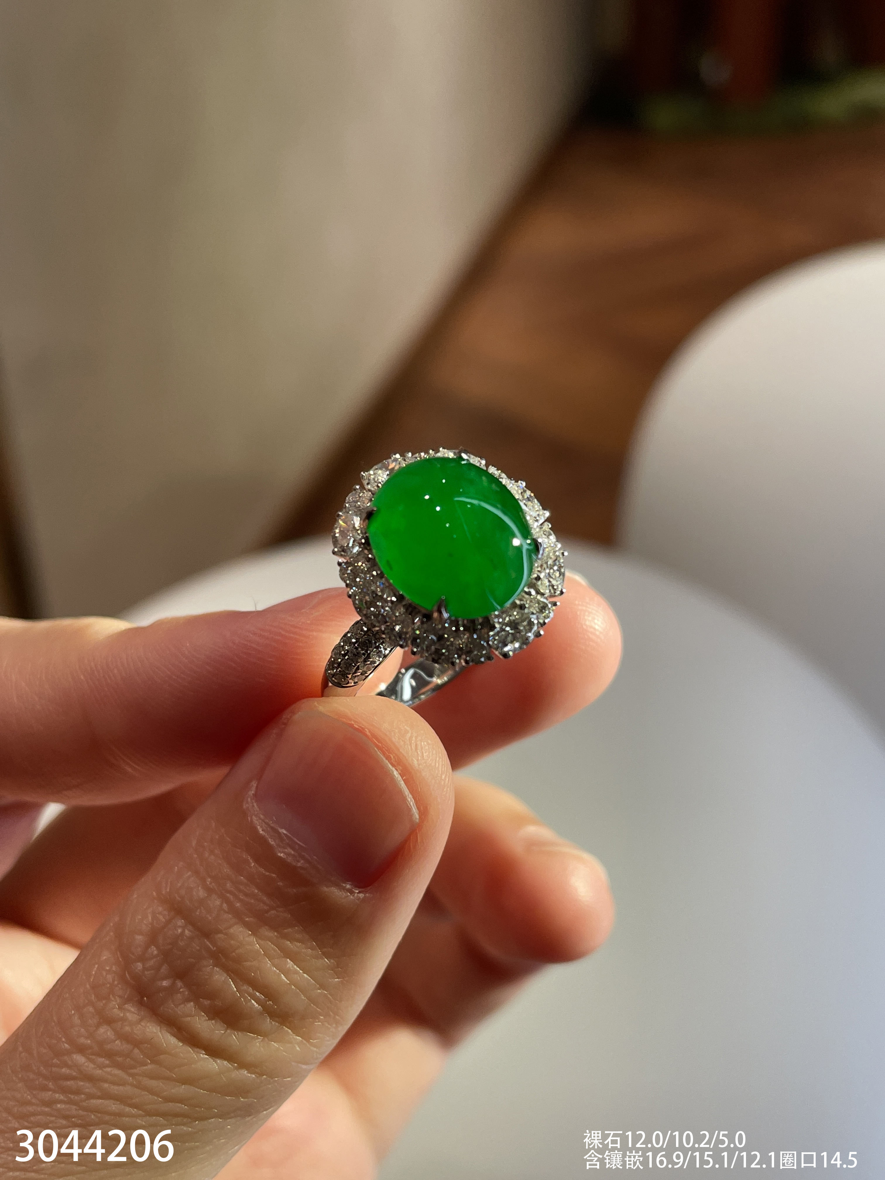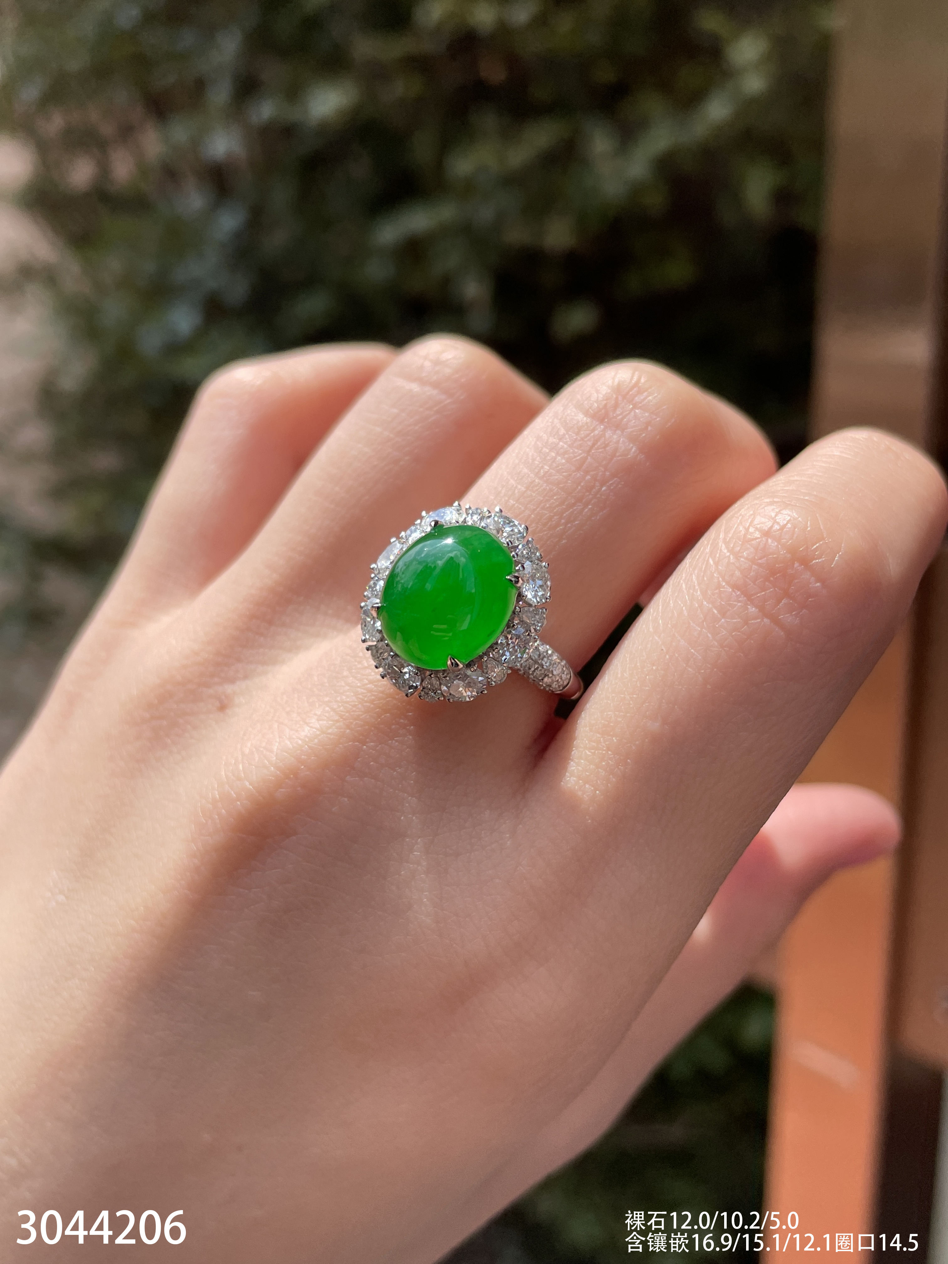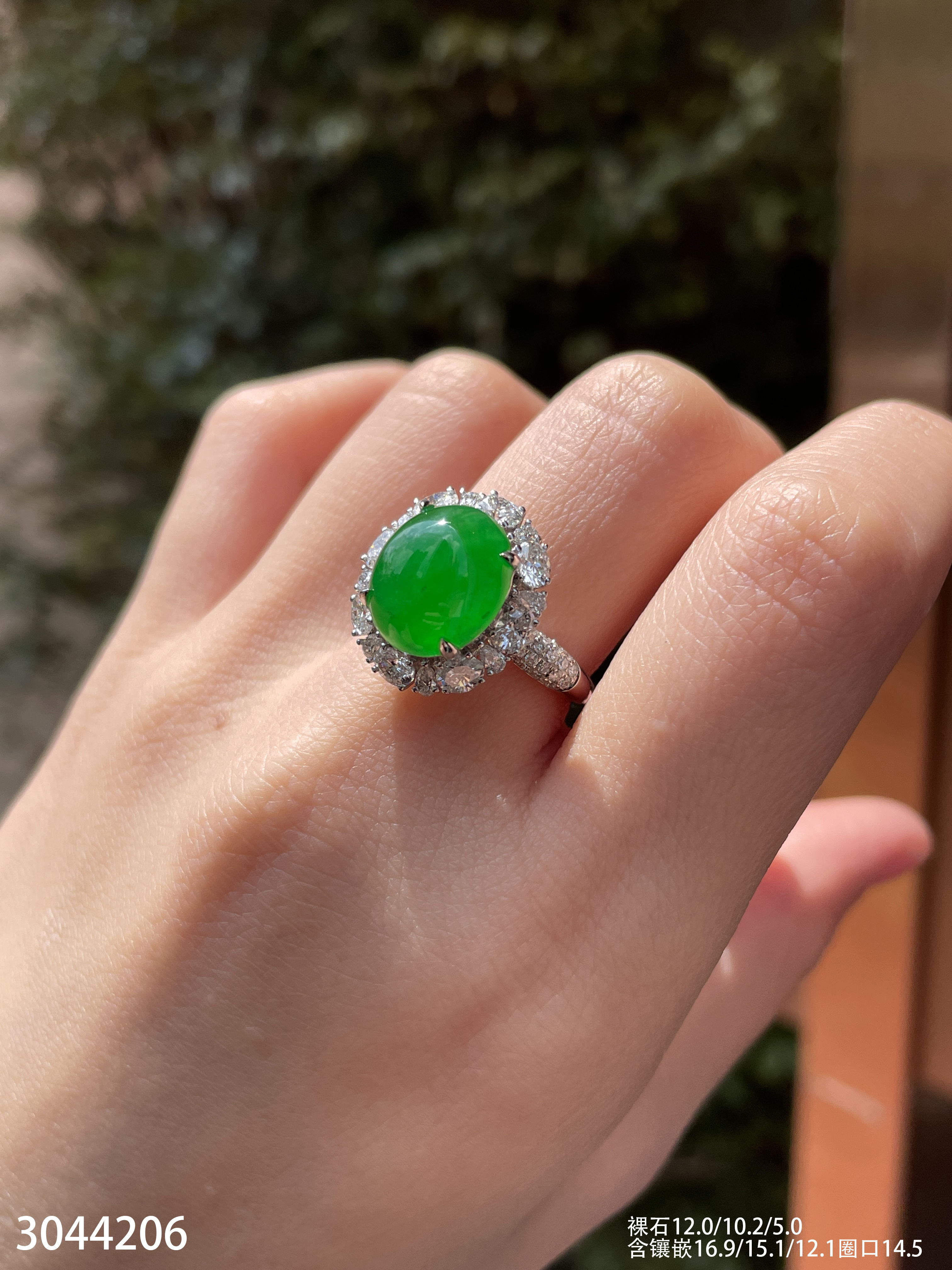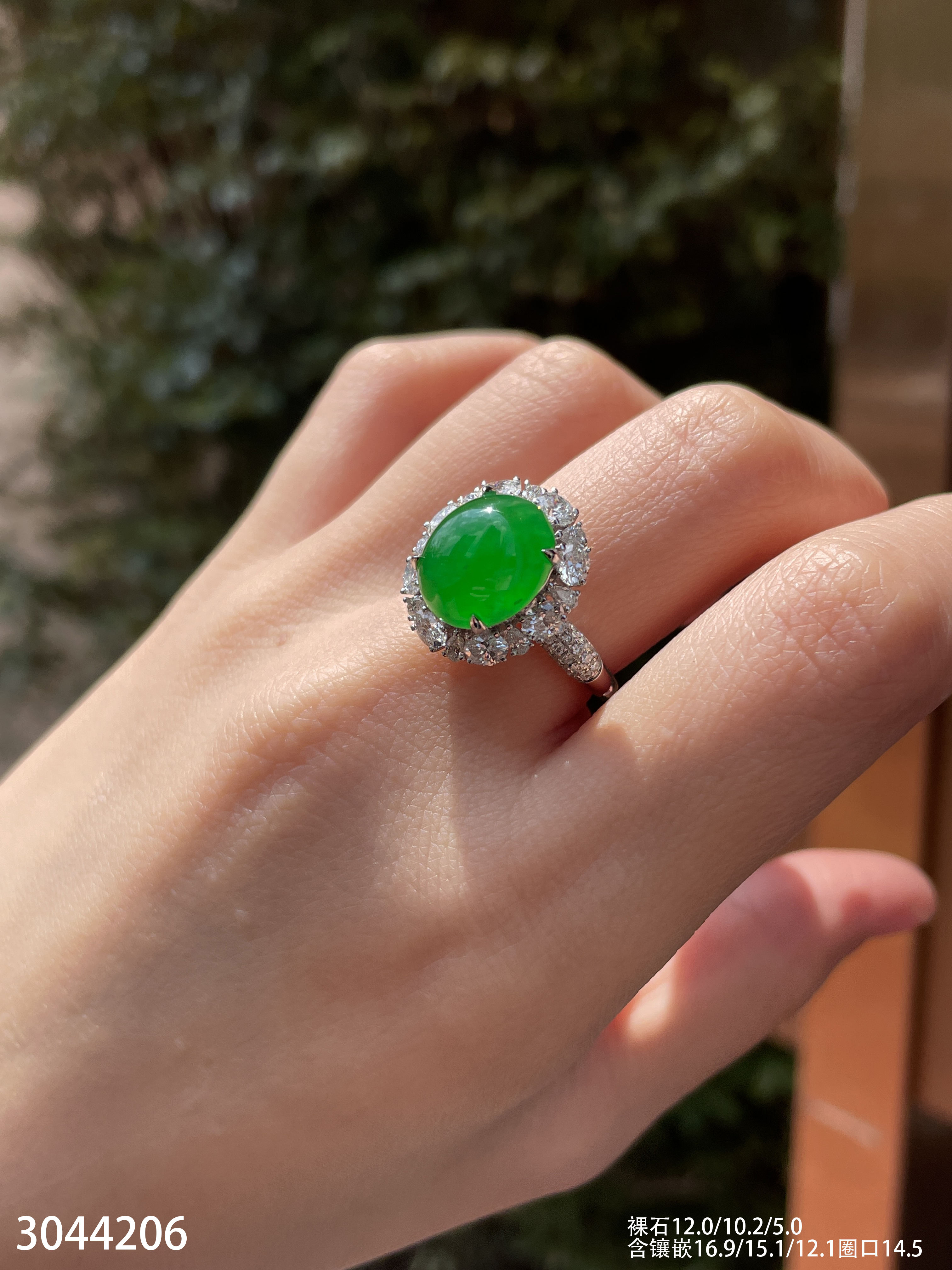 3044206,老坑高冰艳绿蛋面戒指。具体价格微信咨询