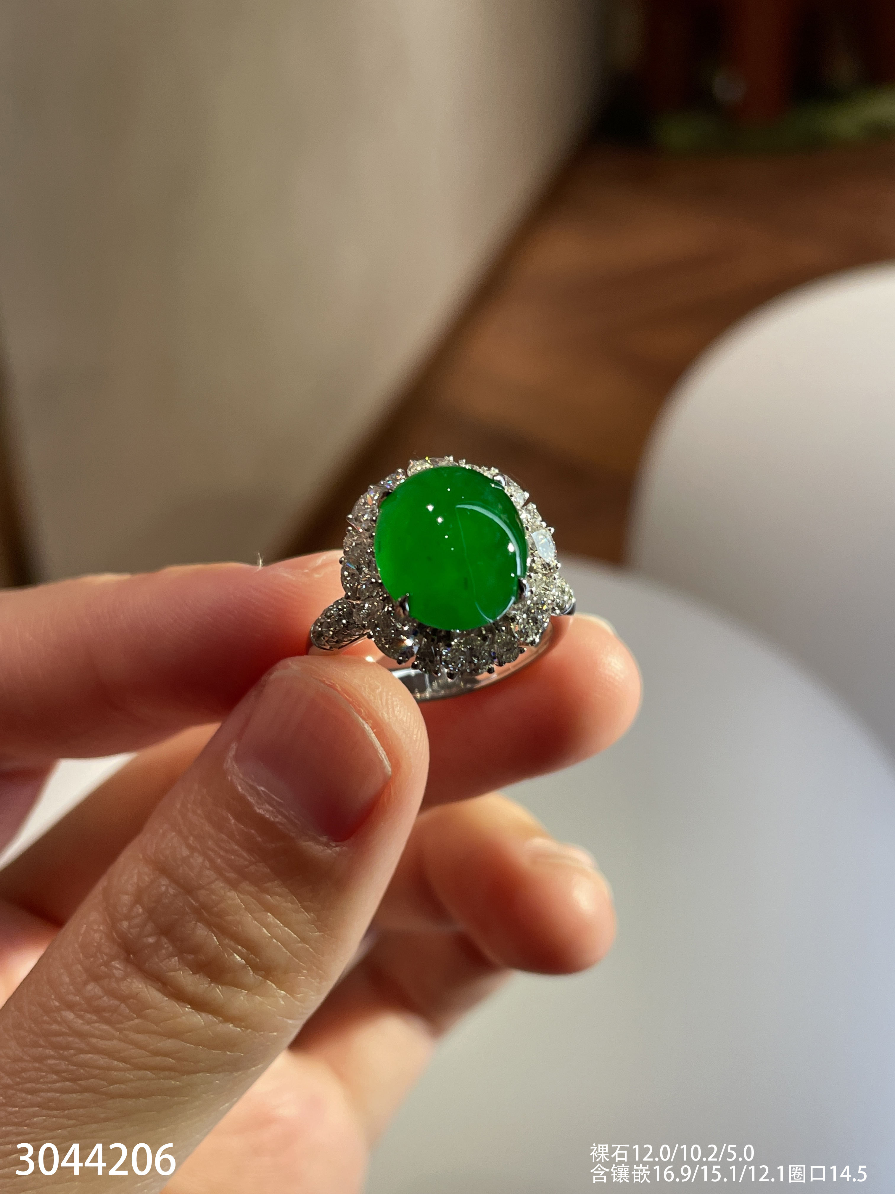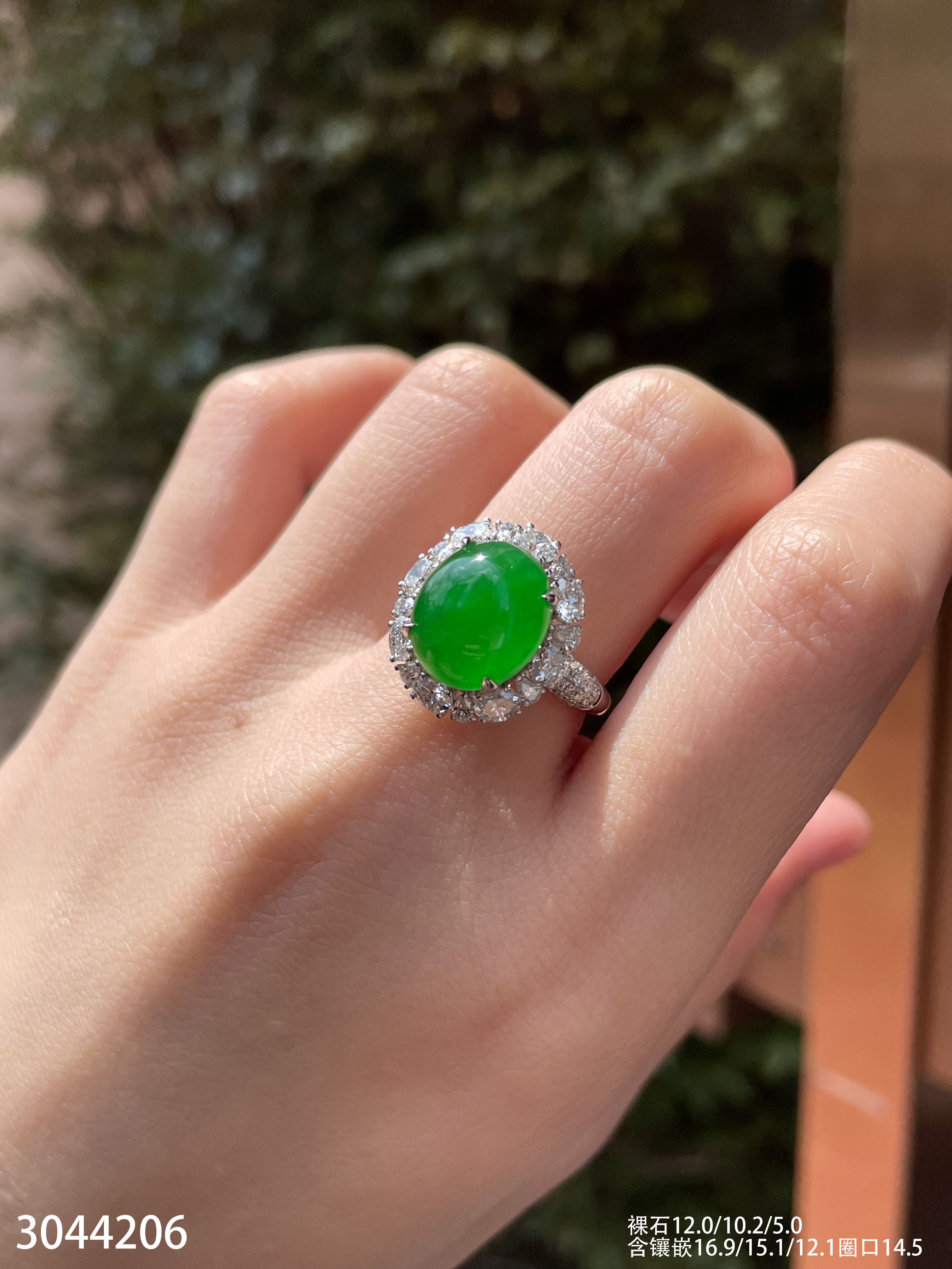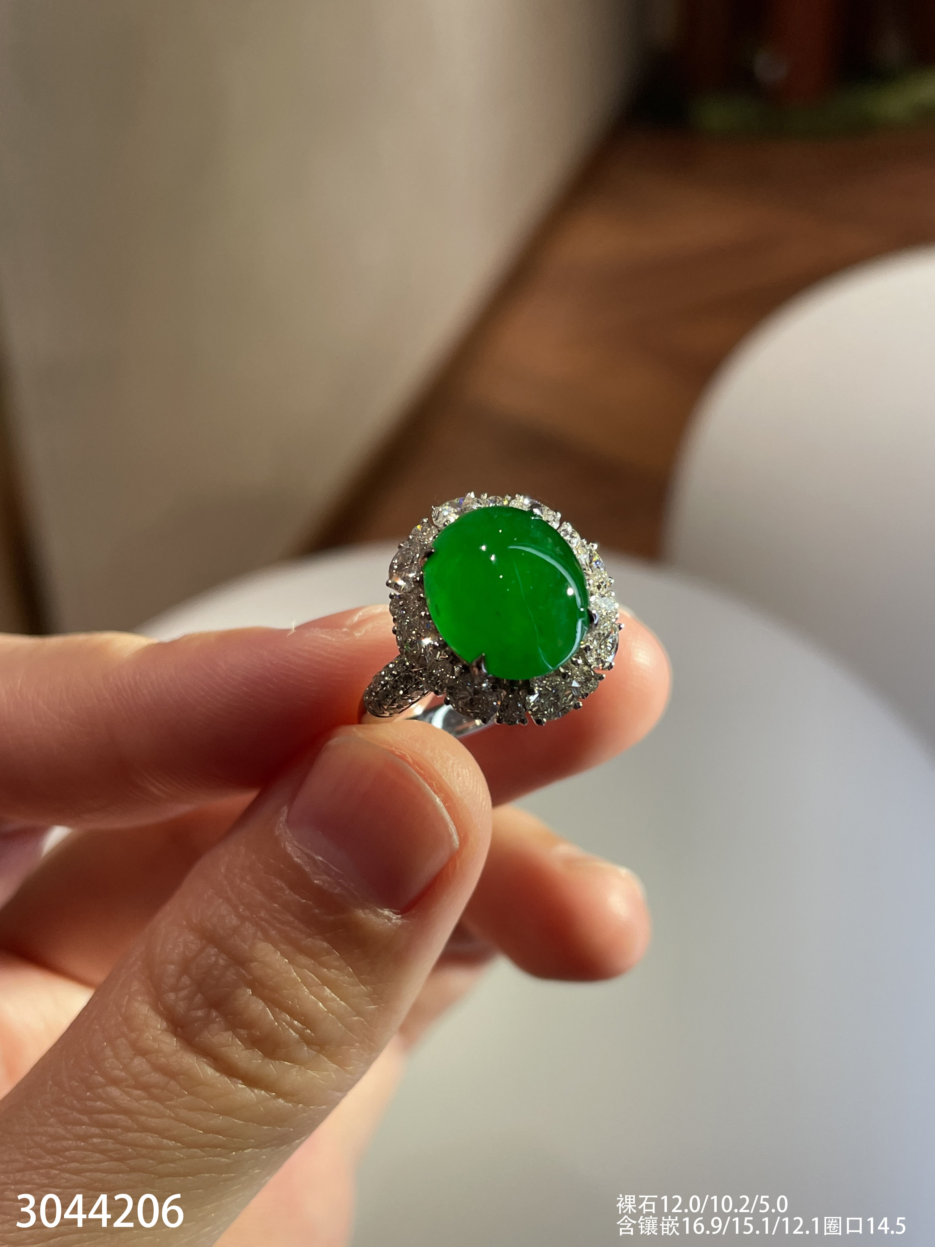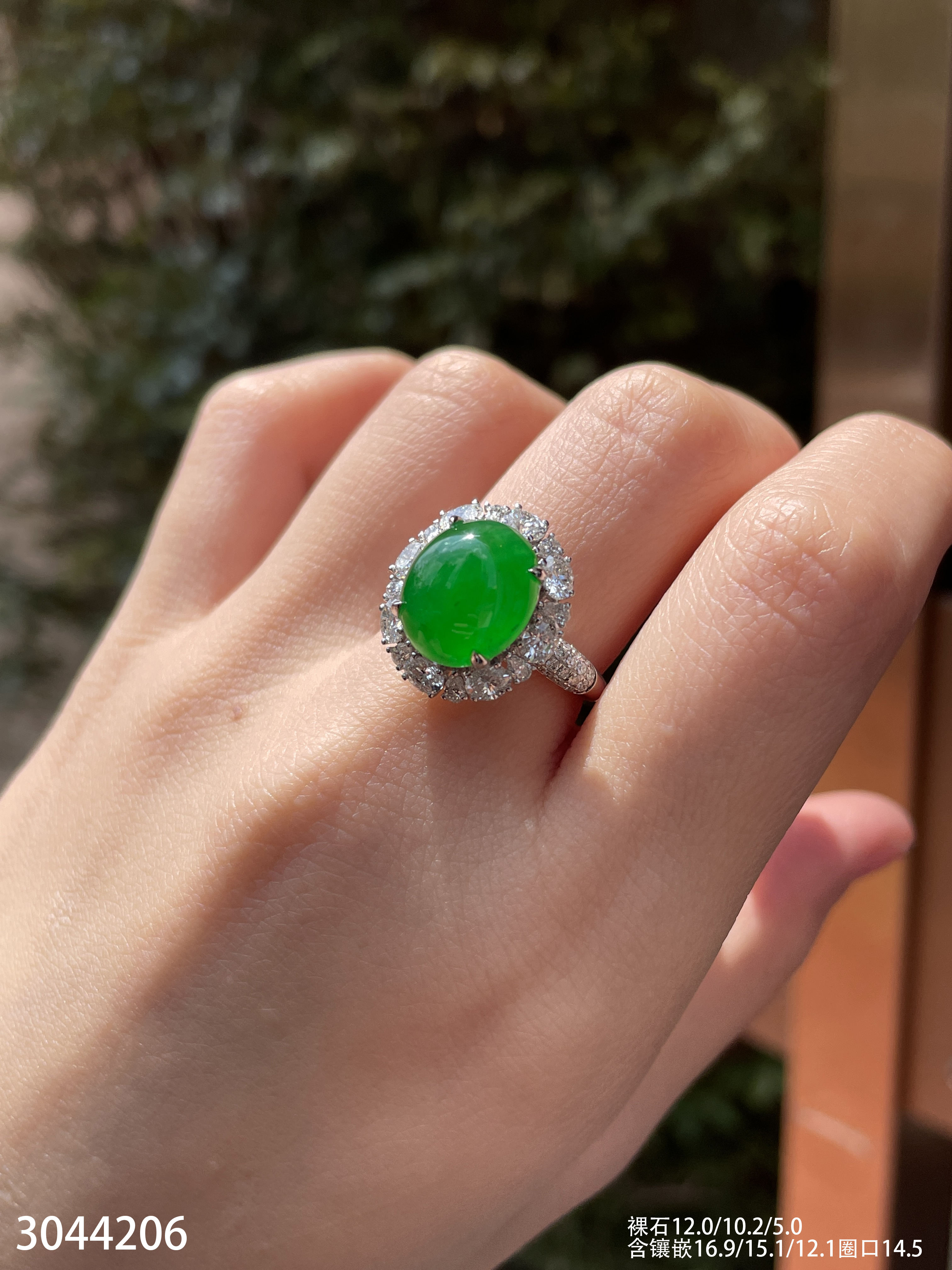 3044206,老坑高冰艳绿蛋面戒指。具体价格微信咨询
