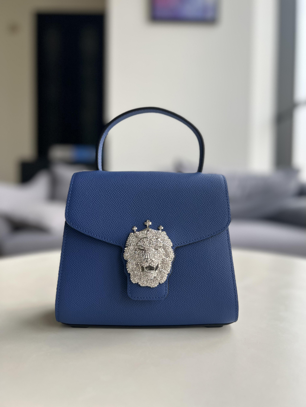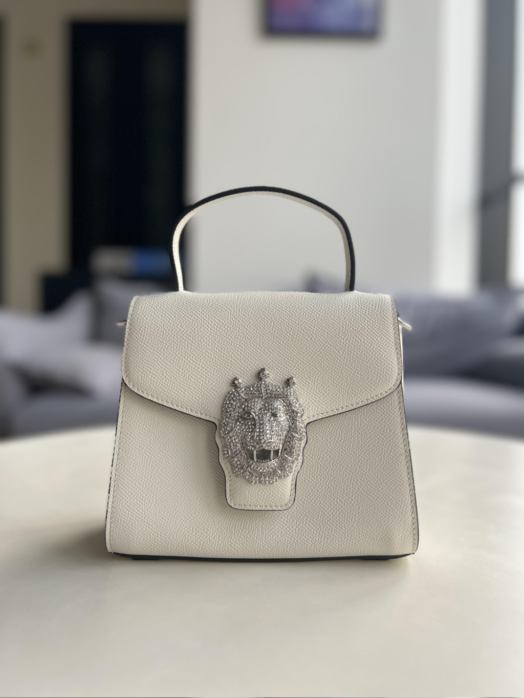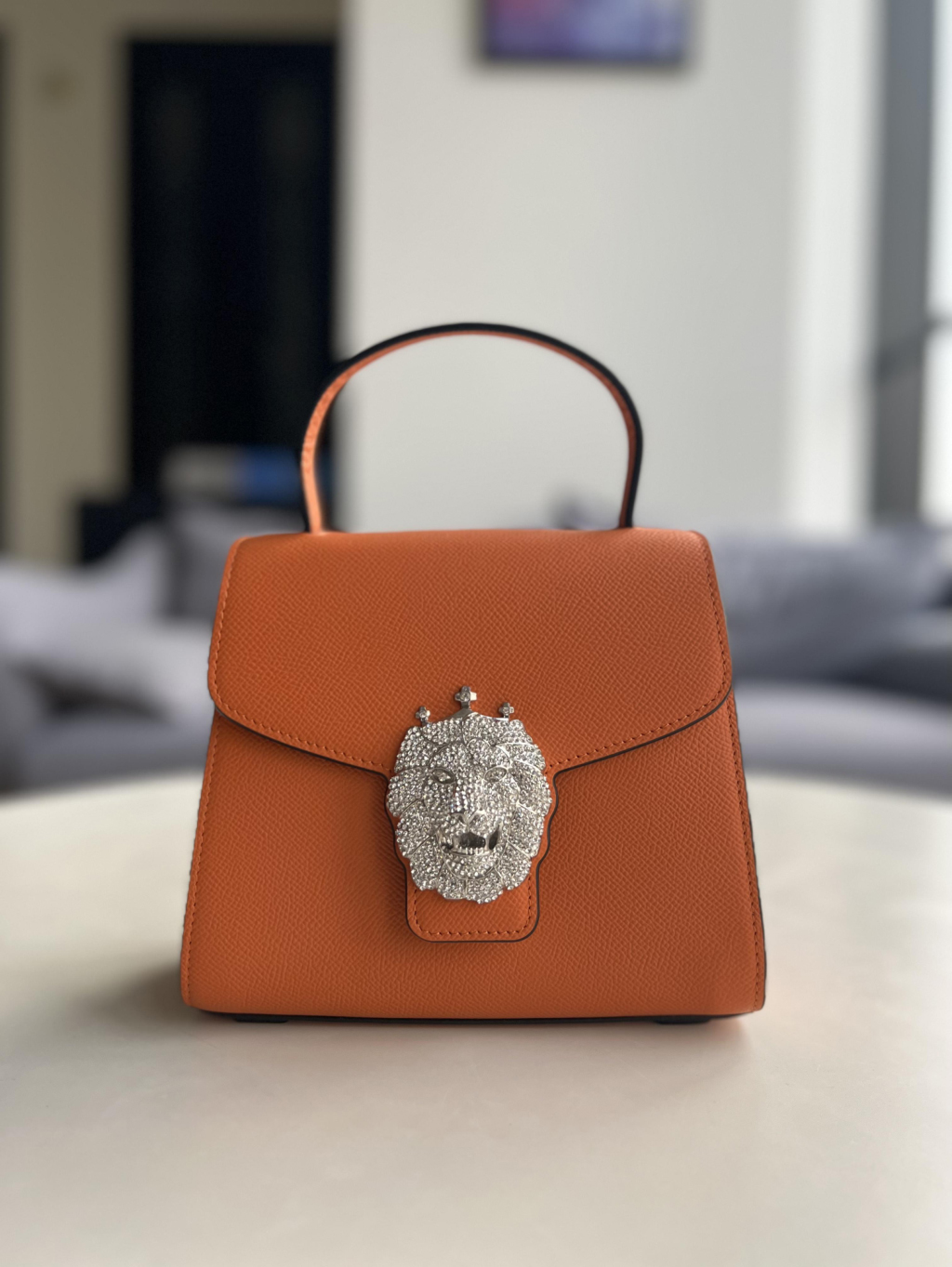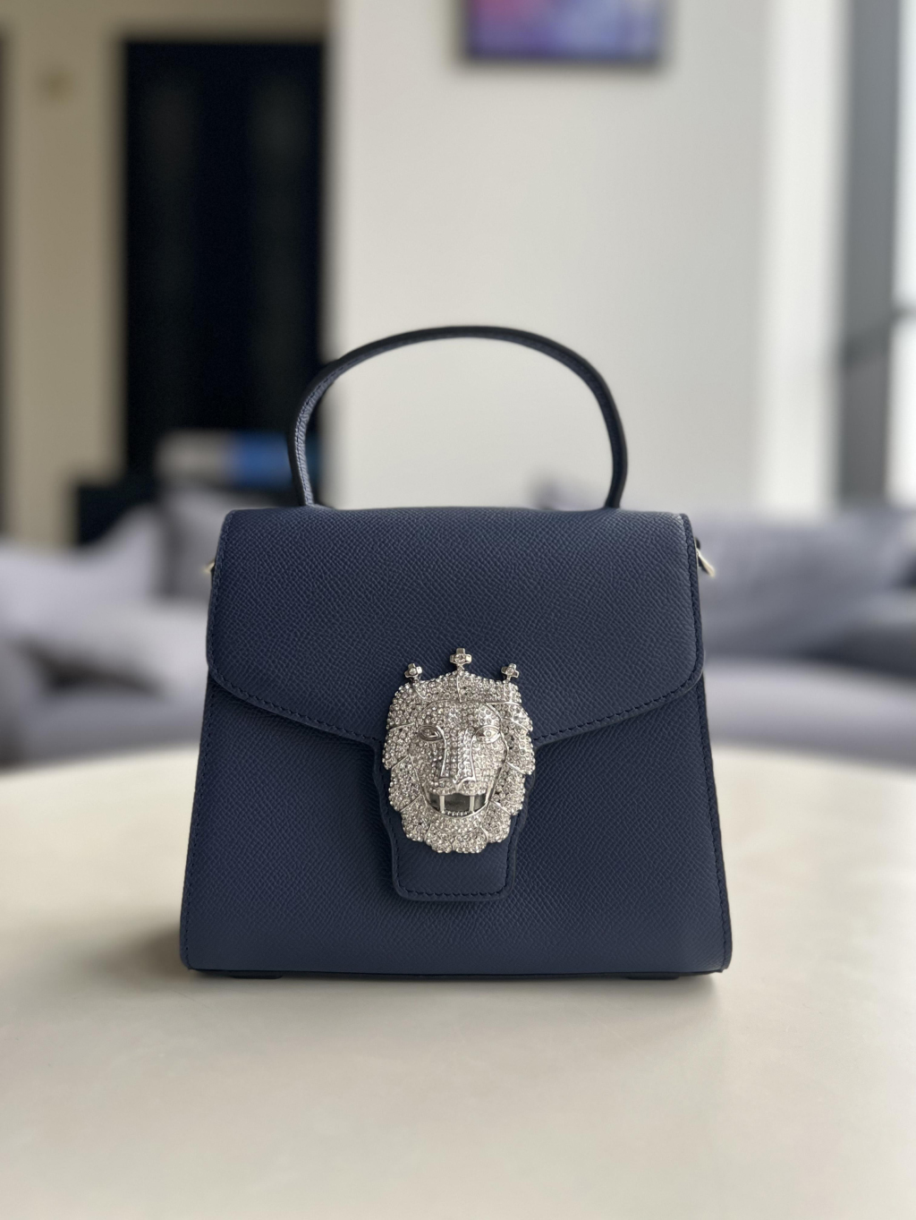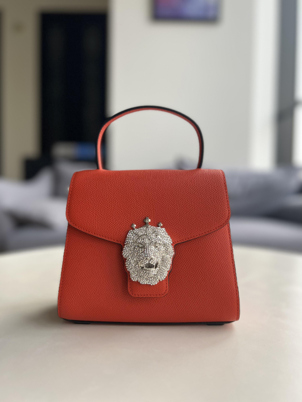 冠狮包身采用进口胚头层牛皮经由一百多道工序纯手工打造,完美体现匠人精神,五百颗耀眼水晶钻石镶嵌,构成精致冠狮,华丽感冠冕尽显时尚小巧精致(18.5*16*9.5cm),巧用可拆卸长肩带,手提、肩背斜挎等,随心转换。