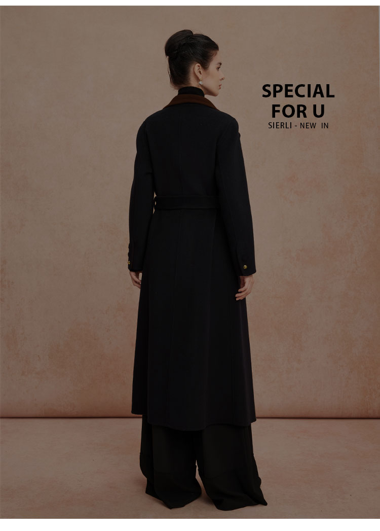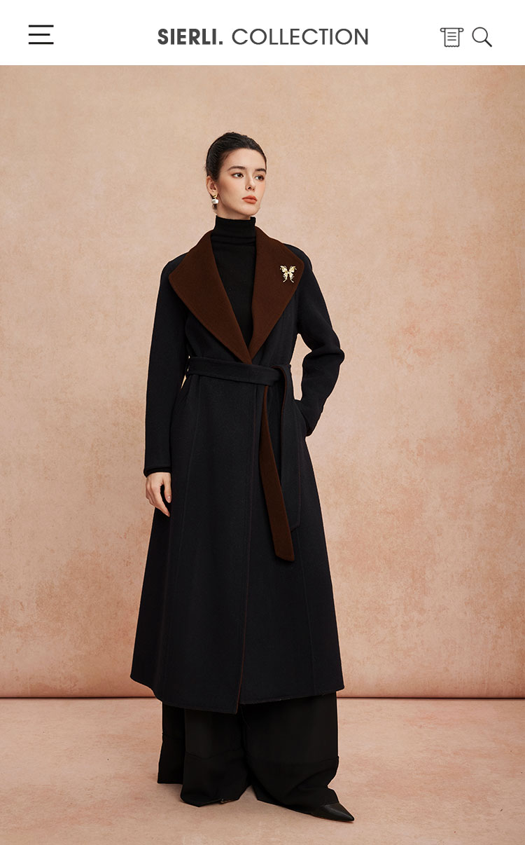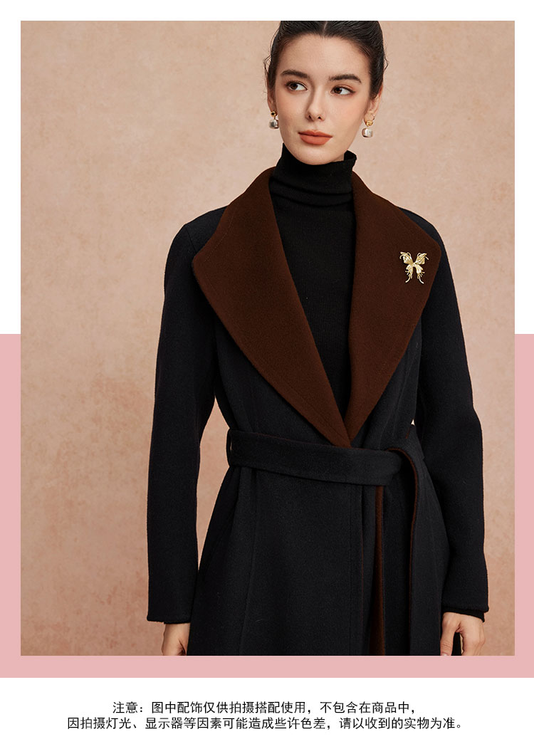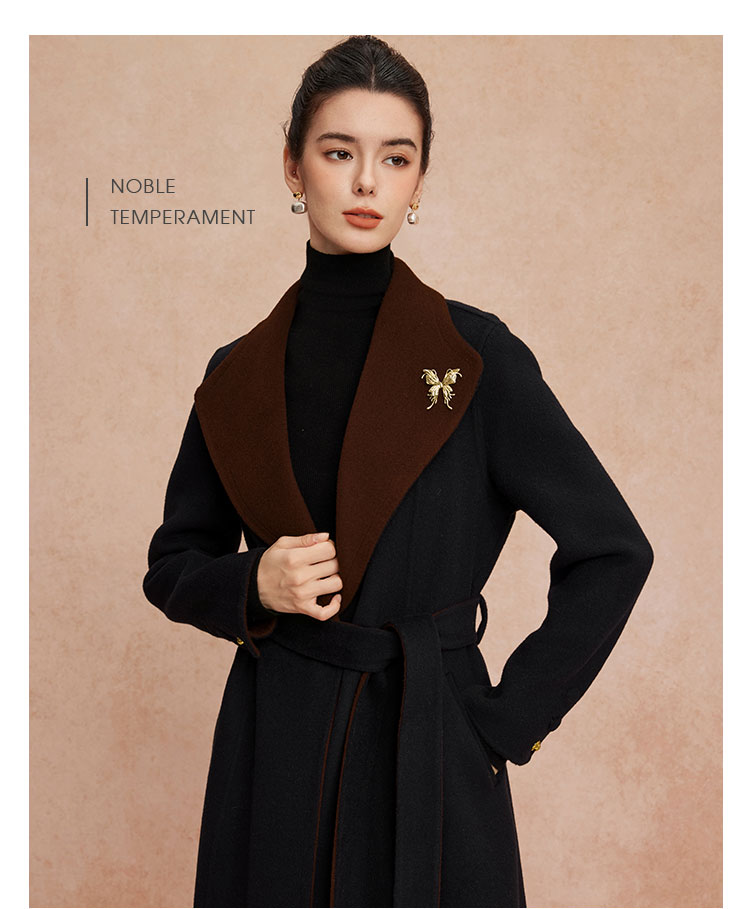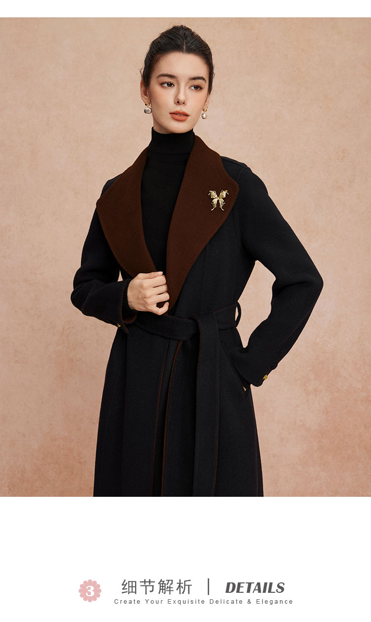 QH924斯尔丽25新款含羊绒性强修身气质高雅流金蝴蝶胸花长款羊毛大衣