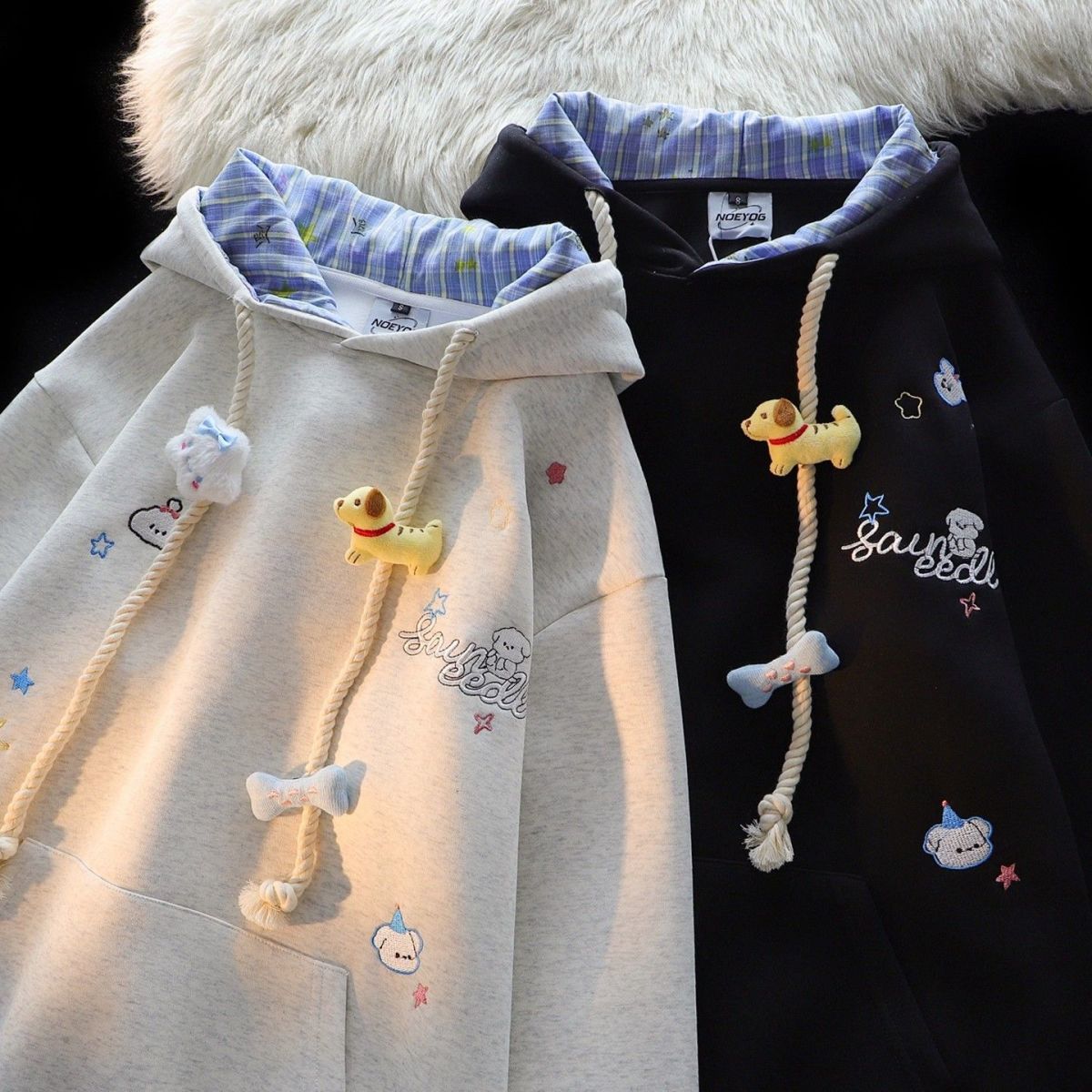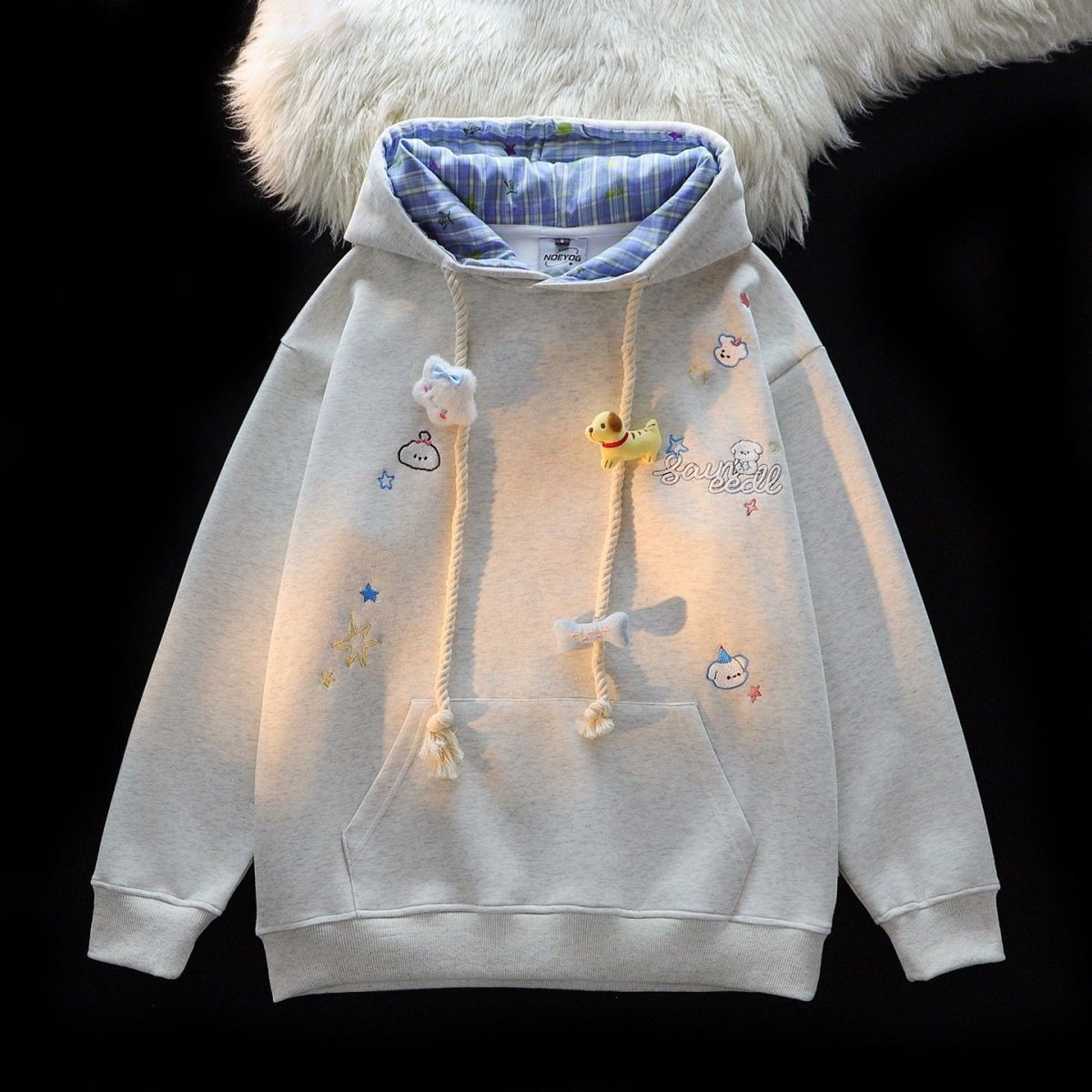 美式刺绣小熊格纹连帽卫衣女秋冬新款宽松慵懒设计感情侣开衫外套