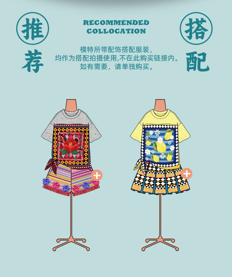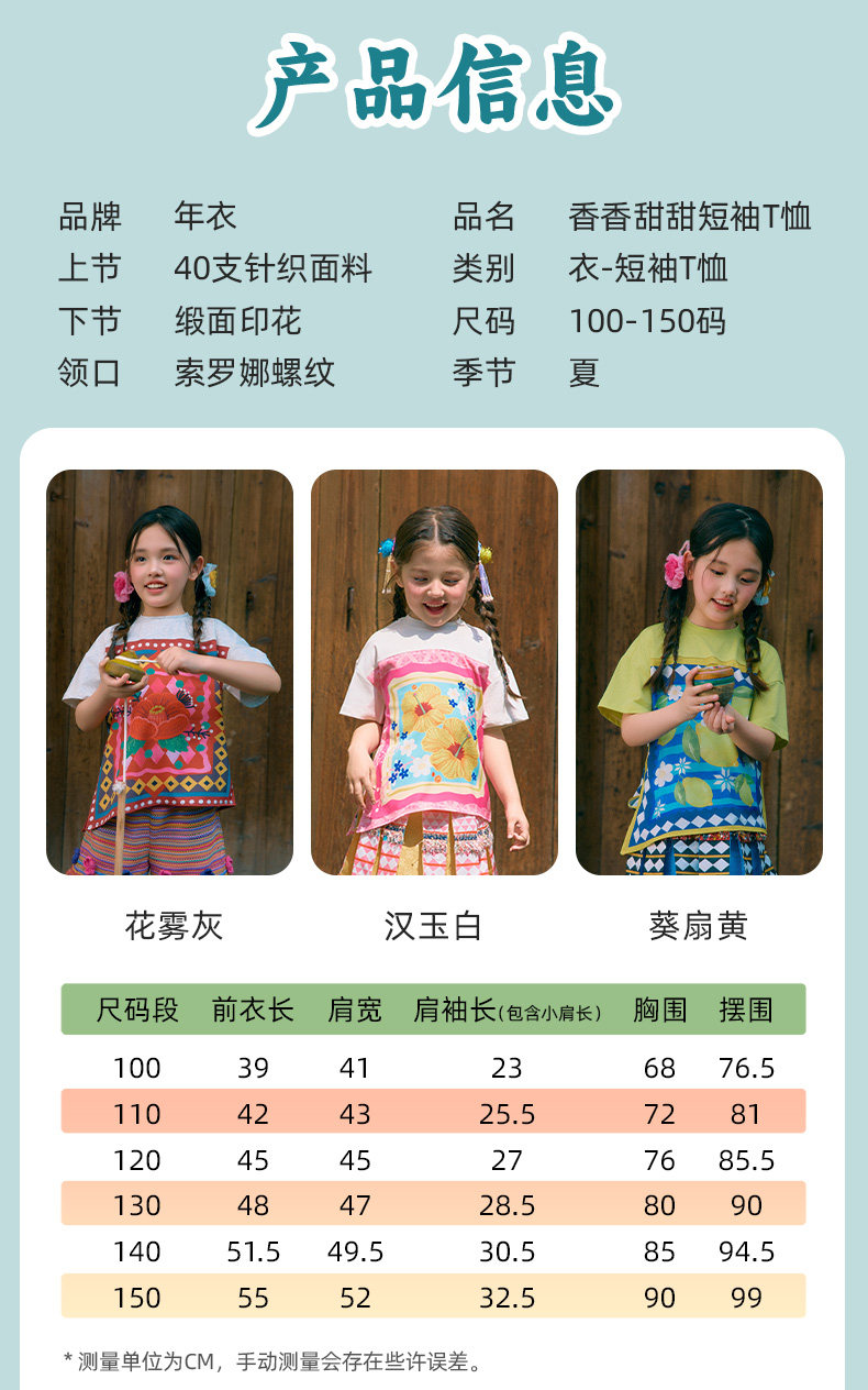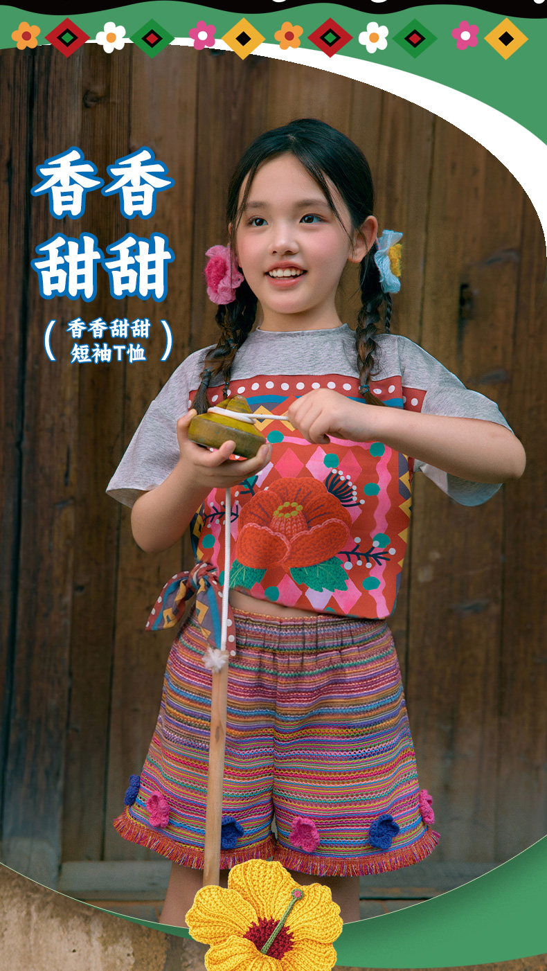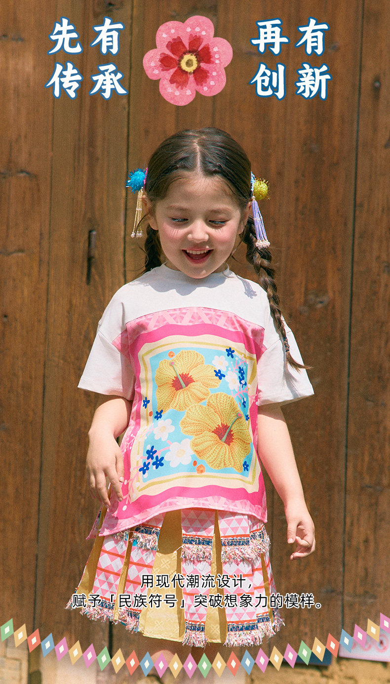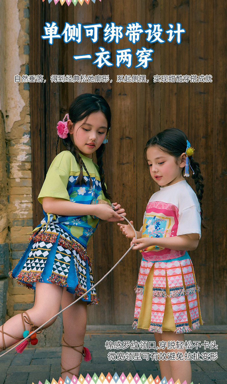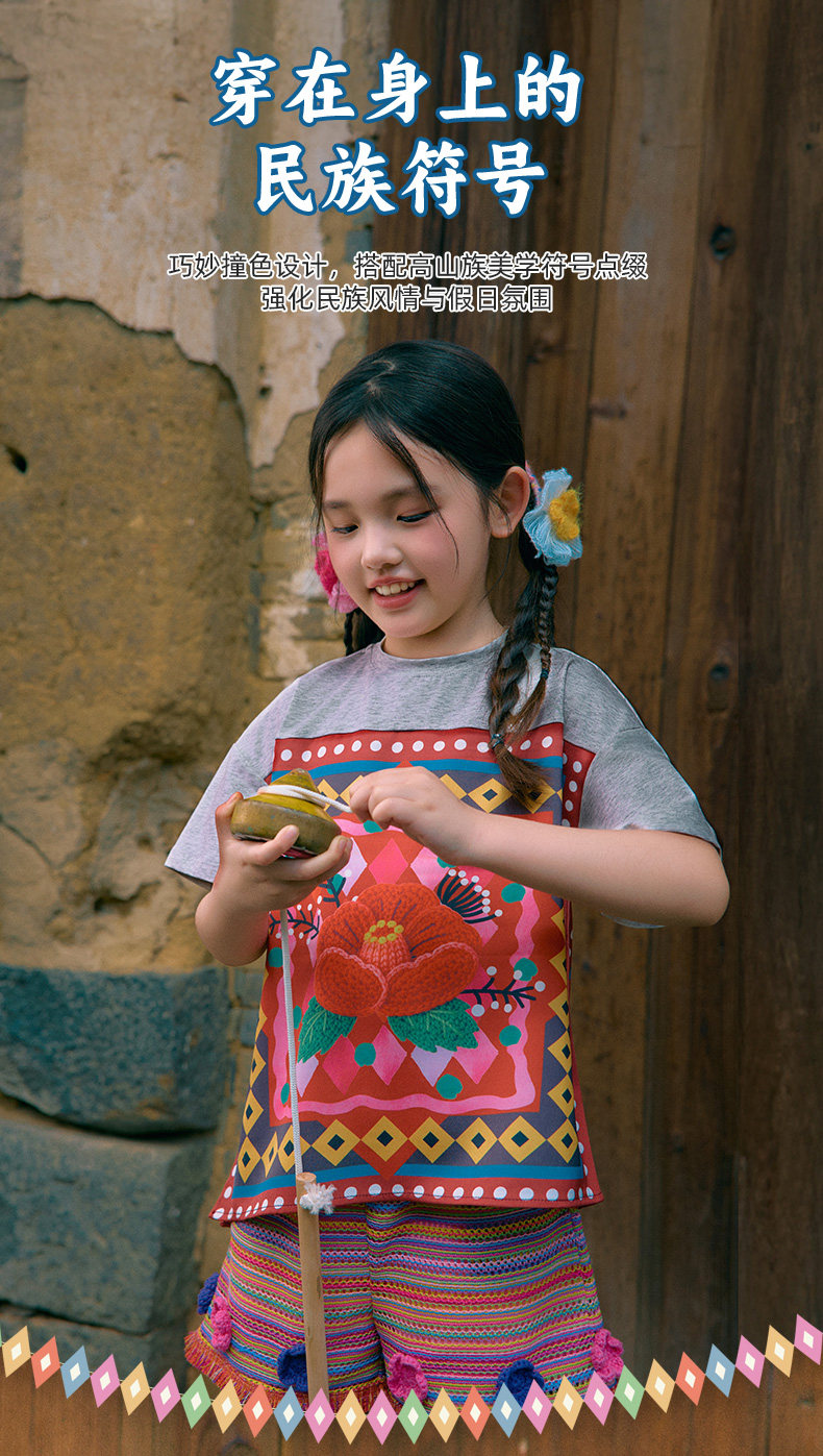 年衣童装儿童短袖T恤女童夏新款民族风凉感女孩印花撞色圆领上衣