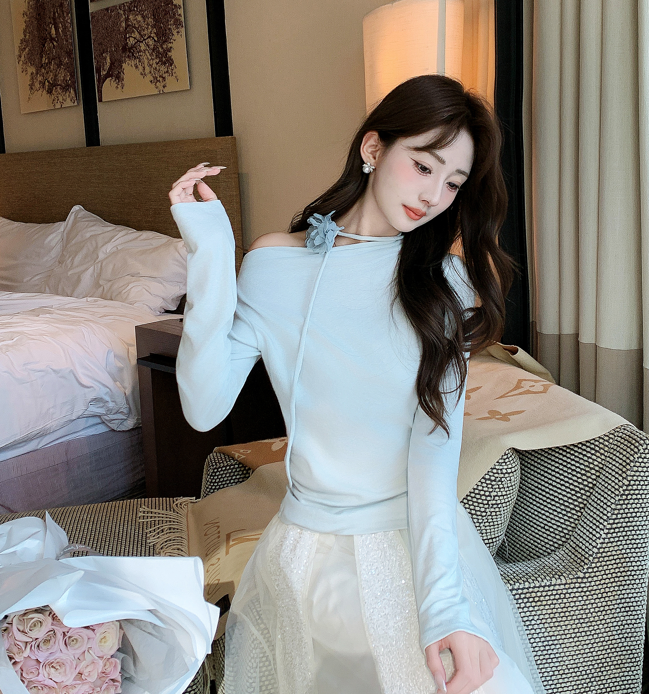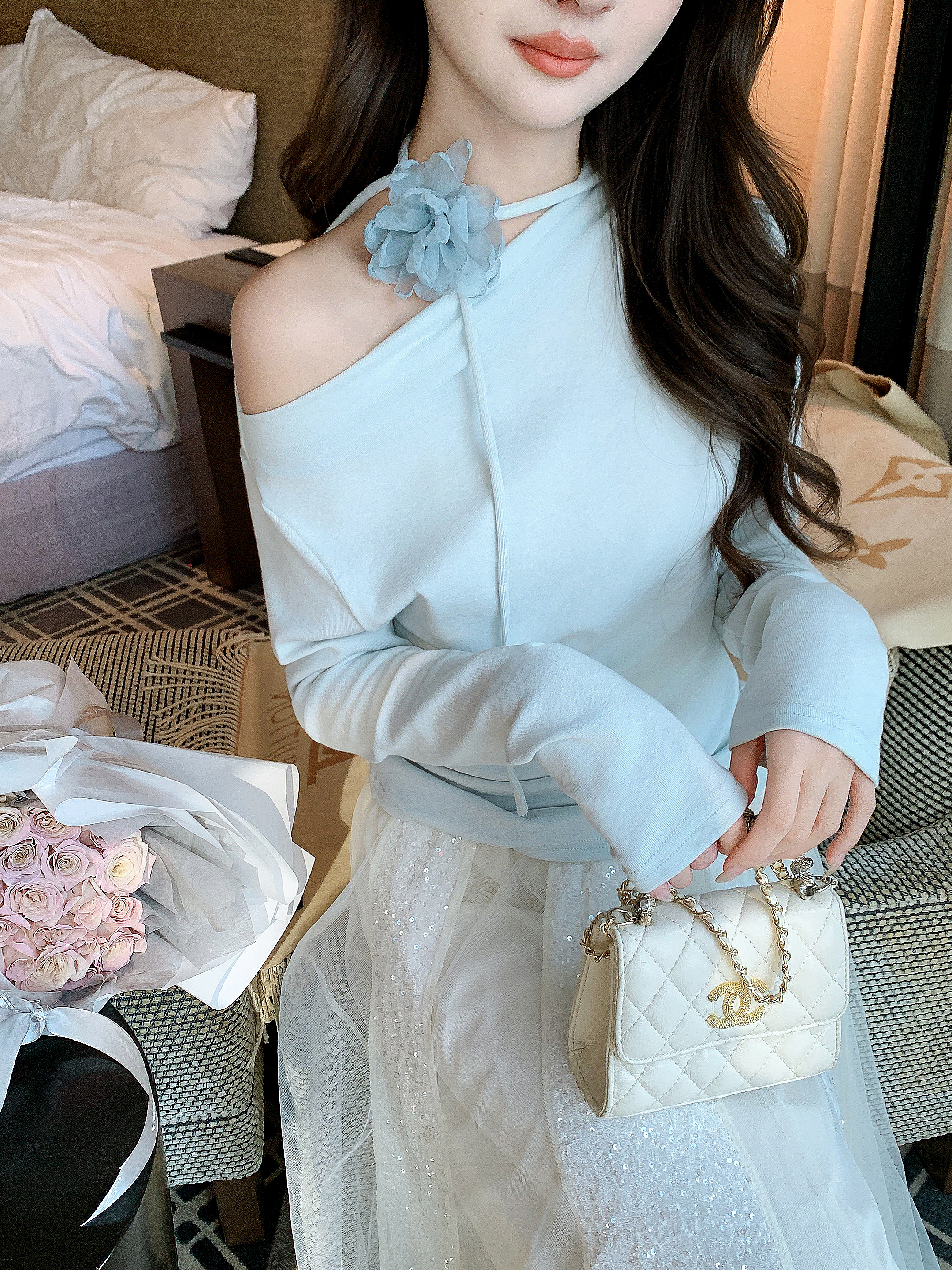 张心子【橘子气泡水】小性感露肩显白气质立体花上衣 U2505039