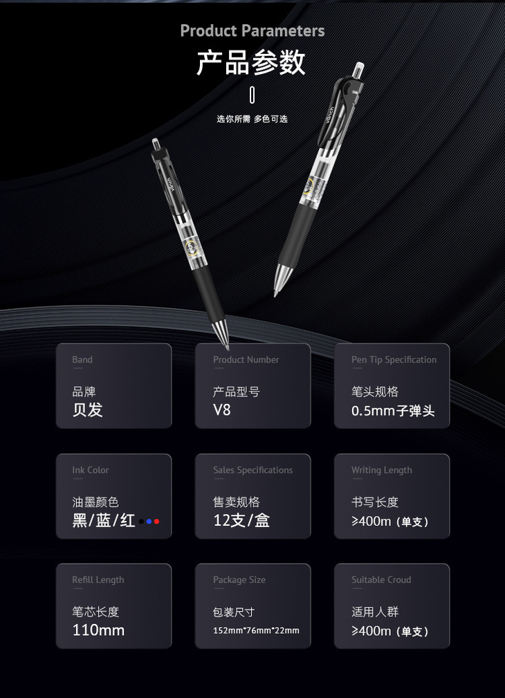🌟简约低调的外表下,是不平凡的“芯”! 🌟书写长度从400m提升至700m! 🌟国家标准的书写长度才200m,v8远高于市面上的普通大容量中性笔! 🌟最重要的是,今天的价格还很香