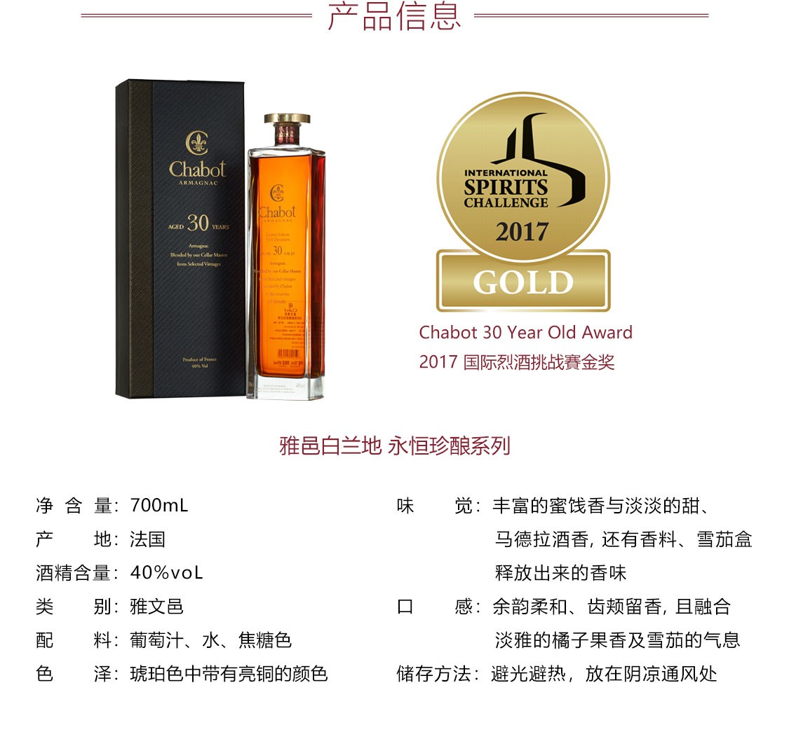 (700ml)戛堡 Chabot 30年 陈酿雅文邑白兰地 Chabot 30 Years Old Armagnac 70cl 「48小时内发货」