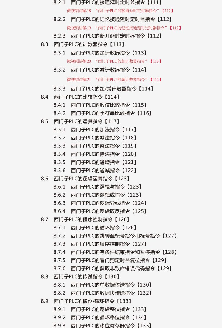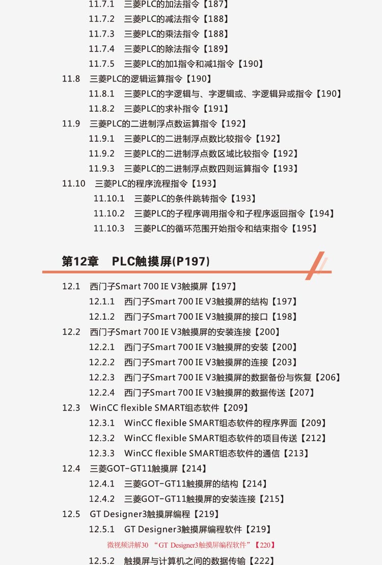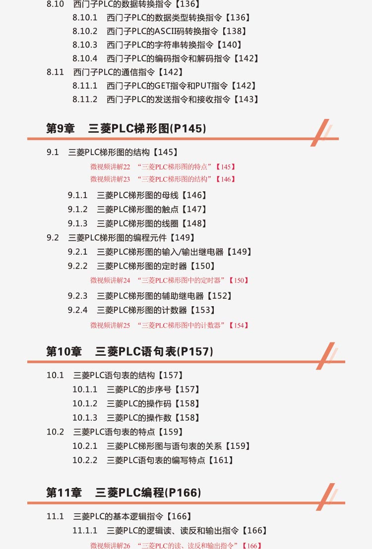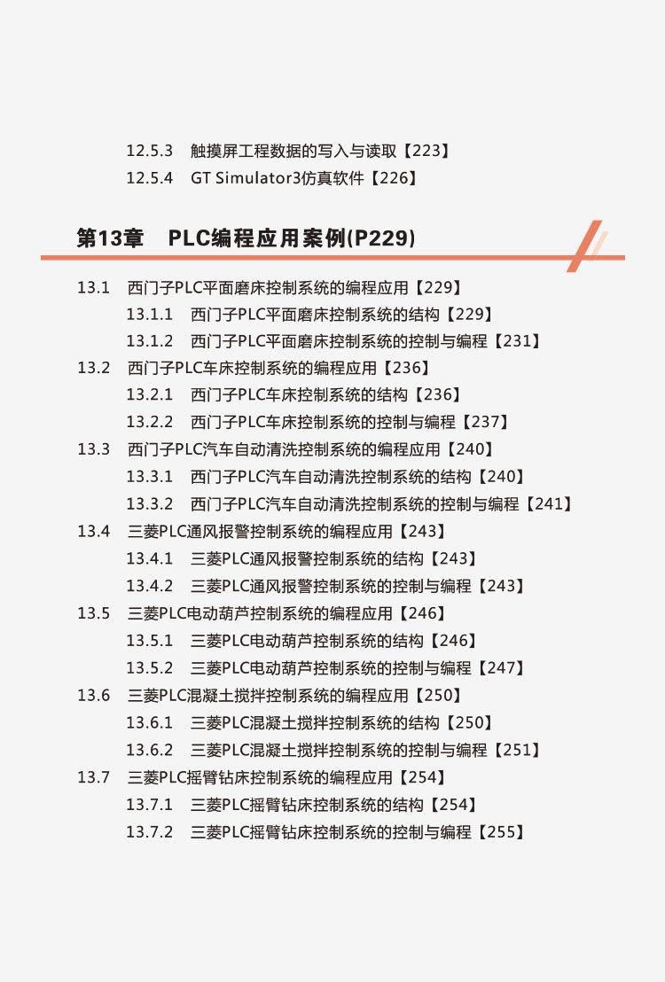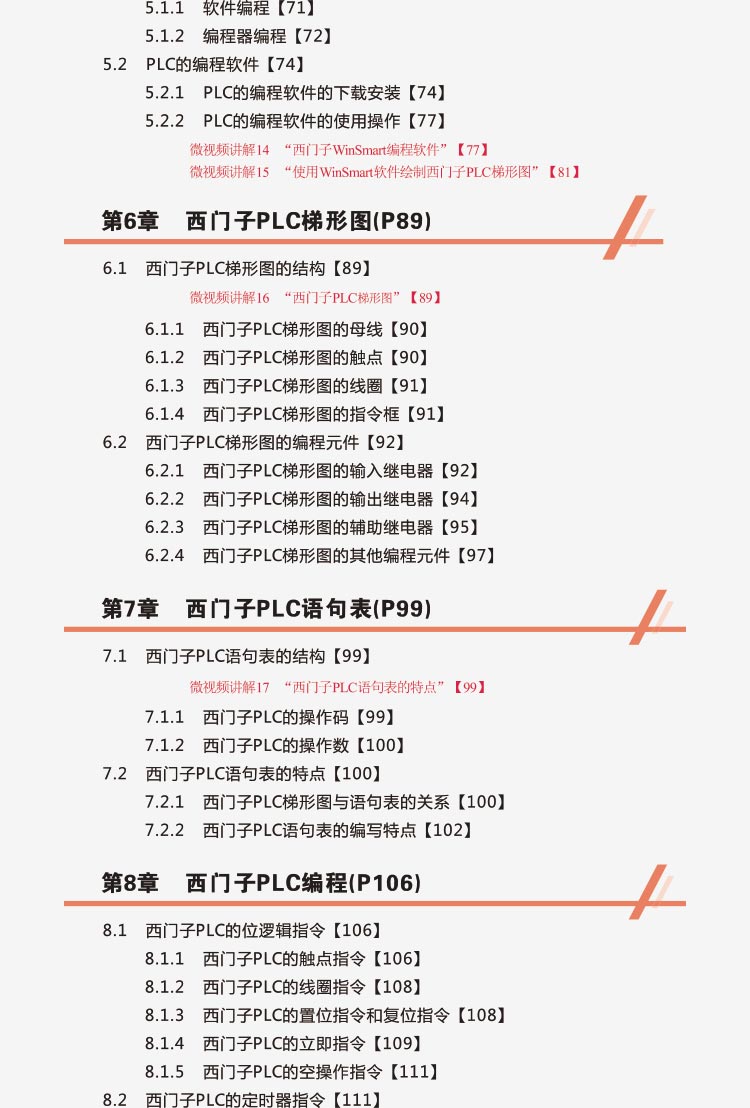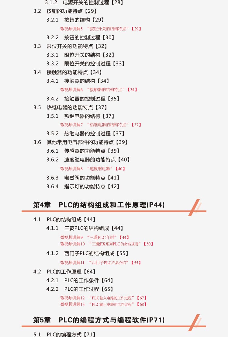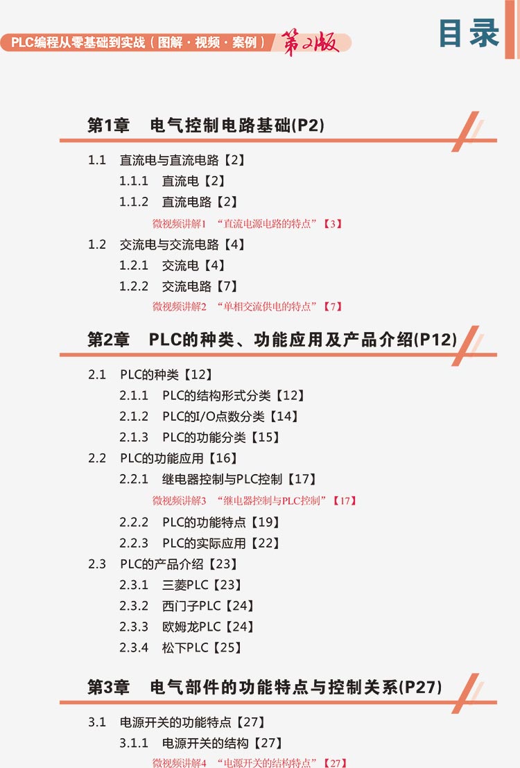 本书内容包含电气控制电路基础、PLC的种类和功能特点、电气部件的功能特点与控制关系、PLC的结构组成和工作原理、PLC的编程方式与编程软件、西门子PLC梯形图、西门子PLC语句表、西门子PLC编程、三菱PLC梯形图、三菱PLC语句表、三菱PLC编程、PLC触摸屏、PLC编程应用案例等。
