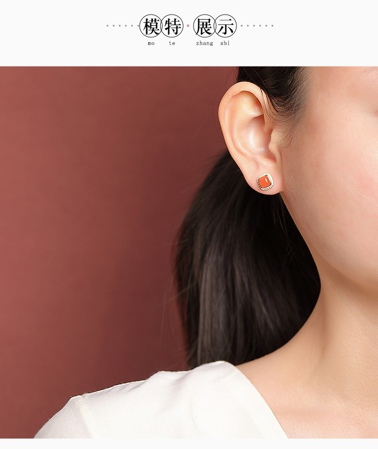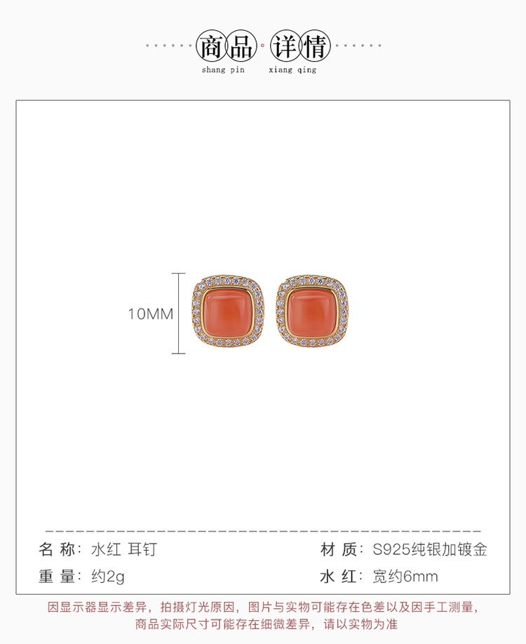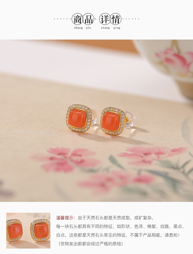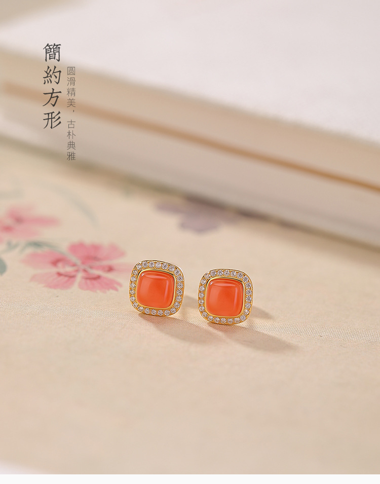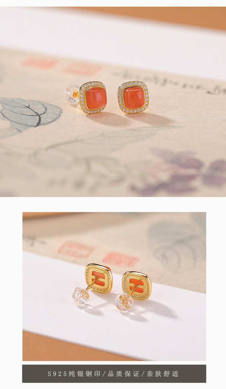 【昭华予安】S925纯银镀金水红南红玛瑙几何方形耳饰【CW-ED04640】