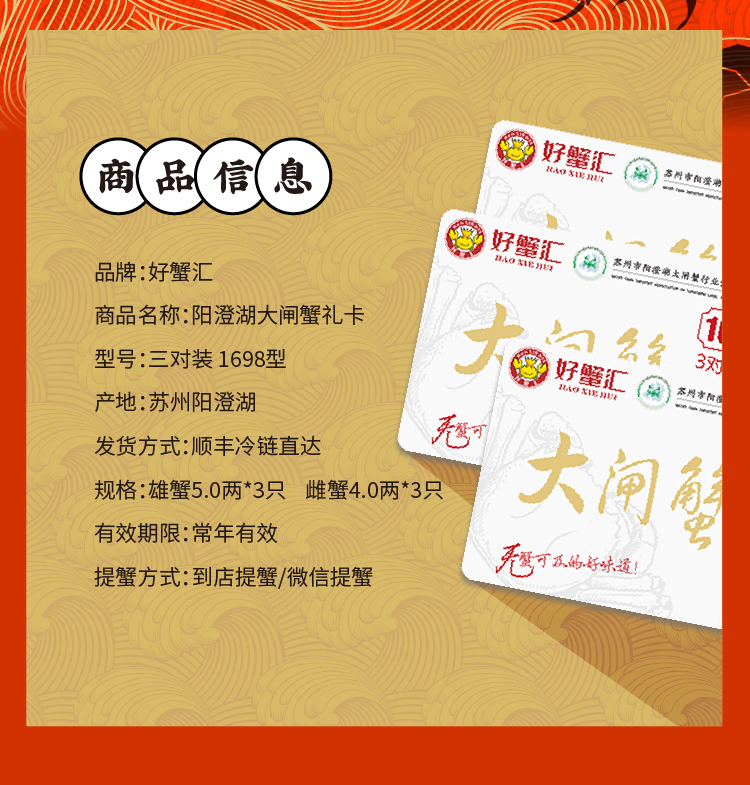 【无蟹不欢】好蟹汇至尊上品1698 型雄蟹5.0 两*3 只雌蟹4.0 两*3 只 三对装 礼券
