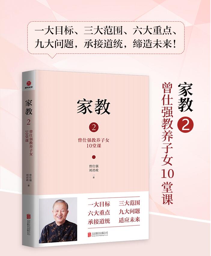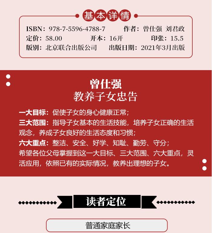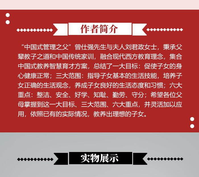 “中国式管理之父”曾仕强先生与夫人刘君政女士,秉承父辈教子之道和中国传统家训,融合现代西方教育理念,集合中国式教养智慧育才方案,总结了一大目标:促使子女的身心健康正常;三大范围:指导子女基本的生活技能,培养子女正确的生活观念,养成子女良好的生活态度和习惯;六大重点:整洁、安全、好学、知耻、勤劳、守分;希望各位父母掌握到这一大目标、三大范围、六大重点,并灵活加以应用,依照已有的实际情况,教养出理想的子女。