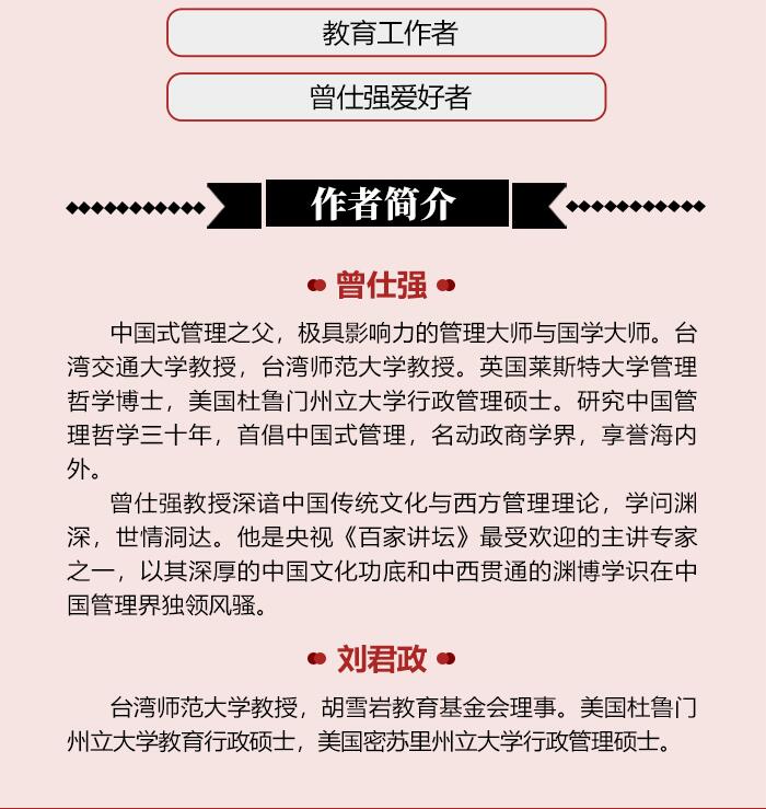 曾仕强教授深谙中国传统文化与西方管理理论, 学问渊深,世情洞达。他是央视《百家讲坛》受欢迎的主讲专家之一,以其深厚的中国文化功底和中西贯通的渊博学识在中国管理界独领风骚。