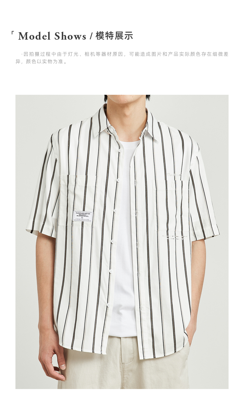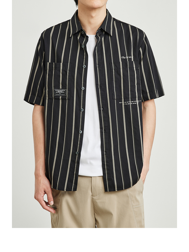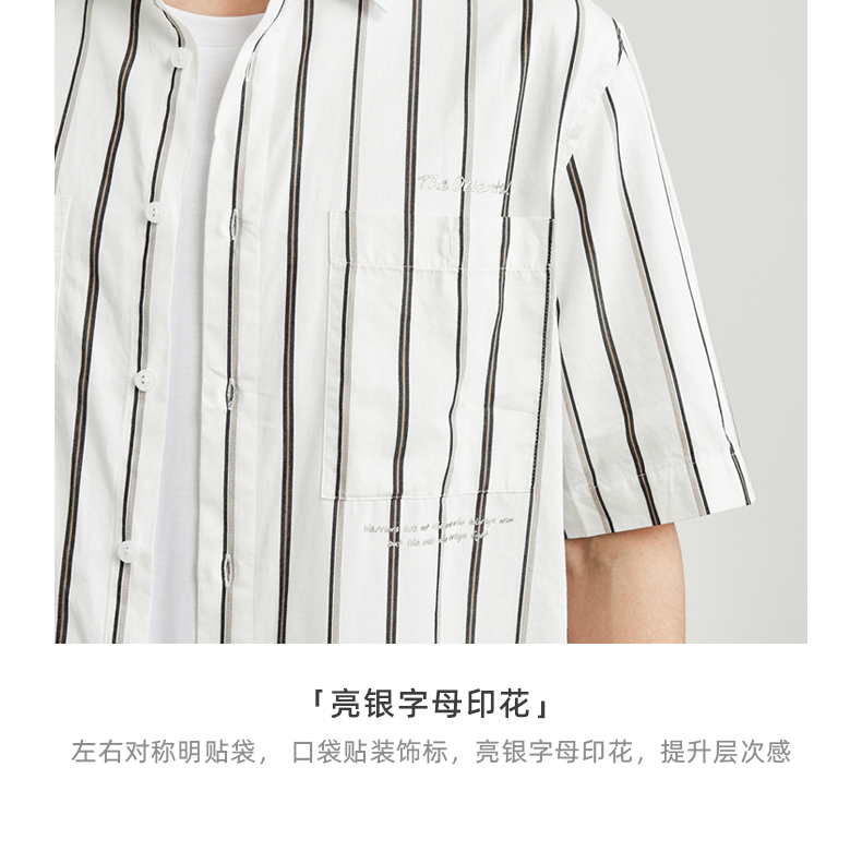 墨麦客2022夏季新款男装条纹字母印花立体贴袋短袖衬衫男50081