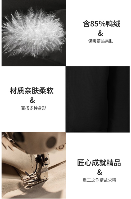 ✅核心狠料——85%高绒子含量大朵鸭绒 填充的不是普通羽毛,而是高品质大朵鸭绒 确保保暖力持久、不塌陷 绒子含量高达85%,蓬松度更佳 锁住空气形成强力保暖层 像随身携带的轻暖“小堡垒” 寒风再嚣张也难侵入