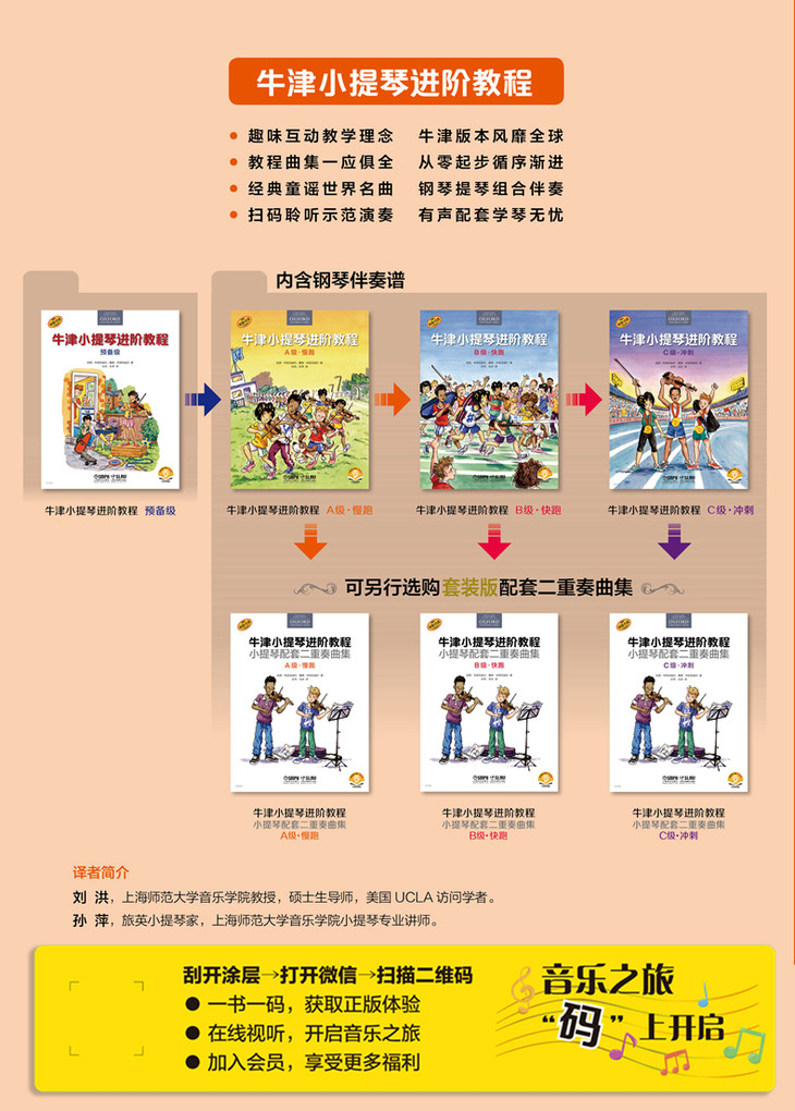 “牛津小提琴进阶教程” 系列是一套充满趣味性的小 提琴进阶教程。教程选曲丰 富,不仅有传统民谣作品, 还有从亨德尔到莫扎特等著 名作曲家的作品,以及雷格 泰姆、弗拉门戈等不同风格 的原创作品。该教程为彩色 版,图谱结合,程度由简到 难,学习者从零起步循序渐 进。随书附赠扫码音频示范 加伴奏,有声配套学琴无忧 ,帮助孩子们在学琴路上快 乐成长。