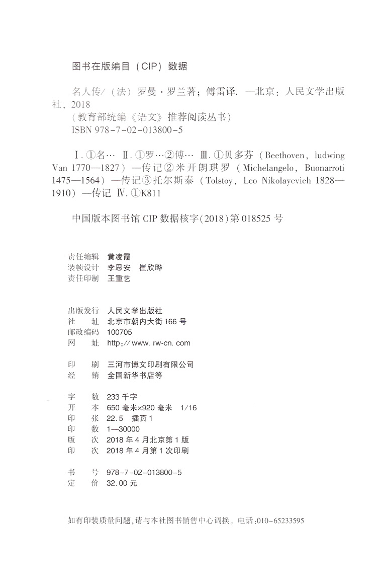 名人传 罗曼罗兰著人民文学出版社 正版现货部 统编语文阅读 经典名著口碑版中学生语文自主阅读名著书目课本教材学校