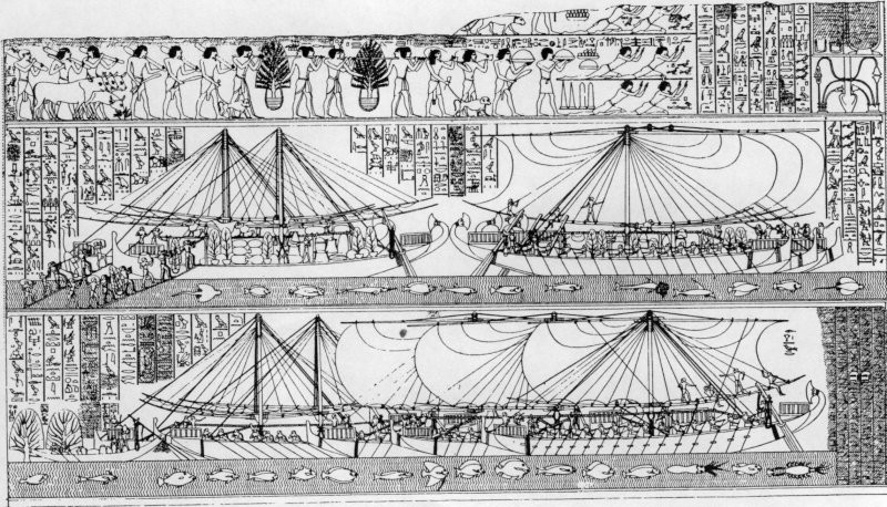 米诺斯王国时期,米诺斯的桨帆船已进入成熟阶段,船首和船尾高翘,船尾有艉楼,左右各有一个水手操舵桨,两舷有多名桨手。这种平底帆船的中部立有高大桅杆,桅杆可以放倒和卸下。画中进入港口的桨帆船,已用生牛皮编成的帆索将巨大的风帆卷了起来。船上似乎没有装甲板,堆有货物,看上去都是商船。画中还绘有大陆,有通海的河流,有动植物,有楼房,有集市……表现出3600多年前爱琴海上繁忙的贸易景象。