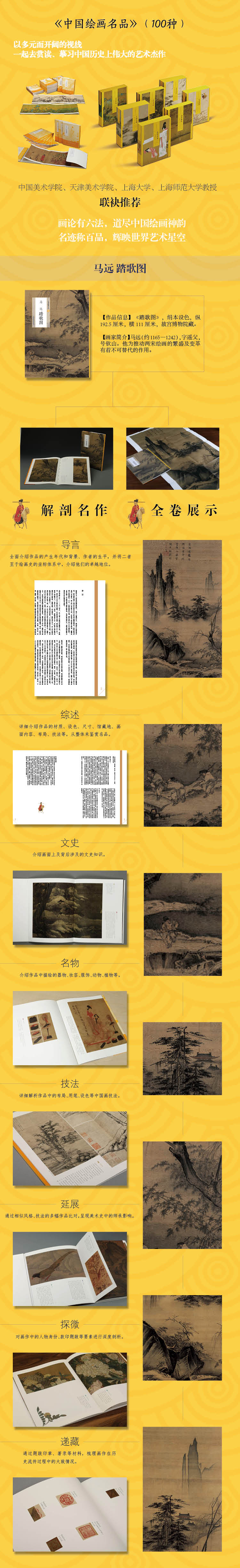 本书为《中国绘画名品》之《马远踏歌图》。宋人踏歌是当时广泛流行的活动,踏歌者的身份也无所不包,既有士大夫,也有普通民众。各种季节、各种场合都有踏歌的活动,马远所绘的《踏歌图》便是表现这一主题的画作。画中几位老者,动作活泼,手舞足蹈,旁边的妇人和小孩正在观看。远处有缥缈朦胧的城池宫殿,与近景的踏歌场景组合在一幅作品上,体现了绘画从属于政治的宣传教化功用。