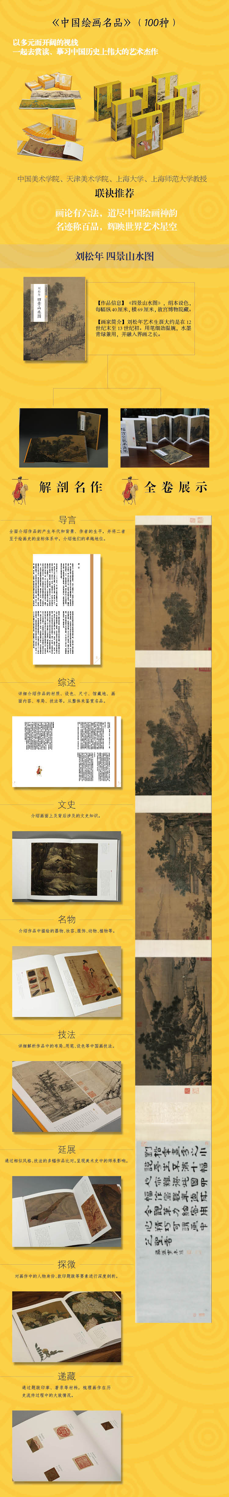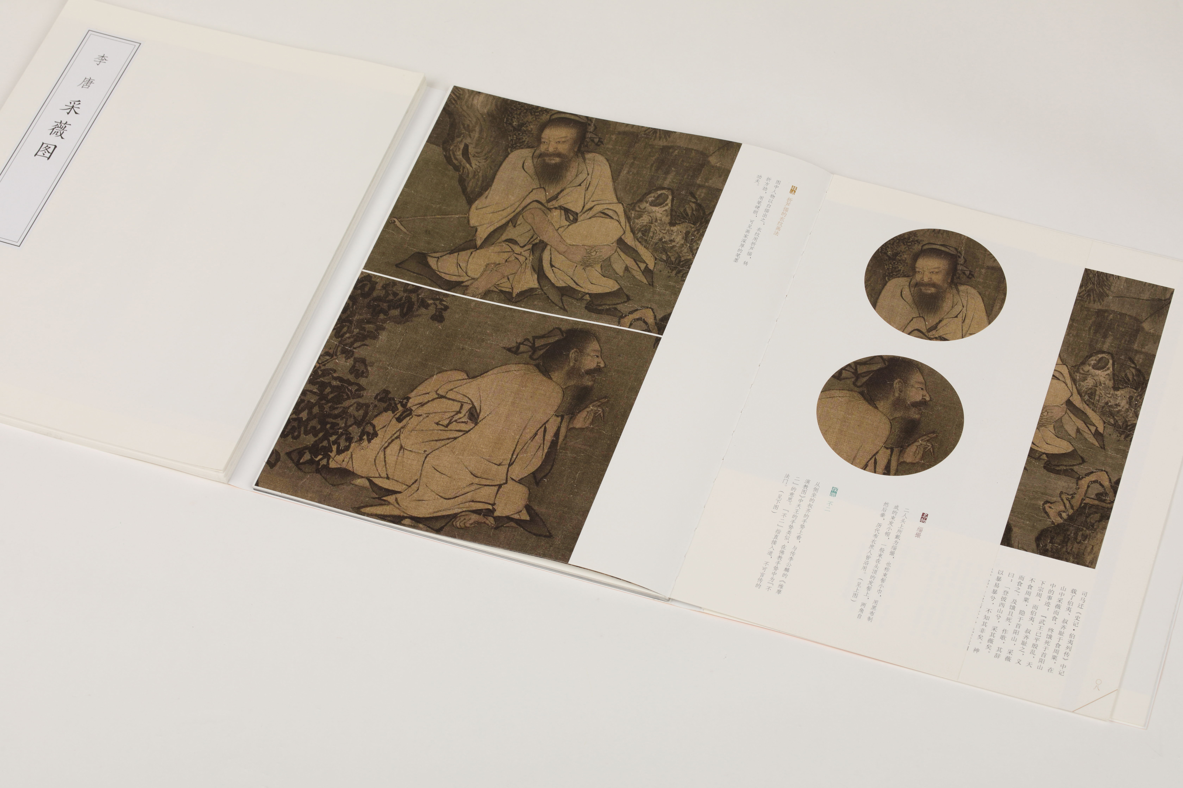 本稿为《中国绘画名品》之《李唐 采薇图 万壑松风图》。这两张画都是李唐存世的代表作,《采薇图》为人物故实画,描绘的是伯夷、叔齐采薇而食的历史故事,与李唐另一张《晋文公复国图》均为研究李唐这类作品的范本。而《万壑松风图》为巨轴式山水画,李唐是北宋至南宋过渡时期的画家,他的画风即继承了北宋的雄浑壮观,又开启了南宋画风,而《万壑松风图》即体现了这种特征,这张画也成为巨幅山水的绝响。《中国绘画名品》为上海书画出版社继《中国书法名品》后的又一以中国美术史中经典作品为主体的系列丛书,本丛书选取了自魏晋至清末的经典绘画作品,以单幅作品、同画家的作品、同主题的作品、同题材的作品等为个体,预计出版100本。每本均由整幅拉页及分段赏析两部分组成,在分段赏析部分通过文字导读,将绘画中所呈现的情节、技法及绘画背后所蕴含的艺术、历史、文化涵意展现给读者。在行文上分为整图拉页、综述、作者介绍、辑封、作品简述、分段解析、递藏八个部分。