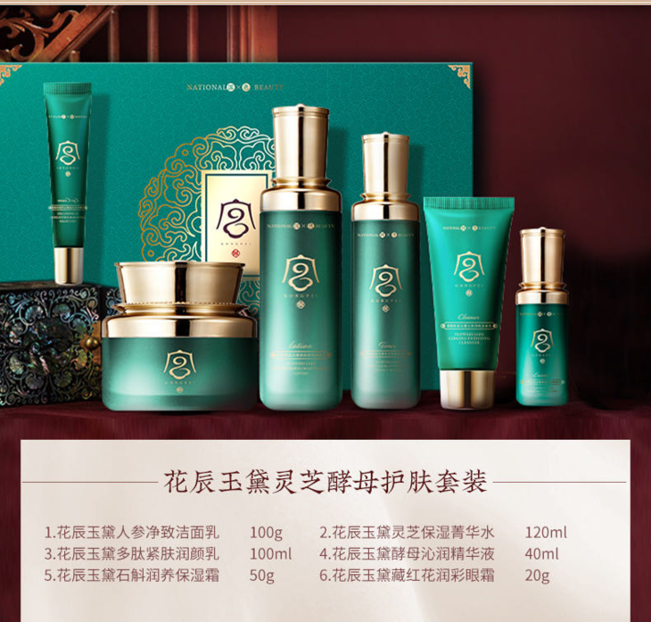 【规格】花辰玉黛人参净致洁面乳100g+花辰玉黛灵芝保湿菁华水120ml+花辰玉黛多肽紧肤润颜乳100ml+花辰玉黛酵母沁润精华液40ml+花辰玉黛石斛润养保湿霜50g+花辰玉黛藏红花润彩眼霜20g