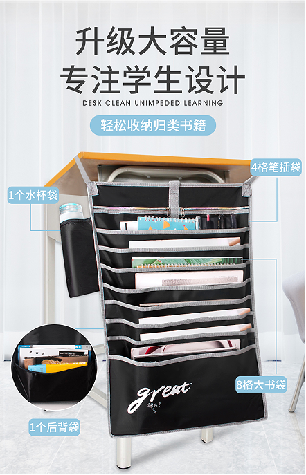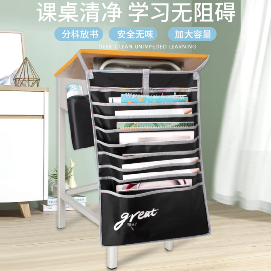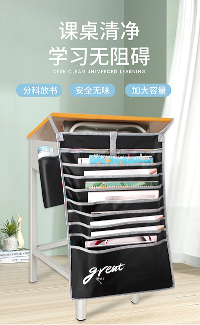 你的桌面是不是放满东西,各学科试卷统统摆到课桌上,书堆得高高的。 这样拿书费劲,空间拥挤,做作业又不舒服。这其实是你学习生产力的最大杀手! 古人说得好:“工欲善其事,必先利其器。” 拥有一个桌面收纳神器挂书袋,让桌面整齐,学习才无碍