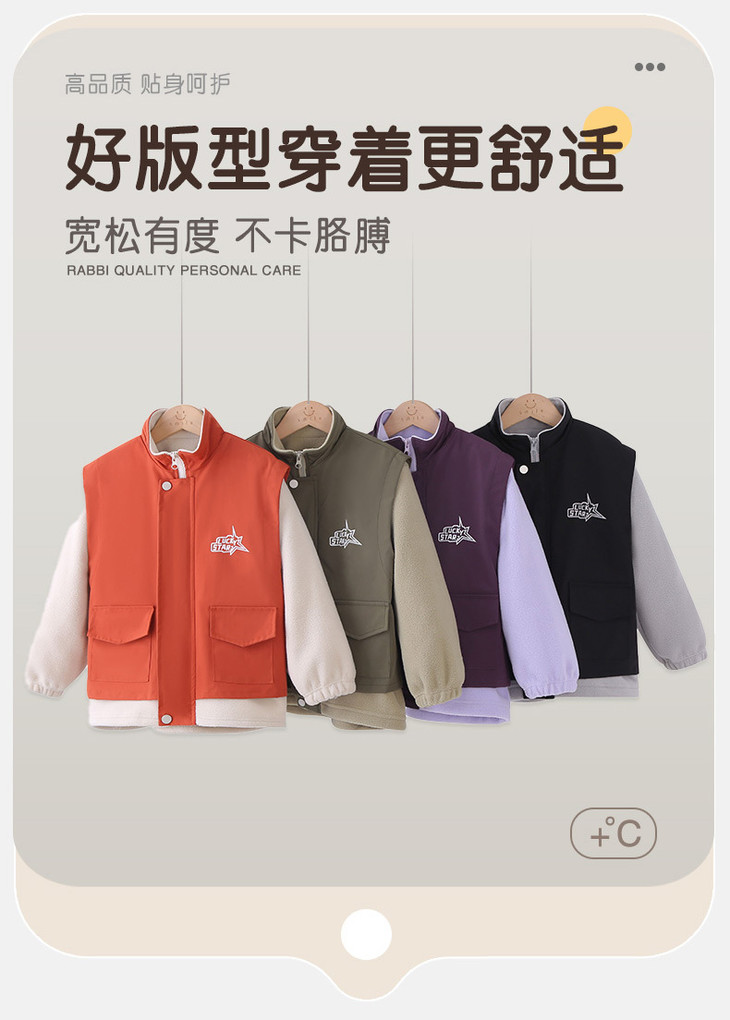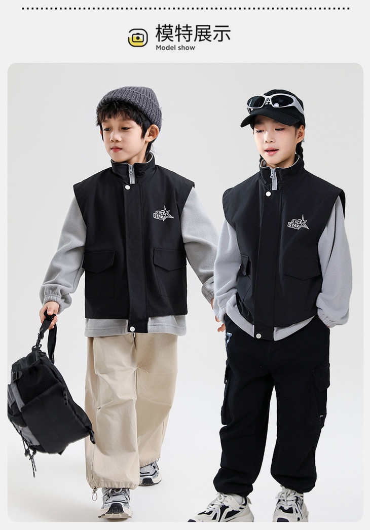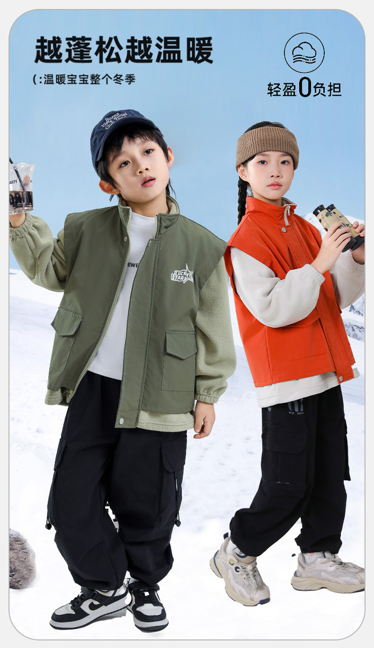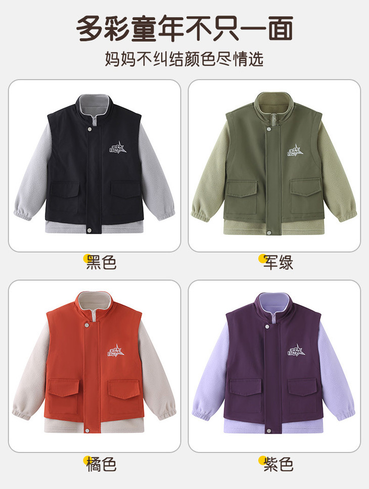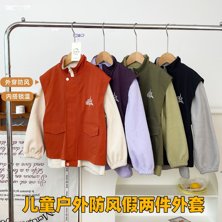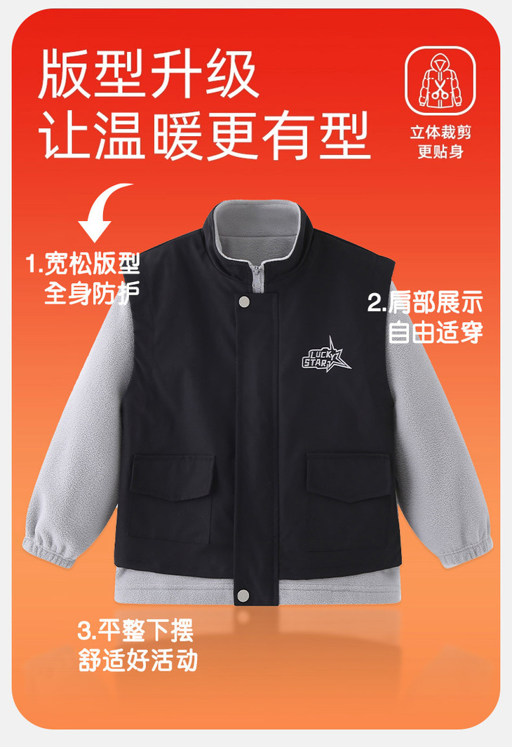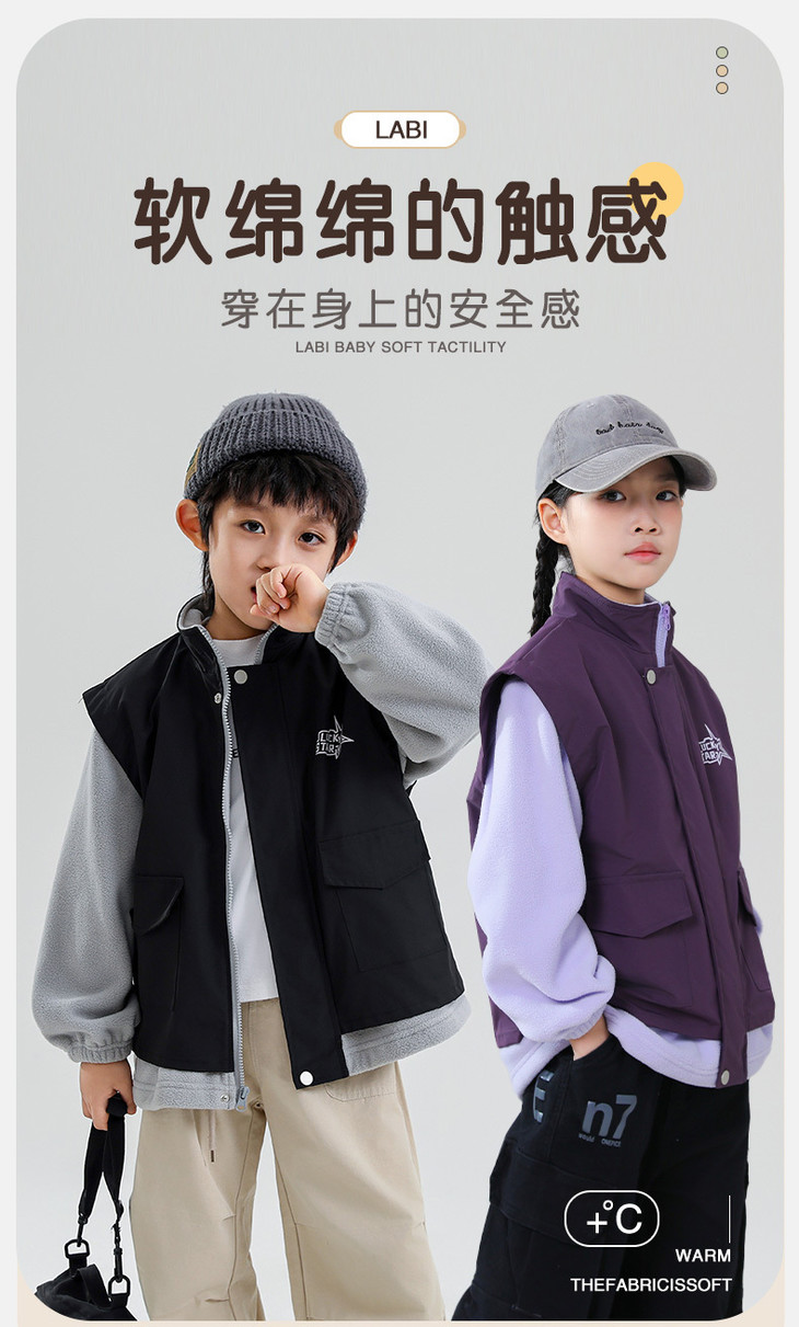 降温天气里,孩子户外活动怎么穿?这款儿童户外防风假两件外套解决了这个难题! 里层摇粒绒保暖,外层马甲防风防水溅,完美组合让宝贝在秋冬季户外活动中温暖又自在。 ✅ 假两件设计:外层防风马甲采用专业防风防水面料,轻松应对春秋微风和冬季寒风; 里层摇粒绒内里柔软亲肤,有效锁住体温,抵御寒冷。一件衣服两种保护,轻松应对10度以上温差变化! ✅ 轻盈保暖不臃肿:采用轻量梭织面料,比普通纯棉填充更加轻盈且更加保暖,孩子活动自如,跑跳无忧。 立体剪裁,宽松不松垮,对胖瘦宝宝包容度都超高。