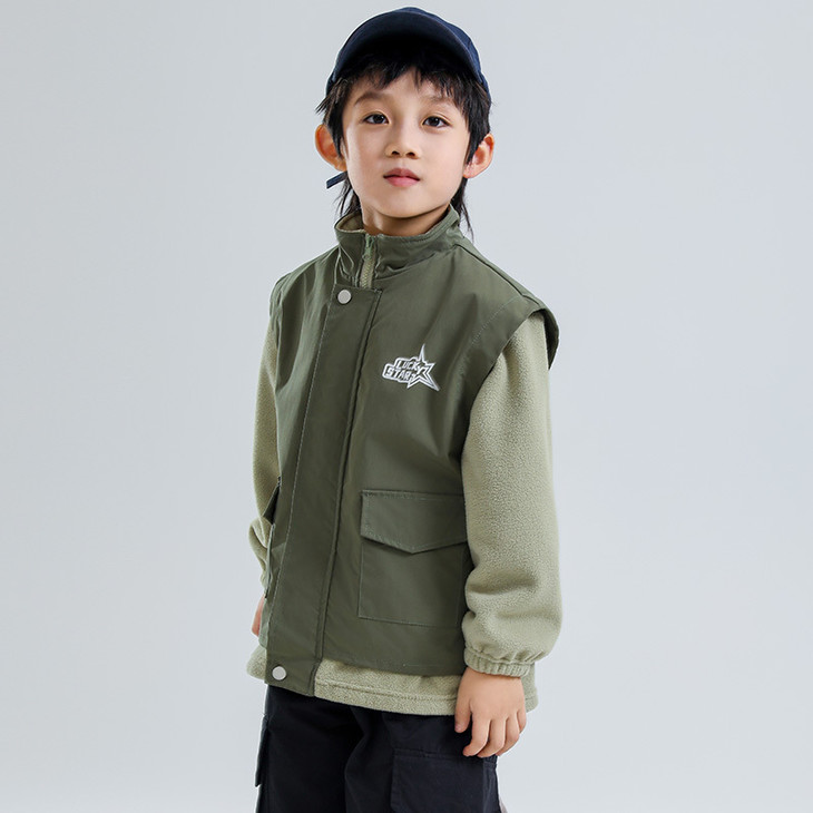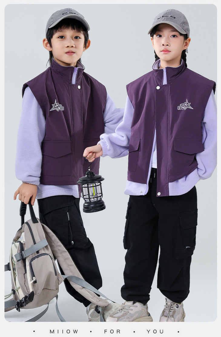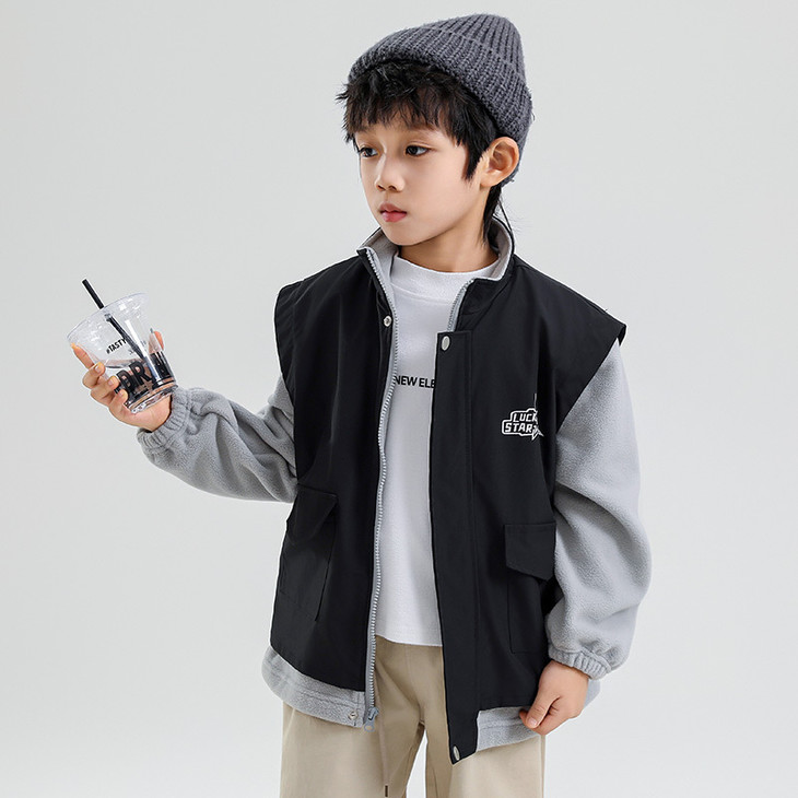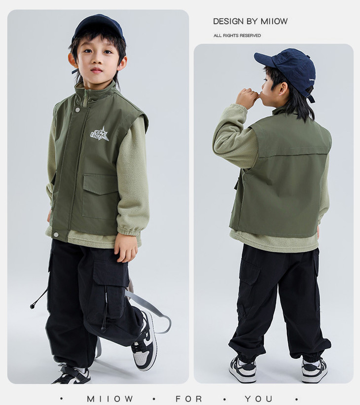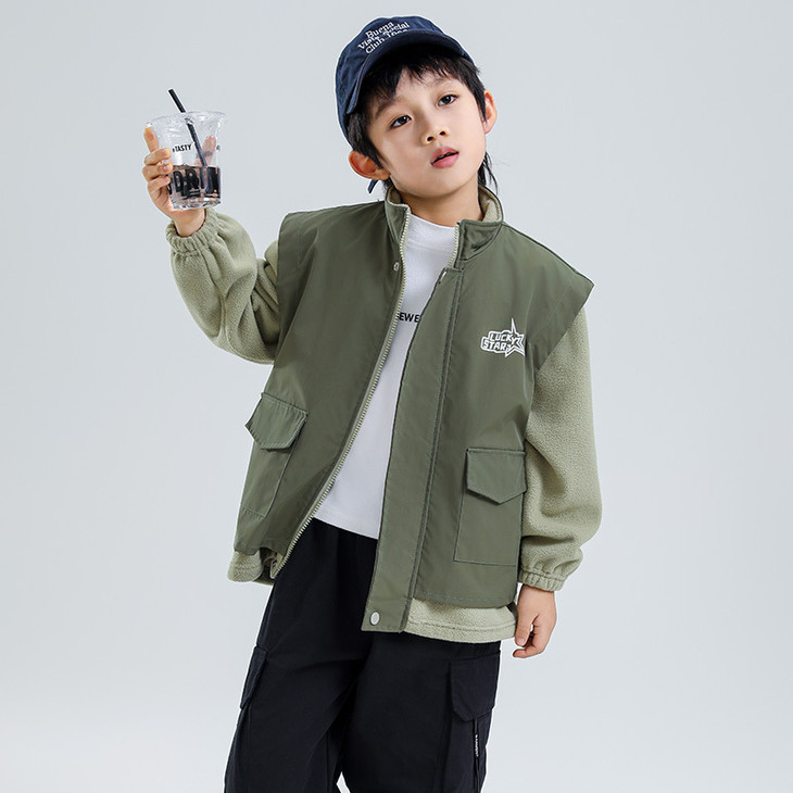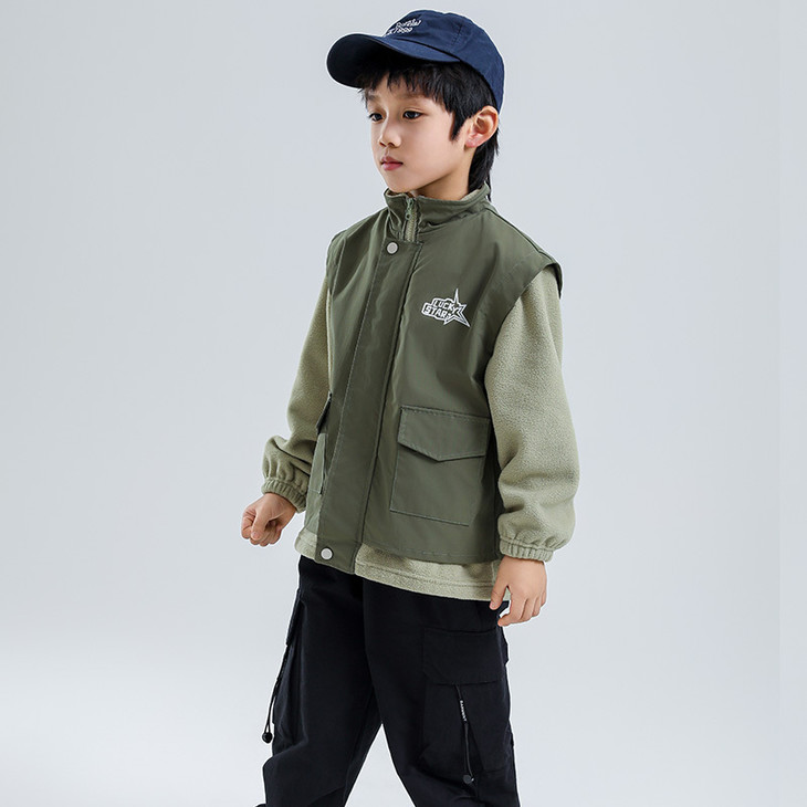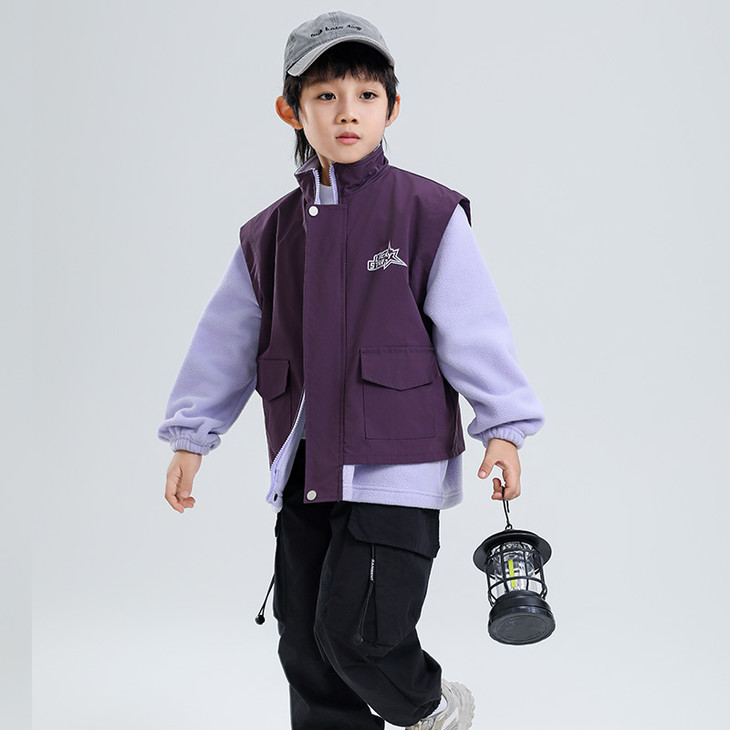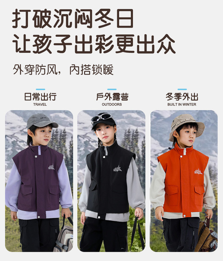 降温天气里,孩子户外活动怎么穿?这款儿童户外防风假两件外套解决了这个难题! 里层摇粒绒保暖,外层马甲防风防水溅,完美组合让宝贝在秋冬季户外活动中温暖又自在。 ✅ 假两件设计:外层防风马甲采用专业防风防水面料,轻松应对春秋微风和冬季寒风; 里层摇粒绒内里柔软亲肤,有效锁住体温,抵御寒冷。一件衣服两种保护,轻松应对10度以上温差变化! ✅ 轻盈保暖不臃肿:采用轻量梭织面料,比普通纯棉填充更加轻盈且更加保暖,孩子活动自如,跑跳无忧。 立体剪裁,宽松不松垮,对胖瘦宝宝包容度都超高。