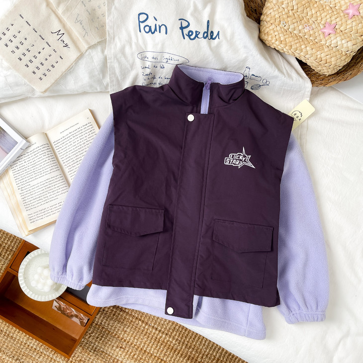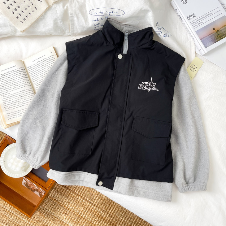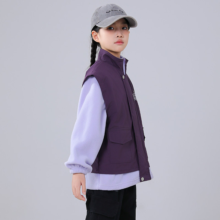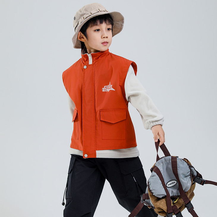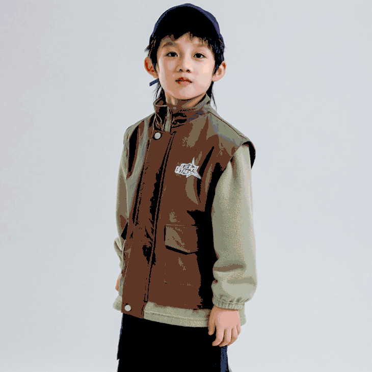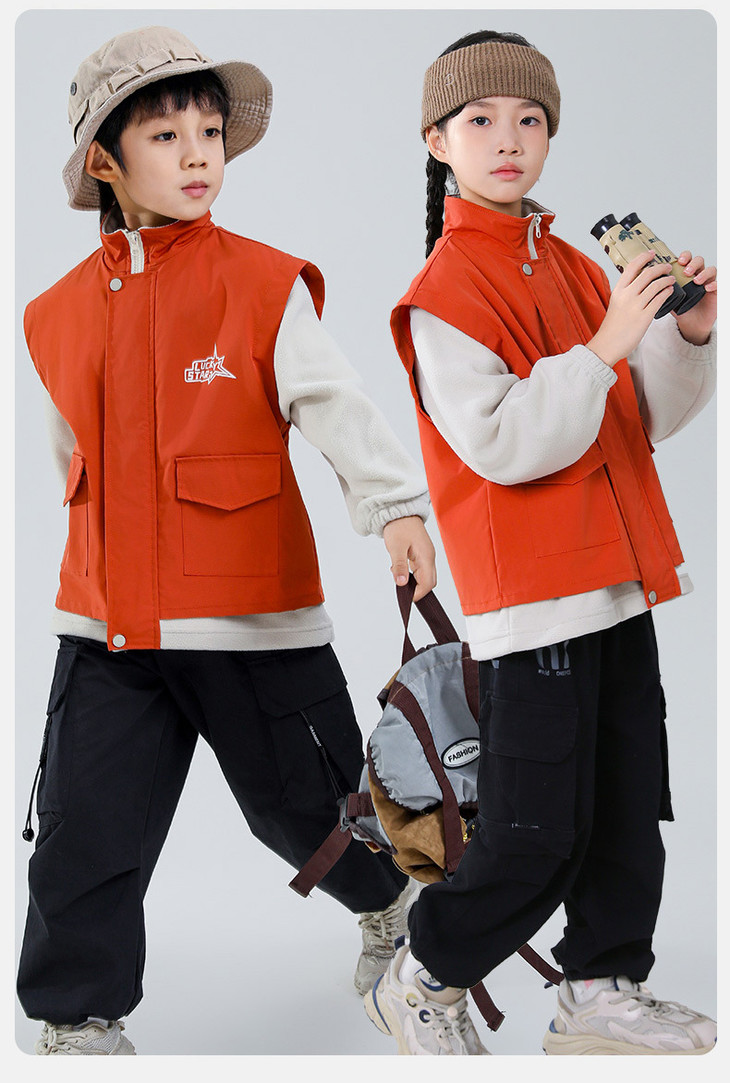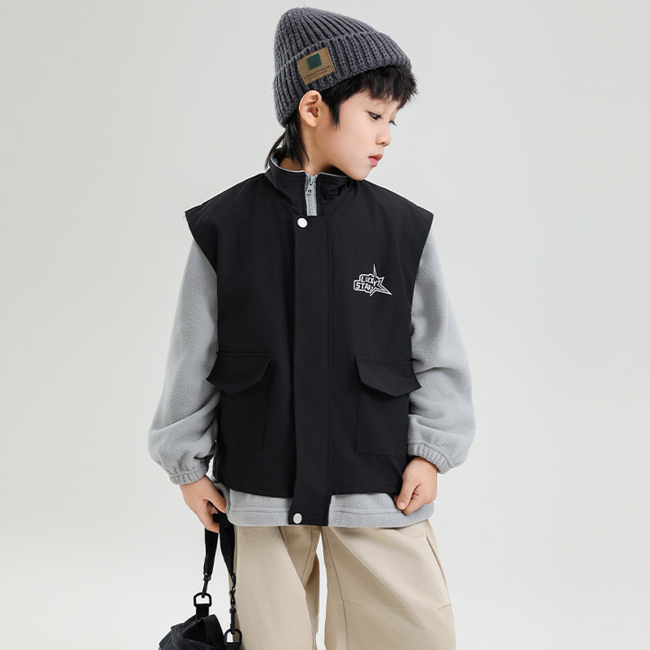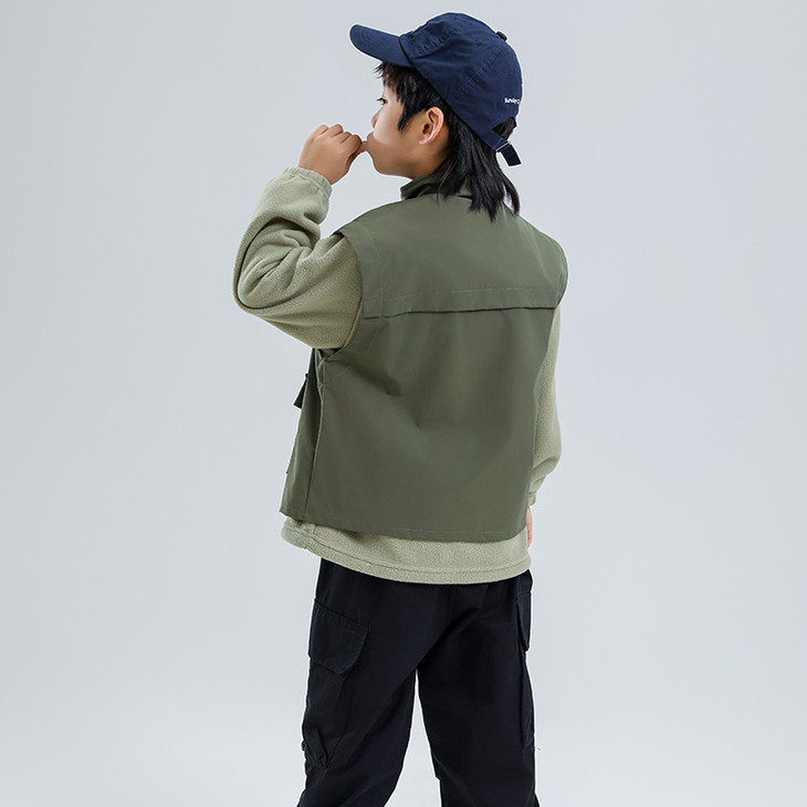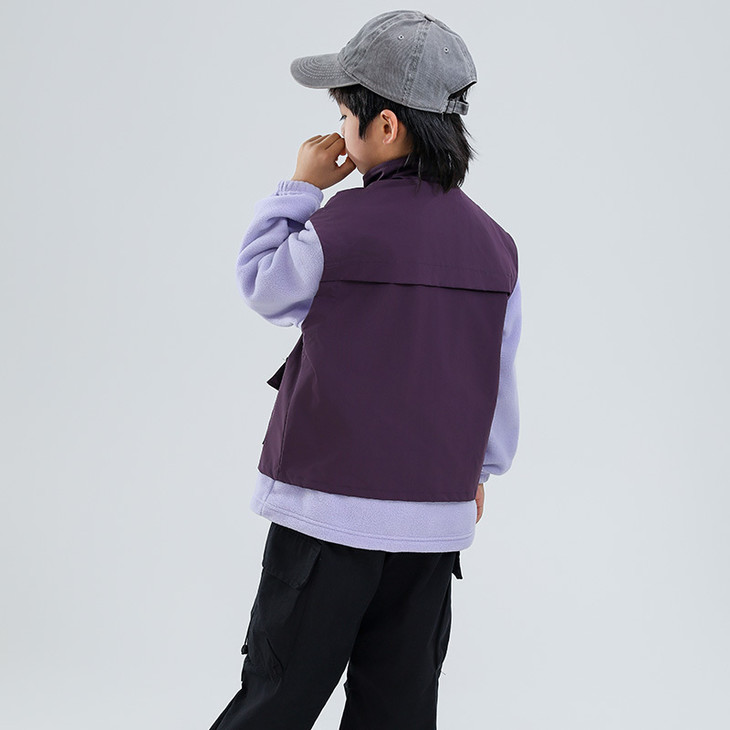 降温天气里,孩子户外活动怎么穿?这款儿童户外防风假两件外套解决了这个难题! 里层摇粒绒保暖,外层马甲防风防水溅,完美组合让宝贝在秋冬季户外活动中温暖又自在。 ✅ 假两件设计:外层防风马甲采用专业防风防水面料,轻松应对春秋微风和冬季寒风; 里层摇粒绒内里柔软亲肤,有效锁住体温,抵御寒冷。一件衣服两种保护,轻松应对10度以上温差变化! ✅ 轻盈保暖不臃肿:采用轻量梭织面料,比普通纯棉填充更加轻盈且更加保暖,孩子活动自如,跑跳无忧。 立体剪裁,宽松不松垮,对胖瘦宝宝包容度都超高。