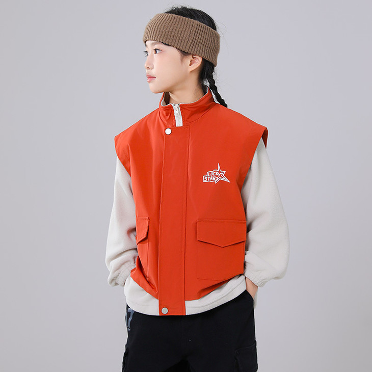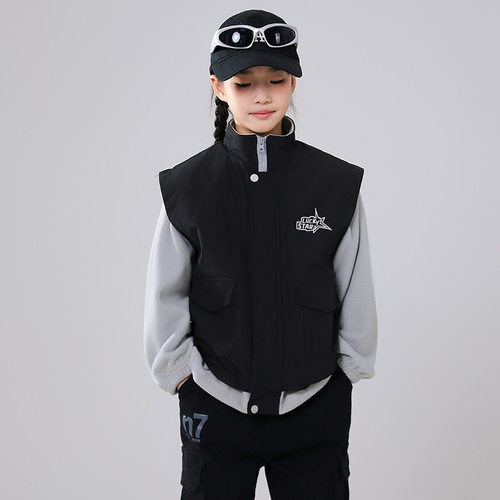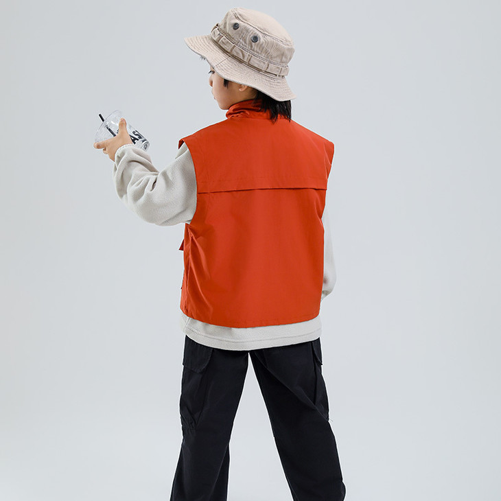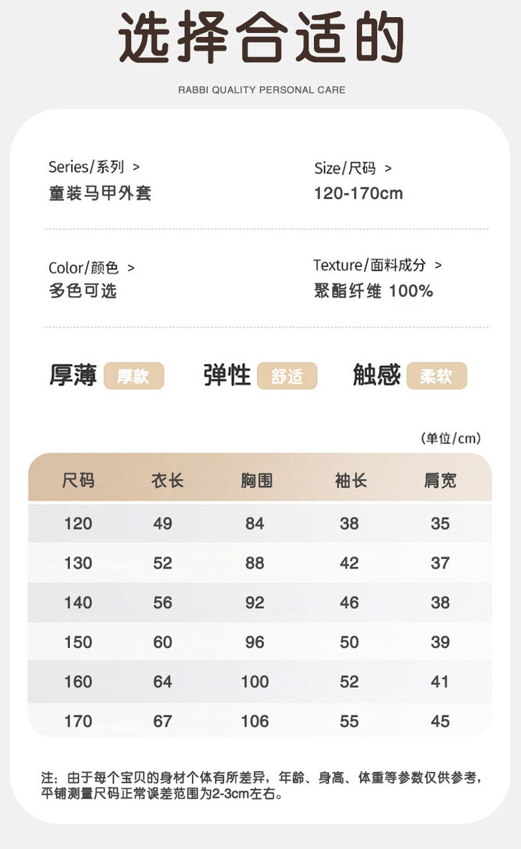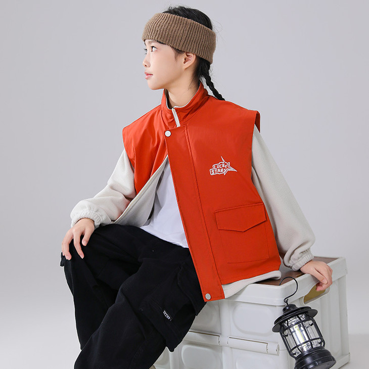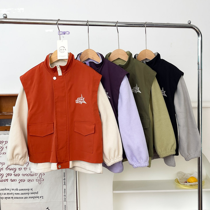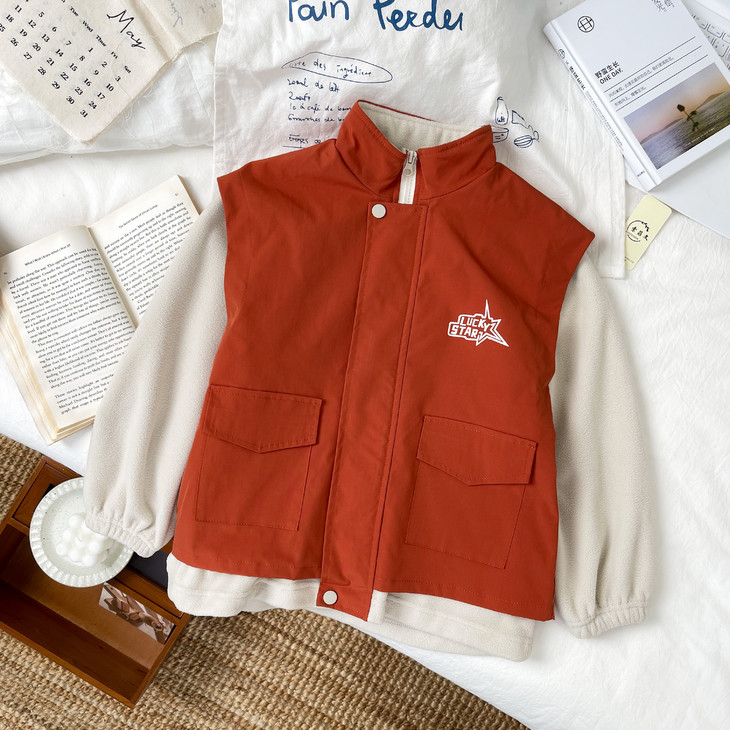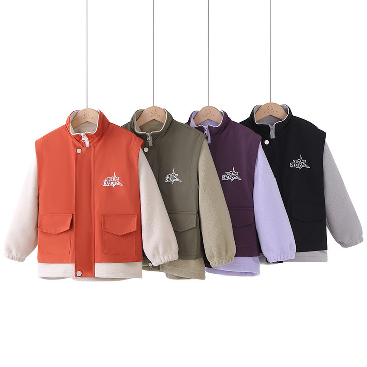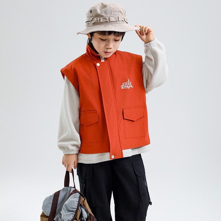 降温天气里,孩子户外活动怎么穿?这款儿童户外防风假两件外套解决了这个难题! 里层摇粒绒保暖,外层马甲防风防水溅,完美组合让宝贝在秋冬季户外活动中温暖又自在。 ✅ 假两件设计:外层防风马甲采用专业防风防水面料,轻松应对春秋微风和冬季寒风; 里层摇粒绒内里柔软亲肤,有效锁住体温,抵御寒冷。一件衣服两种保护,轻松应对10度以上温差变化! ✅ 轻盈保暖不臃肿:采用轻量梭织面料,比普通纯棉填充更加轻盈且更加保暖,孩子活动自如,跑跳无忧。 立体剪裁,宽松不松垮,对胖瘦宝宝包容度都超高。