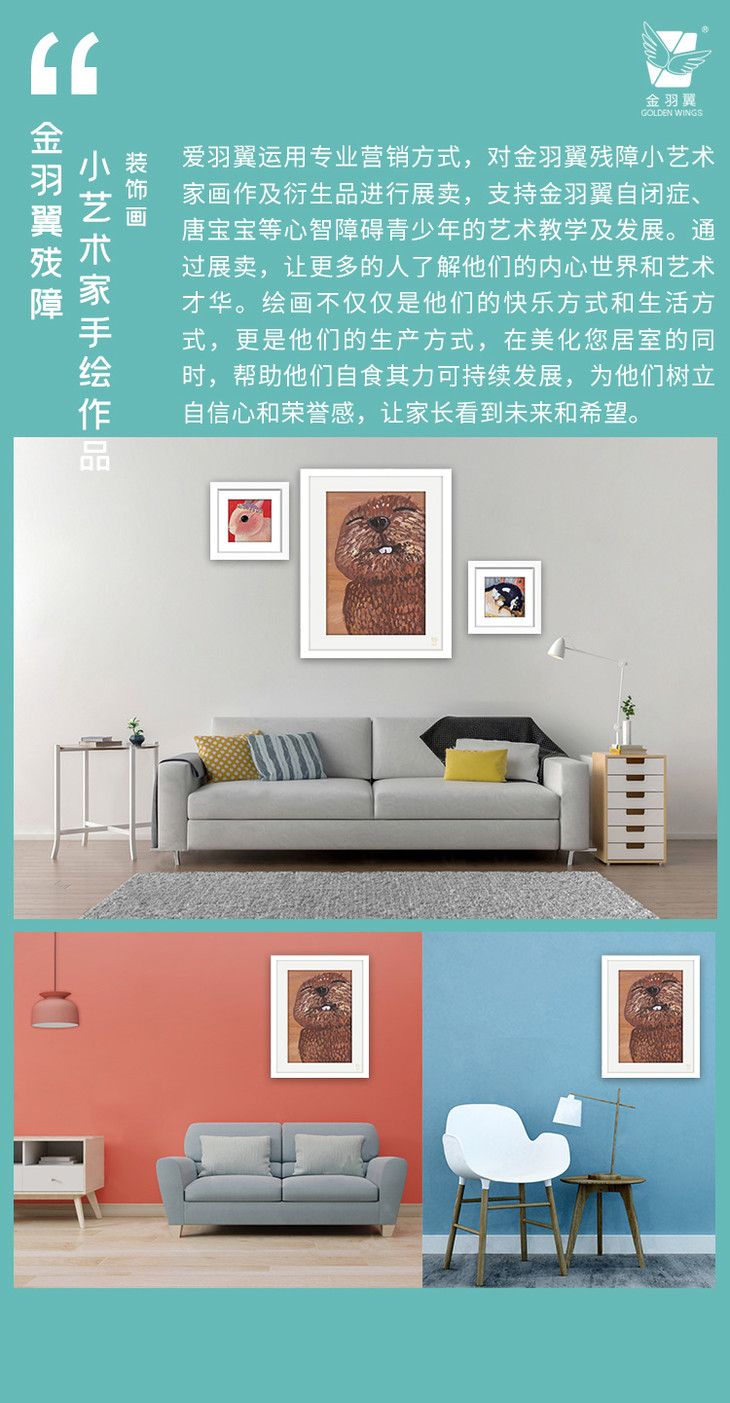 金羽翼将艺术与心理治疗相结合,用艺术教育的形式帮助残障青少年体现自身价值、提高生活质量、实现艺术梦想,并将绘画作品开发成衍生品销售,收入扣除成本后,20%返还给学员家庭,80%用于金羽翼艺术康复教学。