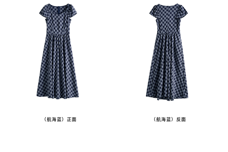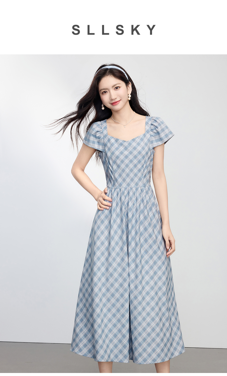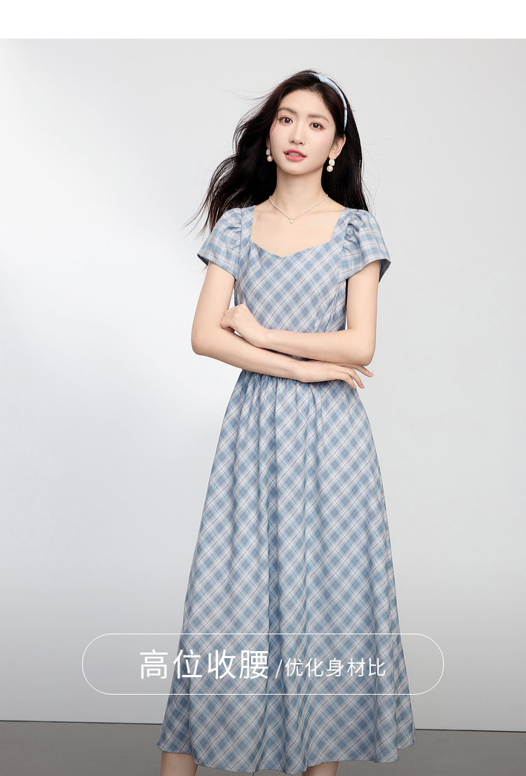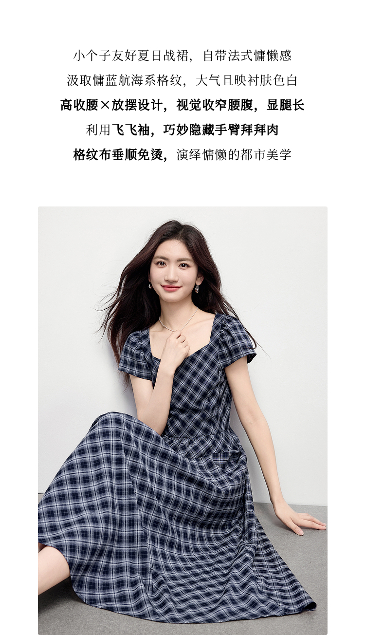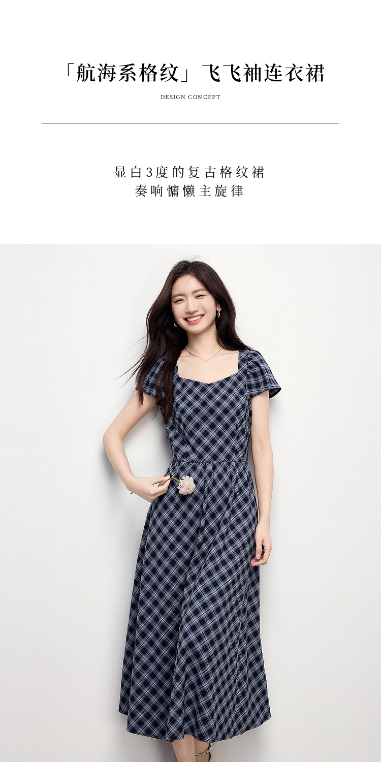 熙世界航海系法式复古格纹连衣裙女夏季飞飞袖方领裙子2025年新款