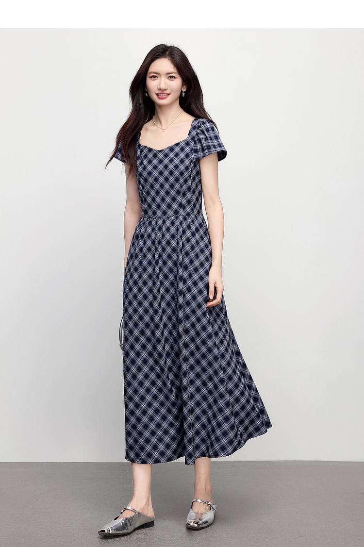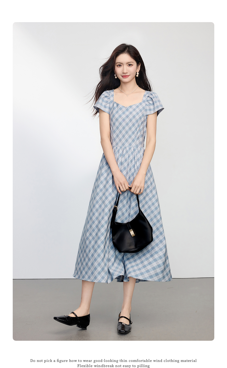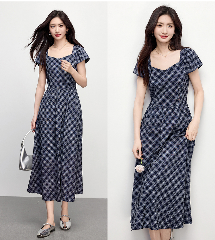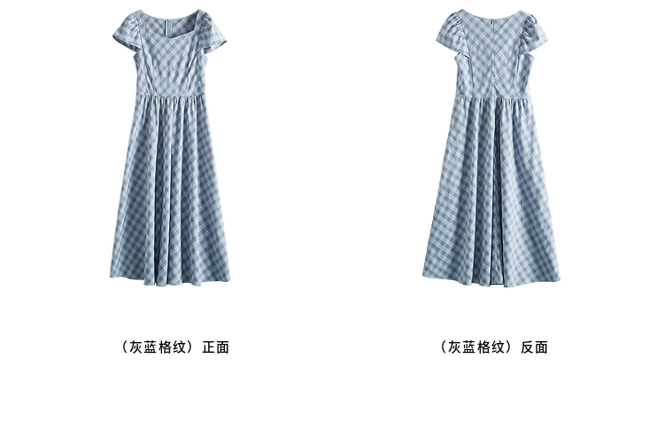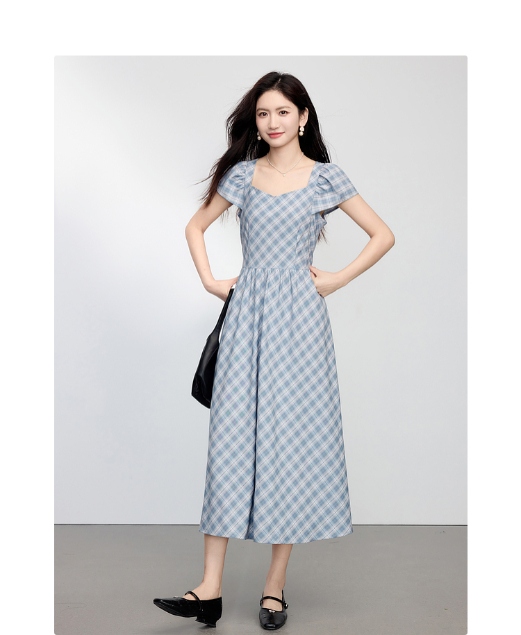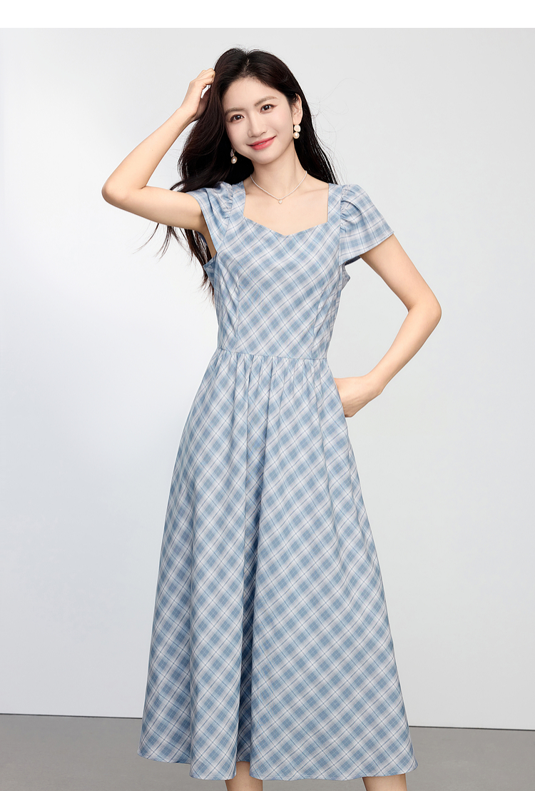熙世界航海系法式复古格纹连衣裙女夏季飞飞袖方领裙子2025年新款