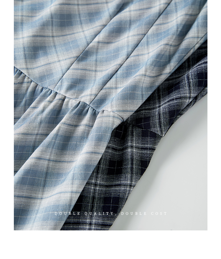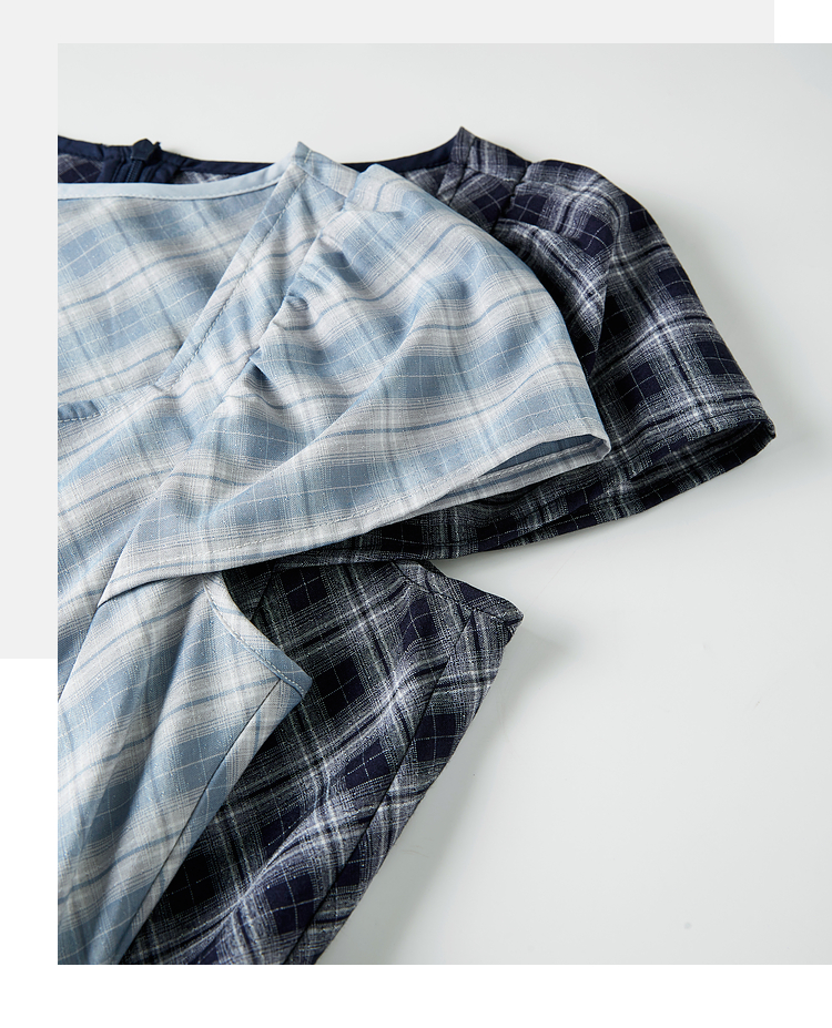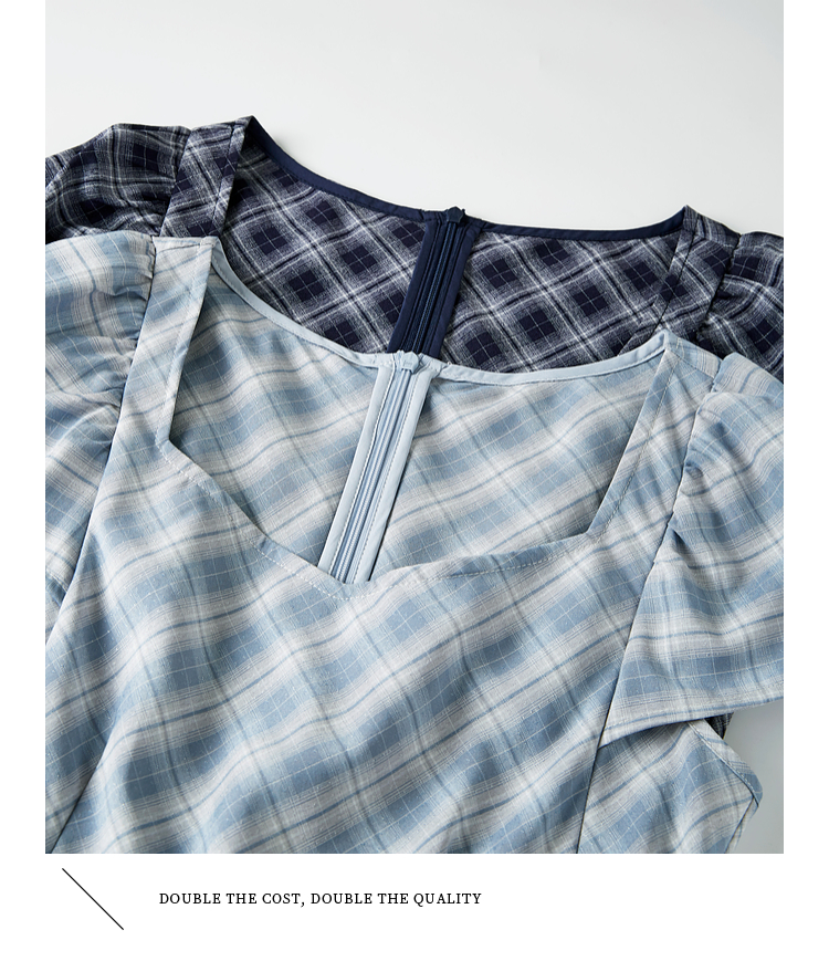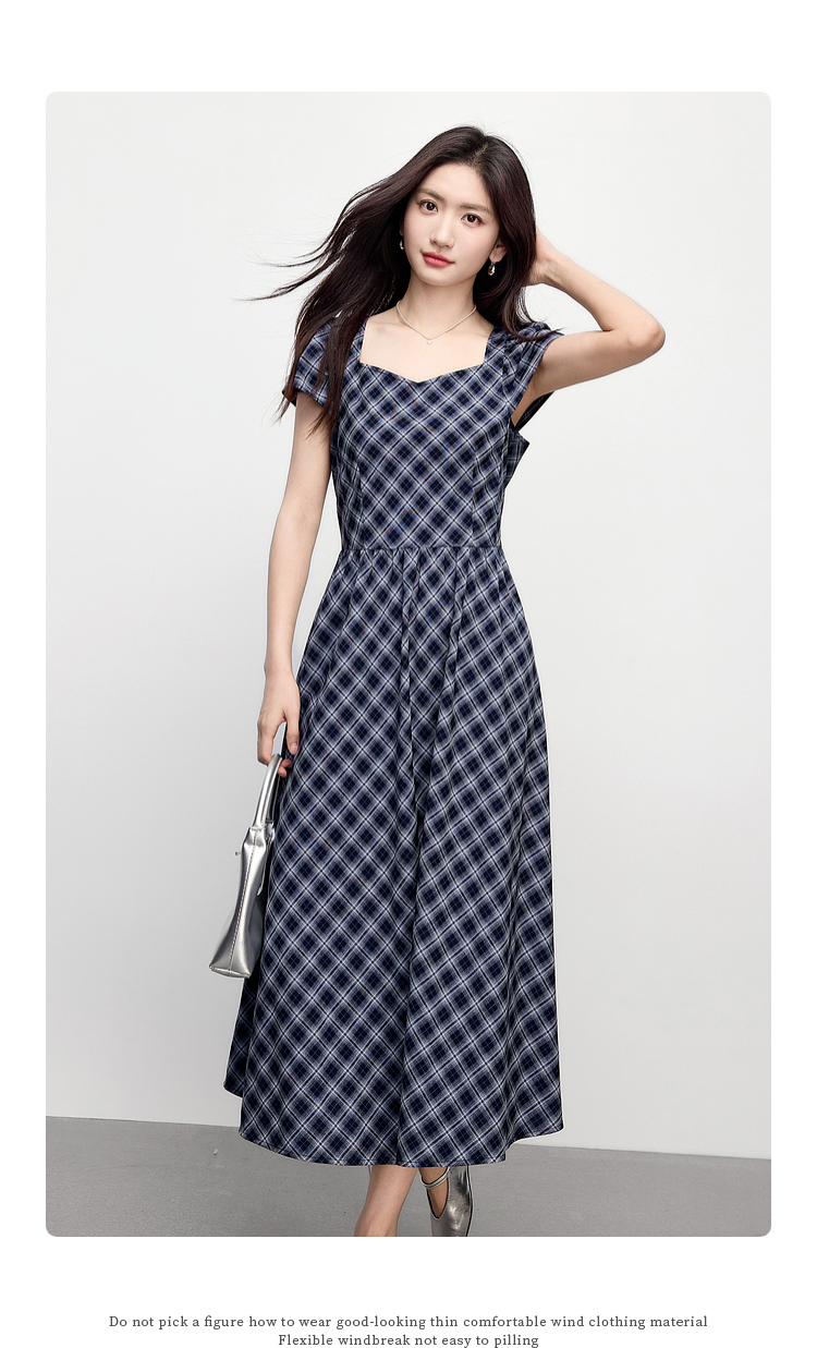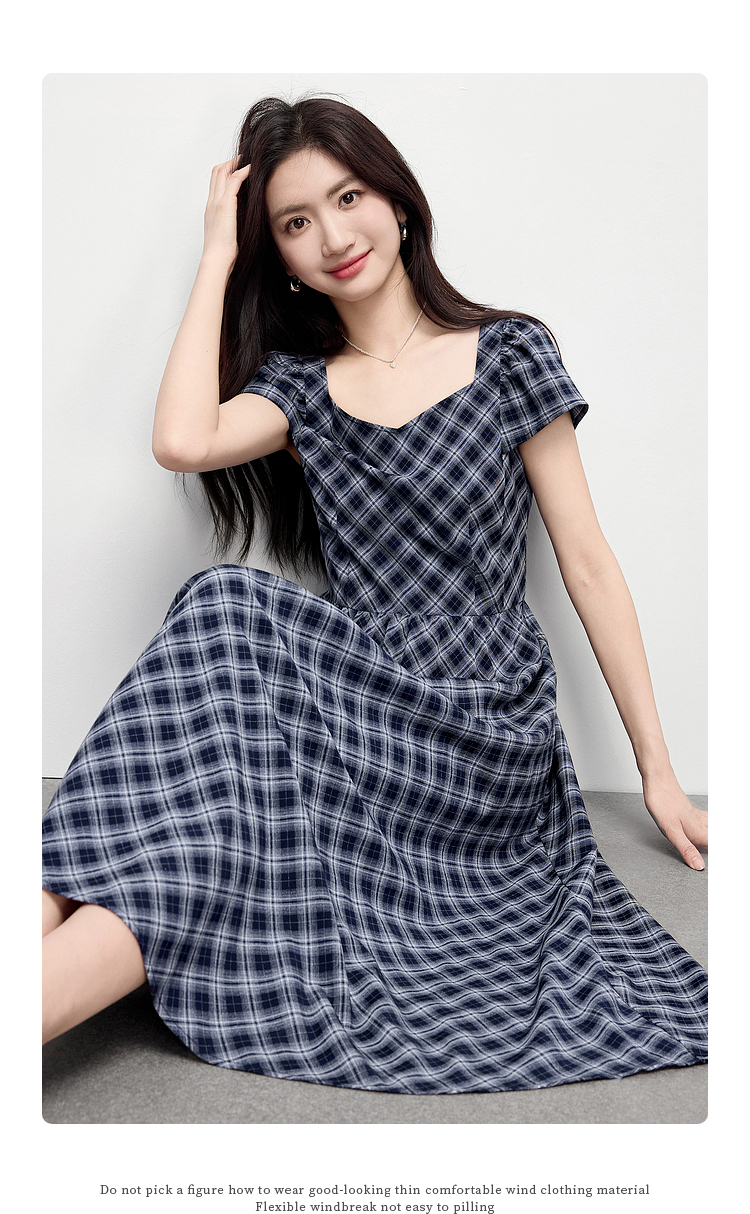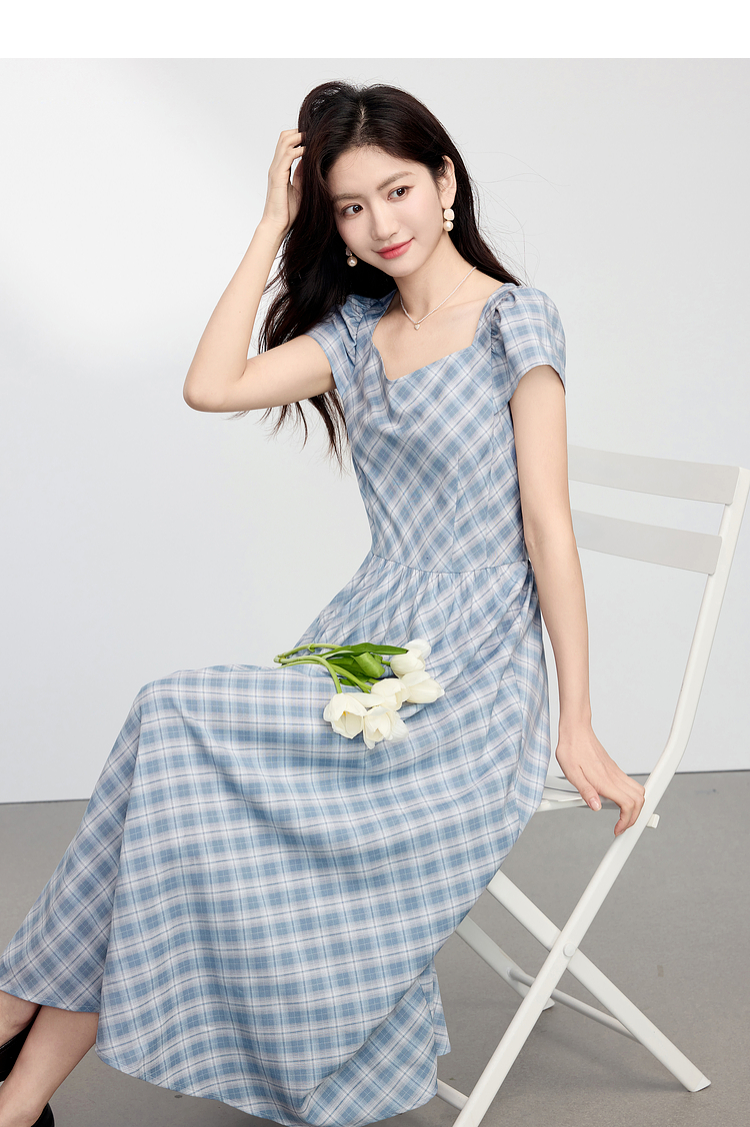 熙世界航海系法式复古格纹连衣裙女夏季飞飞袖方领裙子2025年新款