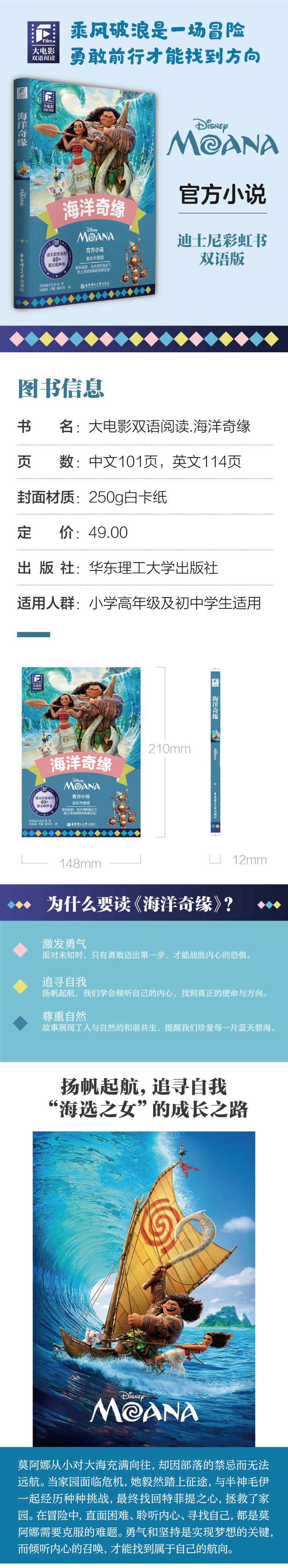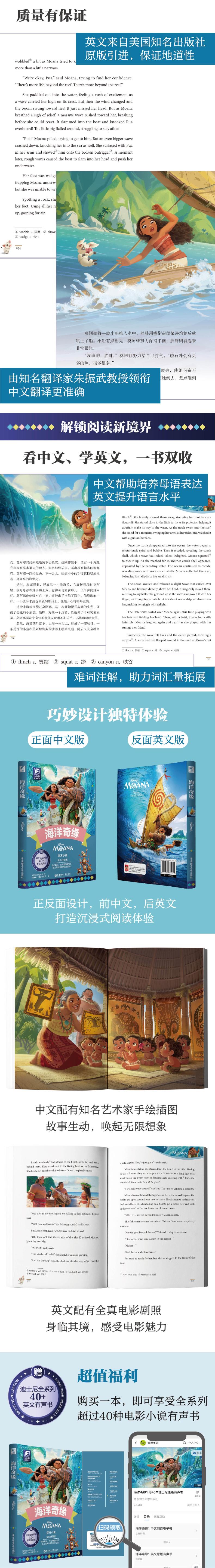 我们总是在讲或者听很多大道理,但迪士尼总能把你当个孩子,用通俗易懂的语言、用容易让人接受的方式戳中你内心的柔软,给你带来思考和感动!本书为《海洋奇缘》同名双语小说,故事发生在2000年前,讲述了出身航海世家的莫阿娜为了找寻传说中的岛屿,与半神毛伊一起踏上未知征途的故事。本书正面翻开中文故事,背面翻开英文故事,配有大量全彩剧照和手绘插图,打造沉浸式阅读体验;英文地道,来自美国兰登书屋,译文由朱振武教授领衔翻译,确保高水准文字质量。此外,本书还超值附赠40本迪士尼英文有声书,方便读者磨耳朵!