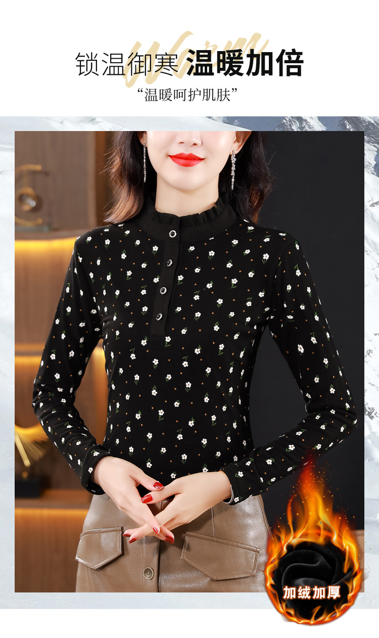 网纱印花长袖打底衫,加绒加厚洋气内搭T恤修身上衣KQL-765G960