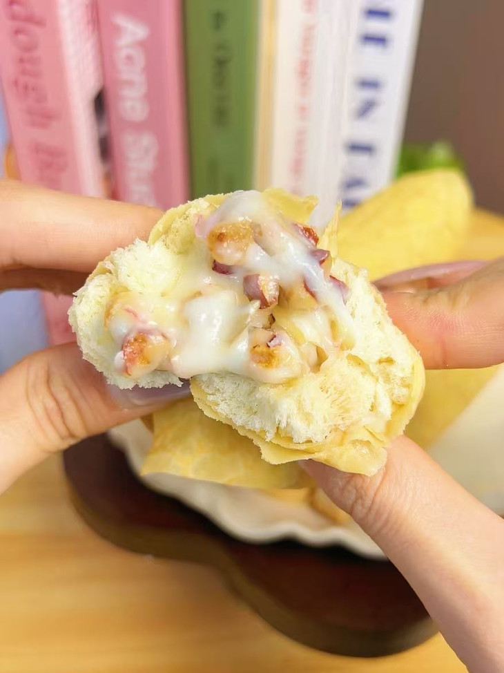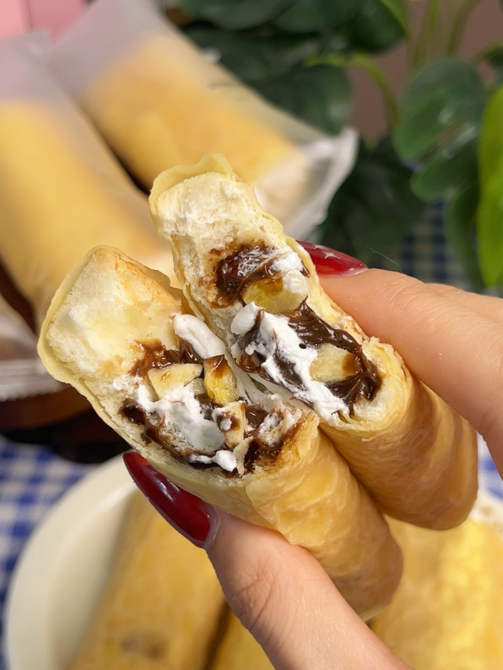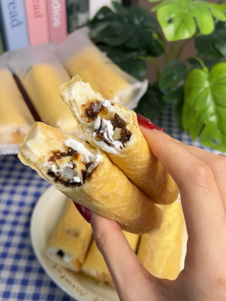 外皮软乎乎像云朵一样☁轻轻一咬就化开 内里裹着绵密丝滑的榛子巧克力酱 浓而不齁,顺滑不腻 还能嚼到清甜软糯的香蕉碎 软嫩中带着果香颗粒感 一口三重口感,层次超绝!